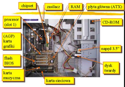 Wnętrze każdego komputera wygląda podobnie, tzn. składa się z typowej grupy elementów. Przede wszystkim mamy tu płytę główna, procesor, napęd dyskietek, zasilacz i moduły pamięci. Większość składników jest instalowana na płycie głównej według określonych standardów, skąd bierze się tak wiele możliwości wymiany poszczególnych komponentów. Niemal każdy komputer można rozbudować i wzbogacić dodatkowymi urządzeniami.