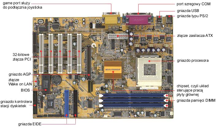 Płyta główna ma postać dużej płytki drukowanej. Na stałe za montowane są na niej: chipset, kości pamięci zawierające BIOS, bateria oraz różne gniazda i złącza. Gniazda służą do instalowania PS/2), dwa USB, dwa szeregowe i jedno równoległe. Jeśli na płycie za montowany jest układ dźwiękowy, dochodzą jeszcze złącza charakterystyczne dla pamięci masowych i kabel z zasilaniem. Procesor w płytach ATX jest ulokowany obok zasilacza, który ma od jego strony wiatrak. Pierwotnie miało to pozwolić na zrezygnowanie z dodatkowych systemów chłodzenia, ale szybki wzrost prędkości procesorów i tym samym osiąganych przez nie temperatur spowodował, że takie chłodzenie jest niewystarczające (stosuje się dodatkowo wiatraki montowane bezpośrednio na procesorze). Płytę ATX przedziela na pół gniazdo AGP do osadzenia graficznej. Po drugiej stronie płyty znajdują się gniazda PCI dla różnych kart rozszerzeń. Czasami są to także starsze gniazda ISA. Z reguły na płycie ATX jest ich łącznie siedem, ale pojawiły się także nieco węższe płyty zwane MicroATX ze zredukowaną liczbą gniazd. Alternatywą dla ATX miał się stać standard NLX, ale dotąd nie zdobył większej popularności. W płycie NLX gniazda na karty rozszerzające zostały umieszczone na specjalnej karcie gniazd. Karty rozszerzające montuje się, więc równolegle do płyty głównej, dzięki czemu całość zajmuje mniej miejsca. Pozwala to wykorzystywać chudsze obudowy. Nowością jest standard FlexATX. Płytę taką całkowicie pozbawiono gniazd, gdyż wszystkie podstawowe układy są z nią zintegrowane. Dzięki temu jest ona bardzo mała, co pozwala producentom na dużą swobodę przy projektowaniu kształtu obudowy komputera. Płyta ta ma być wykorzystywana w tanich konstrukcjach do domu lub biura, jej wadą jest jednak brak możliwości rozbudowy. Najważniejszym elementem płyty głównej jest zestaw układów sterujących, nazywany chipsetem. Składa się on z dwóch lub trzech kości, ale zawartych jest w nim wiele podukładów, występujących w pierwszych płytach osobno. Chipset zarządza obiegiem informacji w komputerze, łącząc procesor z pozostałymi komponentami. Jego parametry wyznaczają m.in. typ i liczbę obsługiwanych procesorów, typ i maksymalną wielkość pamięci, rodzaj gniazd i złączy, a także szybkość przesyłu danych pomiędzy poszczególnymi komponentami. Jeśli więc chipset nie obsługuje jakiegoś rozwiązania, nie będzie można z niego skorzystać lub będzie ono pracowało z niższą prędkością. Z reguły nowy chipset pojawia się wraz z kolejnym modelem procesora. Przez ostatnie lata dominującą pozycję na rynku chipsetów zajmował Intel, ale wraz ze wzrostem popularności procesorów AMD wzmocniła się także pozycja wcześniej niszowych producentów, takich jak VIA, SiS czy ALI.
