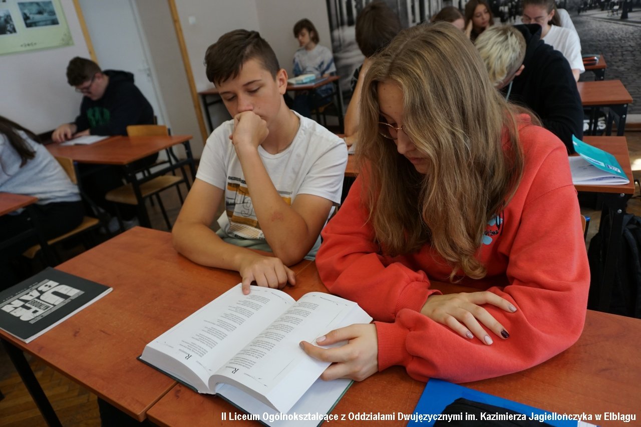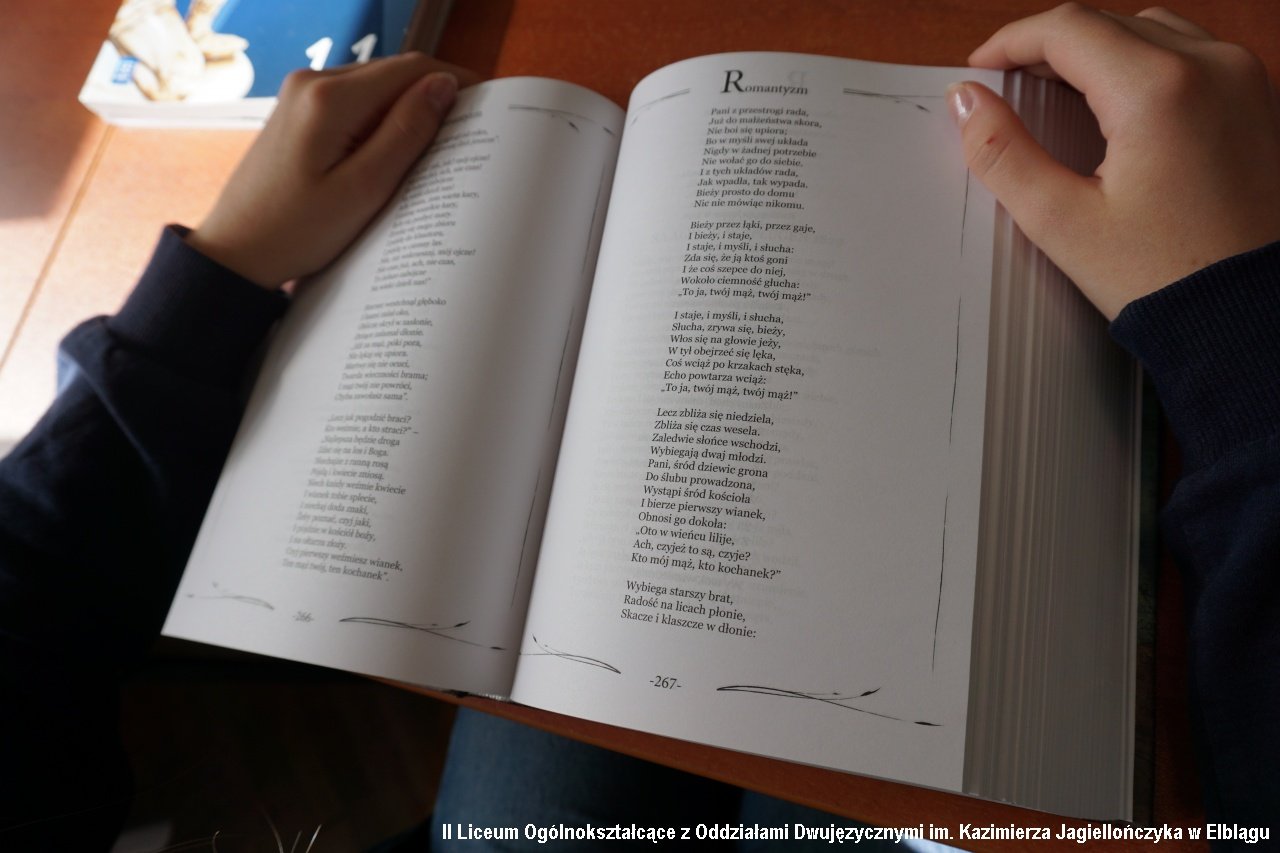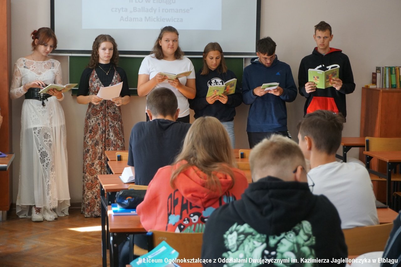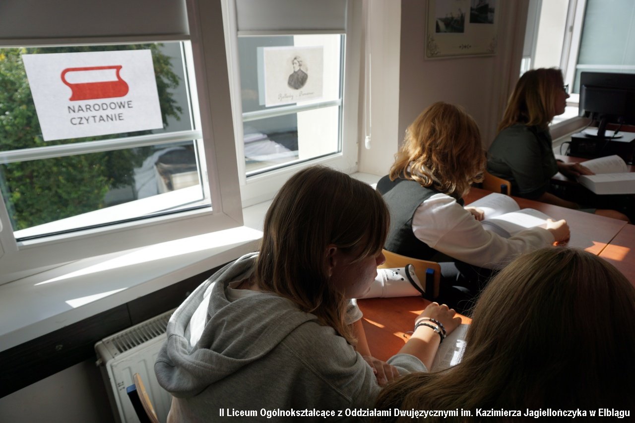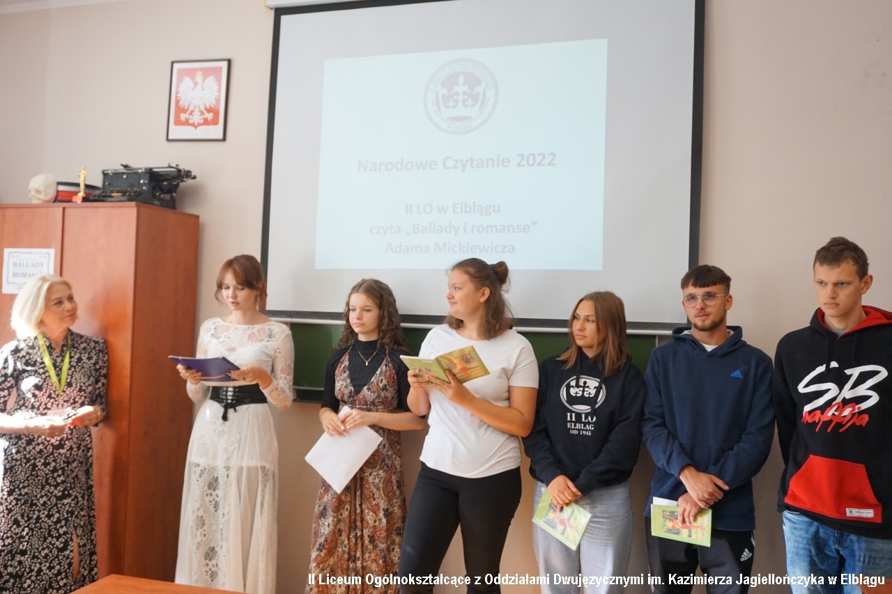 Akcja Narodowego Czytania organizowana jest przez Prezydenta RP od 2012 roku. Od tego też roku II LO bierze czynnie w niej udział. Wspólnie czytaliśmy już lekturę Pana Tadeusza Adama Mickiewicza, potem dzieło Aleksandra Fredry, a podczas następnych edycji przeczytaliśmy kolejno: Trylogię Henryka Sienkiewicza oraz Lalkę Bolesława Prusa. Czytaliśmy w różnych miejscach i dla różnej publiczności. Były to np. ogródki kawiarniane na starówce, dom opieki osób starszych w Tolkmicku. W tym roku w rolę lektorów wcielili się członkowie Samorządu Uczniowskiego, którzy 5 września 2022r. na godzinie wychowawczej odwiedzili klasę Ig, by zaprezentować wybrane ballady Adama Mickiewicza: „Lilie”, „Świteziankę” oraz „Romantyczność”.