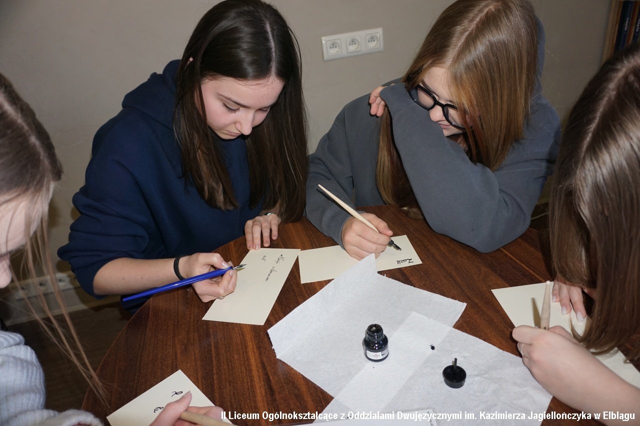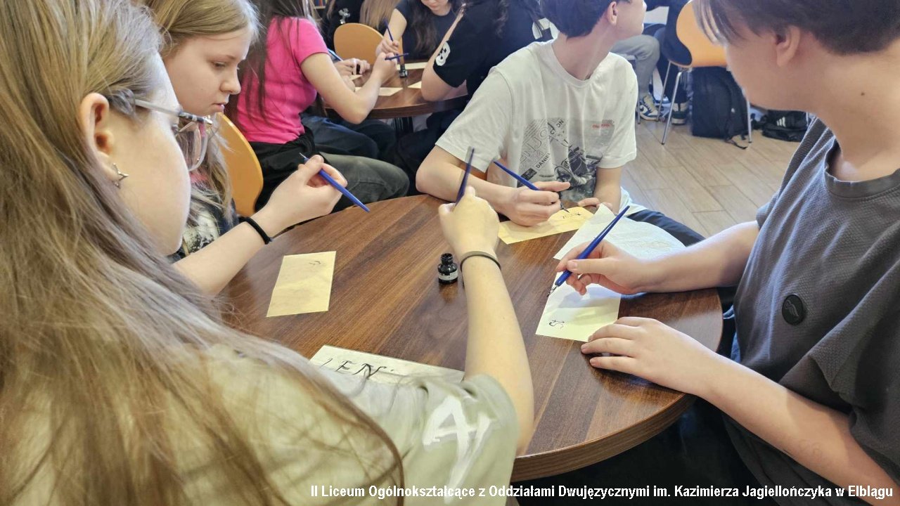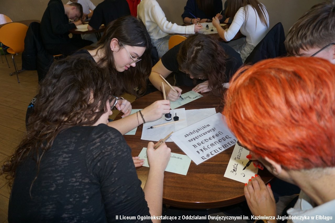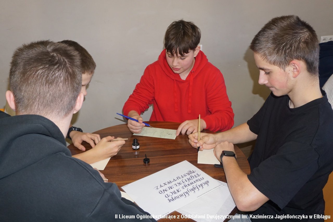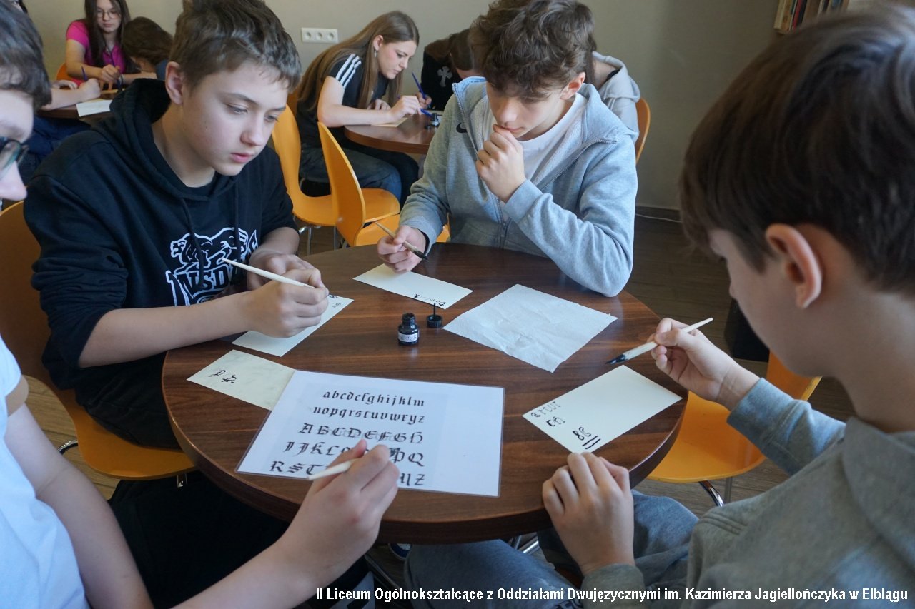 W kolejnej części - warsztatowej – przeprowadzone zostały wprawki pisma kaligraficznego przy użyciu technicznych narzędzi pisarskich, a na na samym końcu spotkania zorganizowana została z części konkursowa , czyli rozwiązanie internetowego quizu.