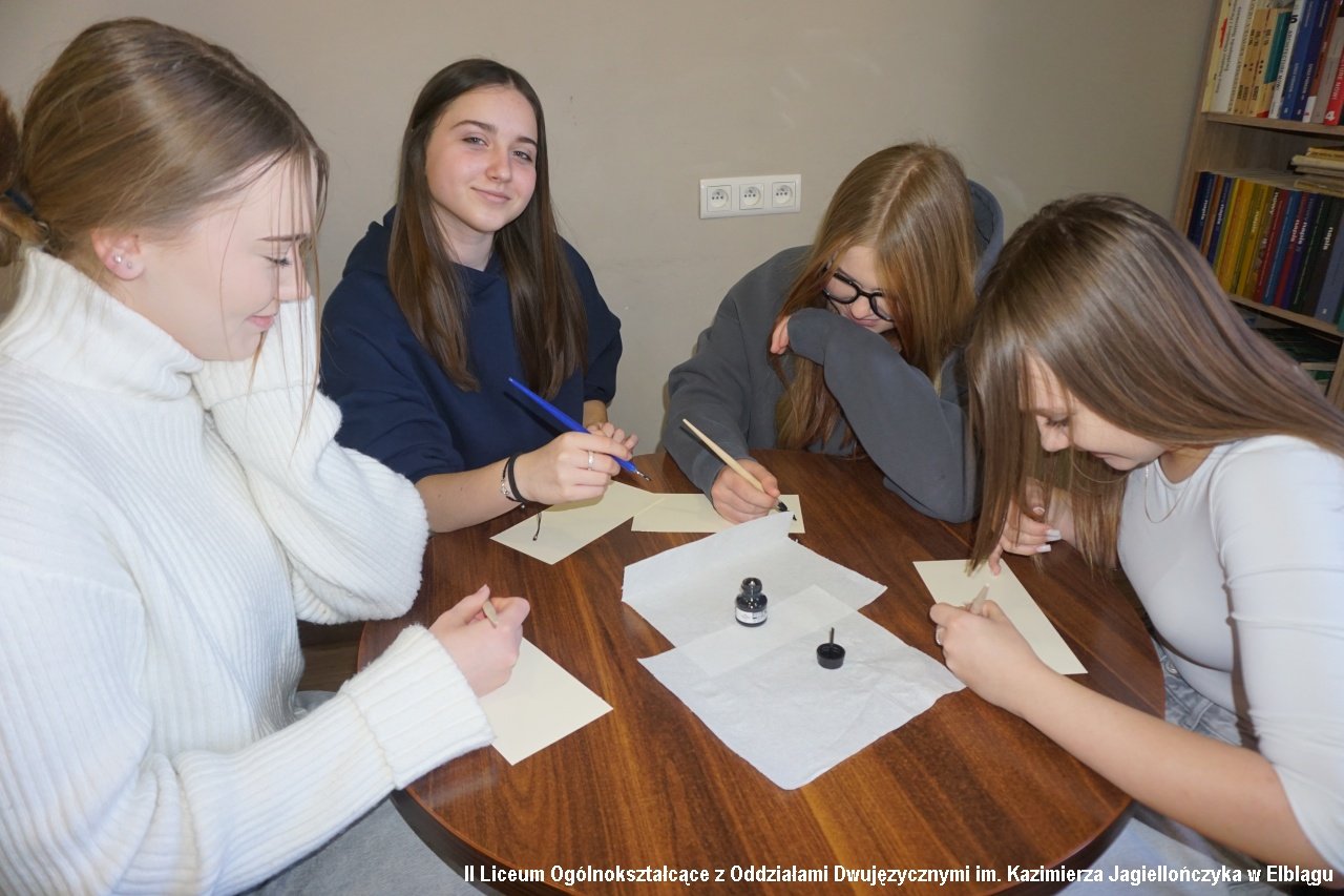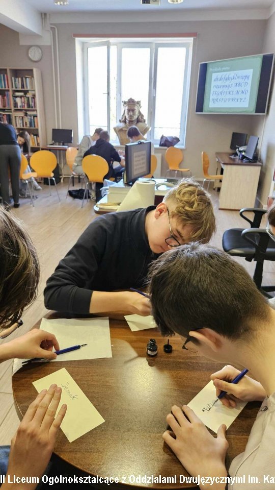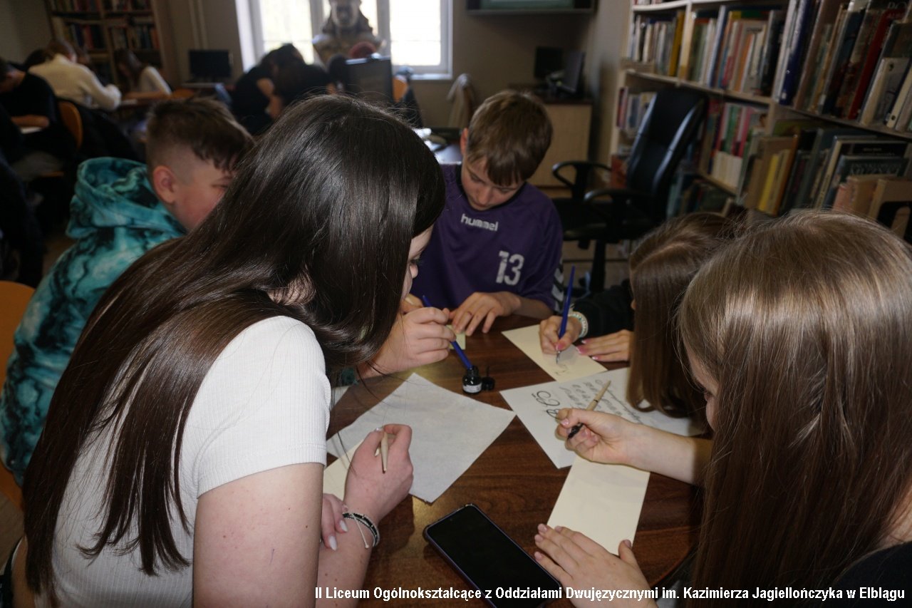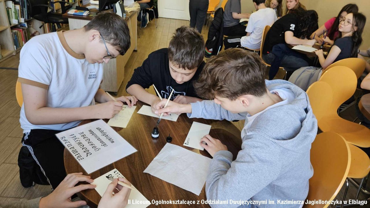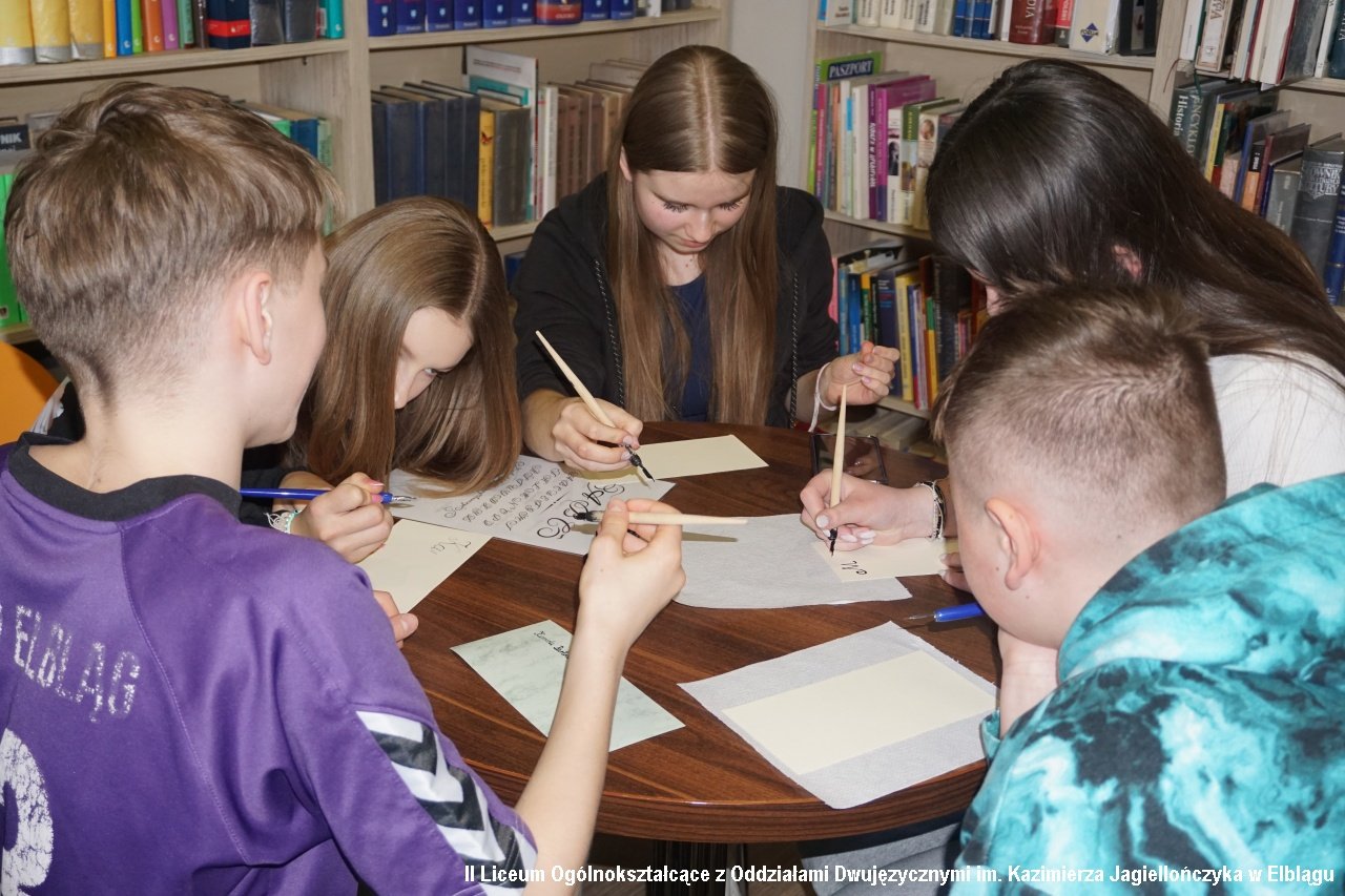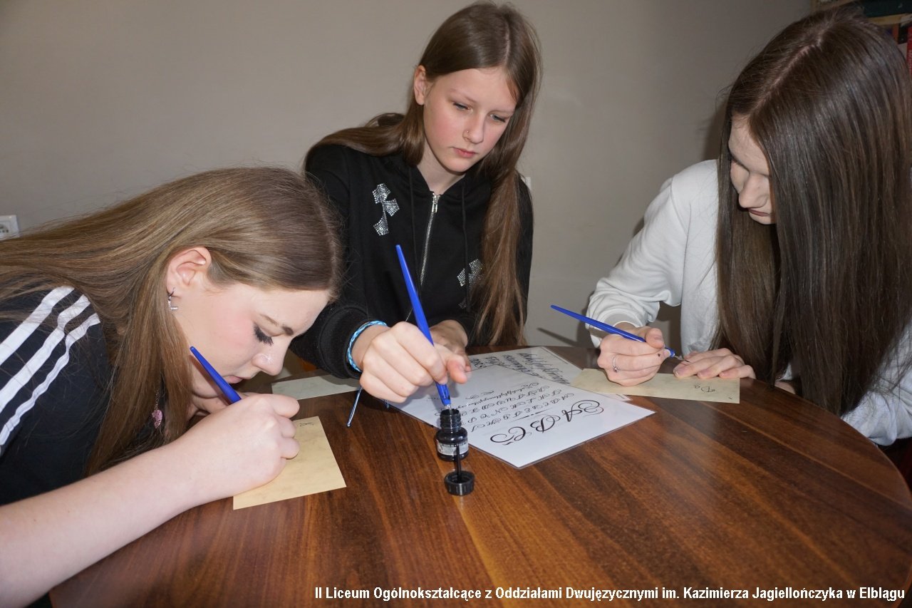 W kolejnej części - warsztatowej – przeprowadzone zostały wprawki pisma kaligraficznego przy użyciu technicznych narzędzi pisarskich, a na na samym końcu spotkania zorganizowana została z części konkursowa , czyli rozwiązanie internetowego quizu.