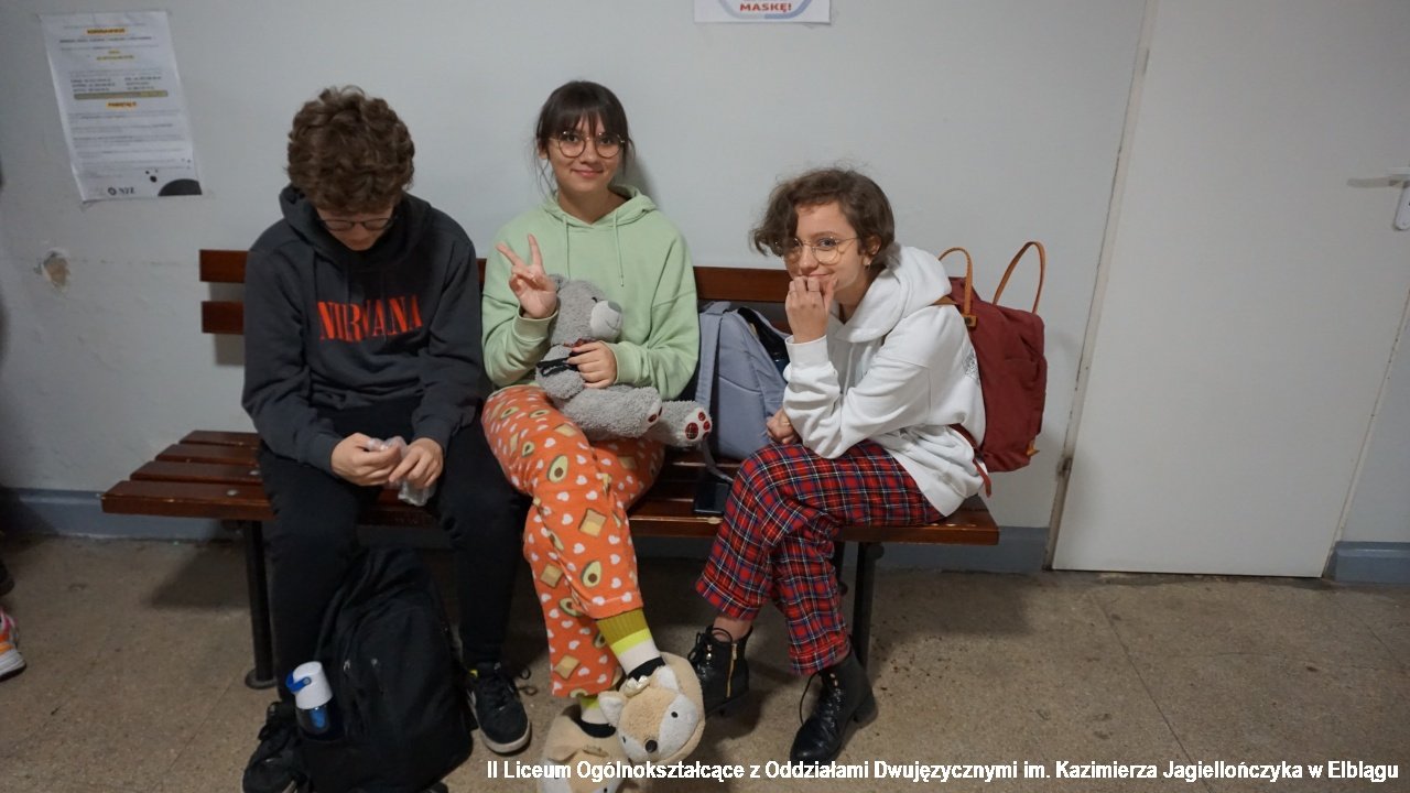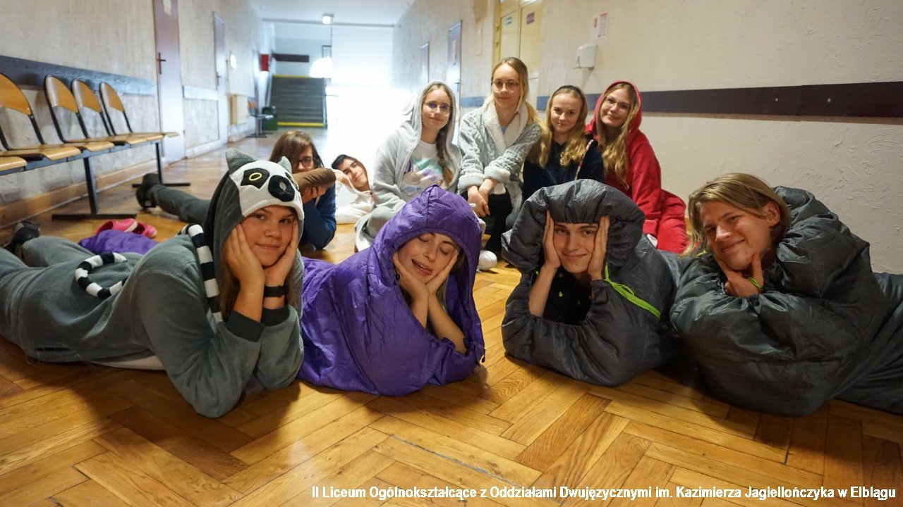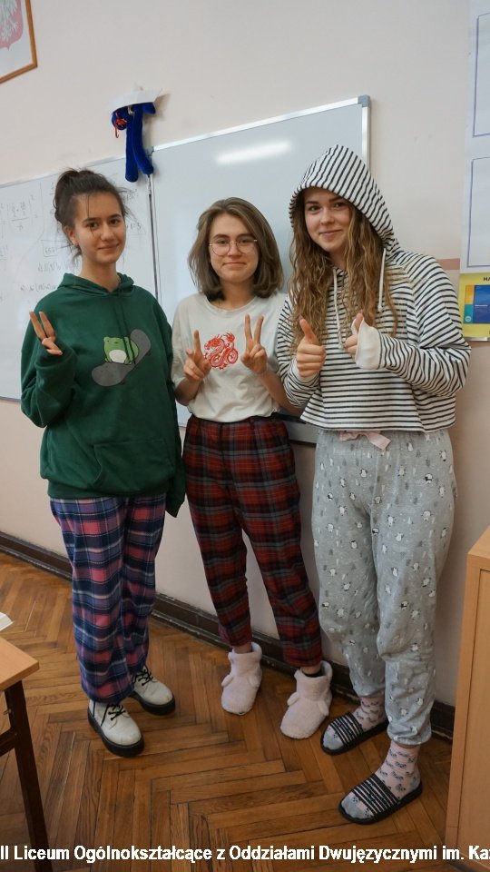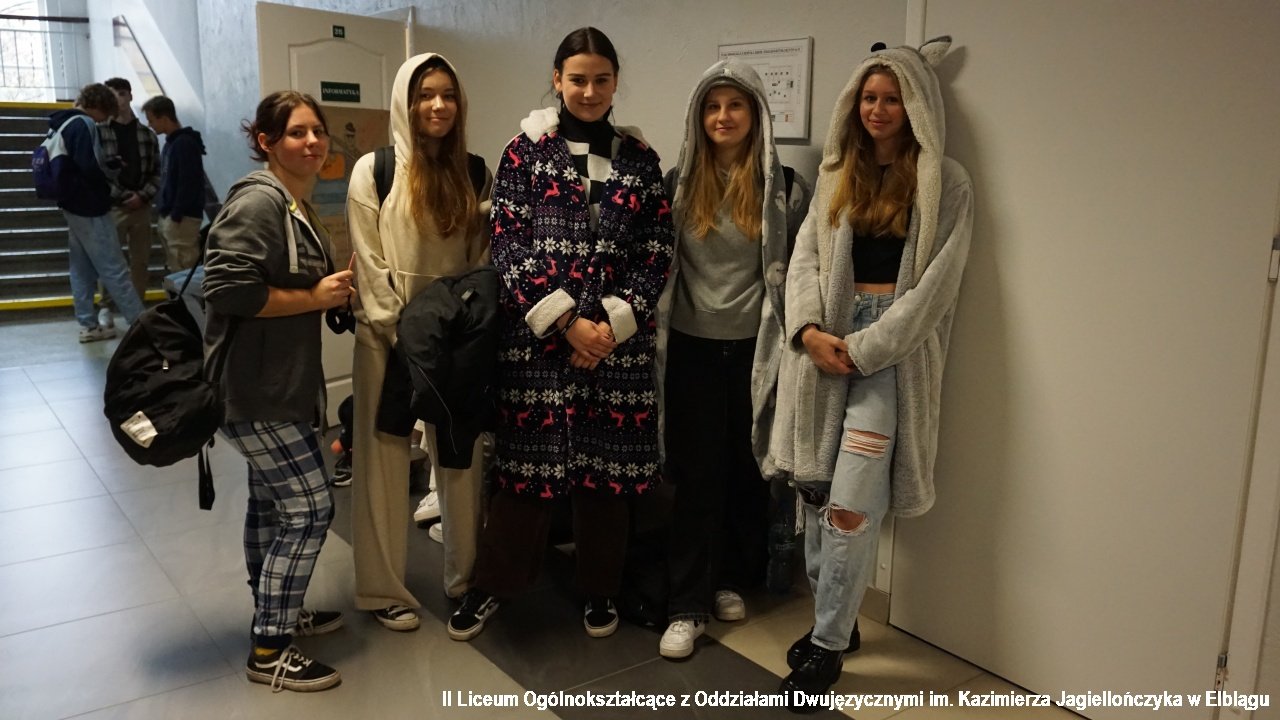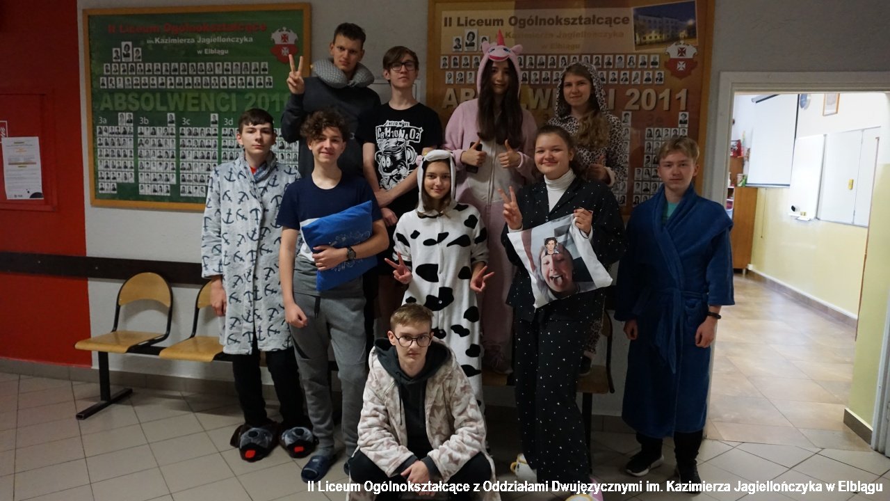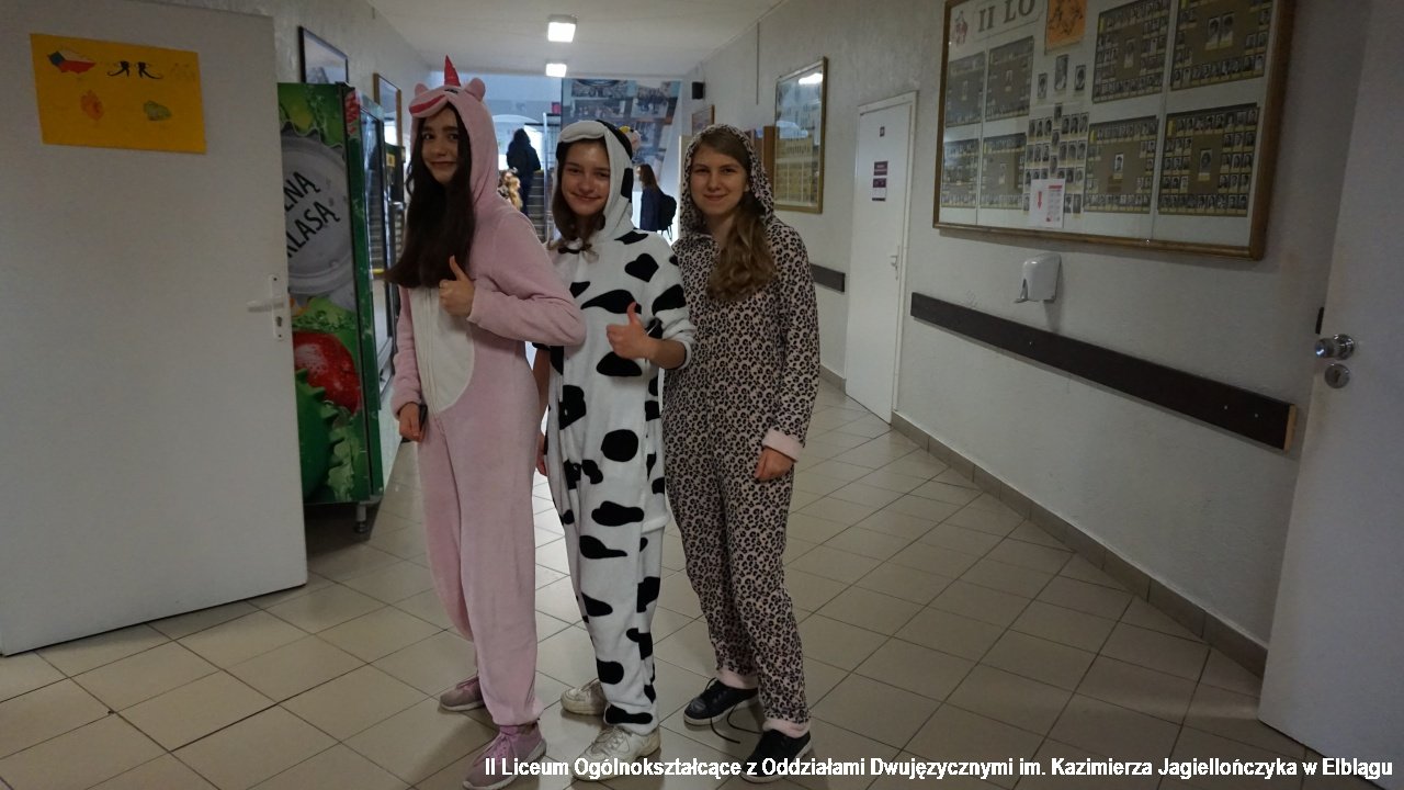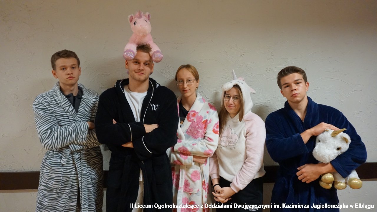 Przebrania były wyborne. Flanelowe piżamki, kolorowe szlafroczki, rozmaite dresiki, pajacyki lub inne odzienia nocno-łóżkowe. Najbardziej jednak spodobały się nam kapciuszki i „laczuszki” domowe. Wśród szkolnych śpiochów byli i tacy, co zabrali ze sobą całe łóżka. Ha, ha. Klasa IIIE przyniosła ze sobą nawet śpiwory. Gratulujemy pomysłu!