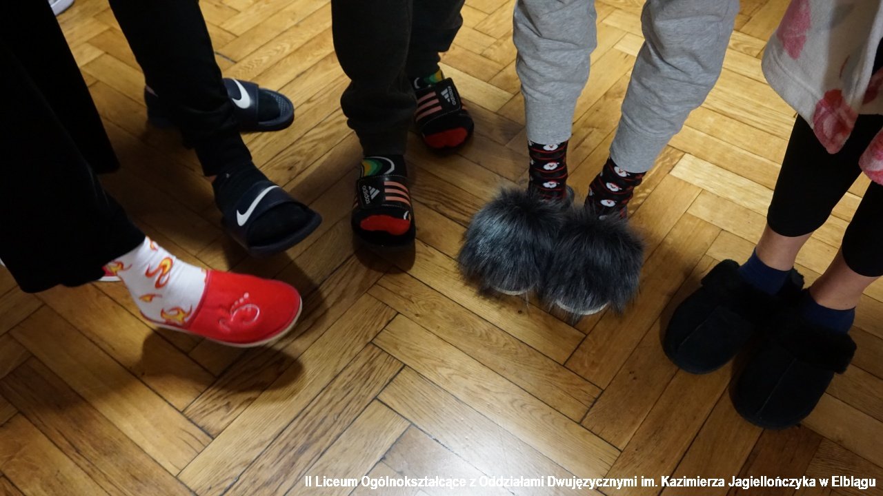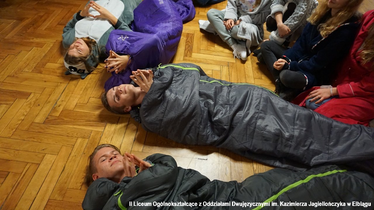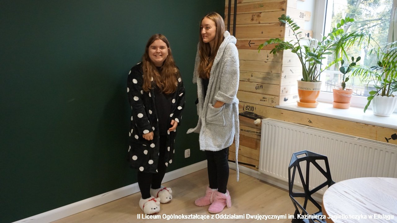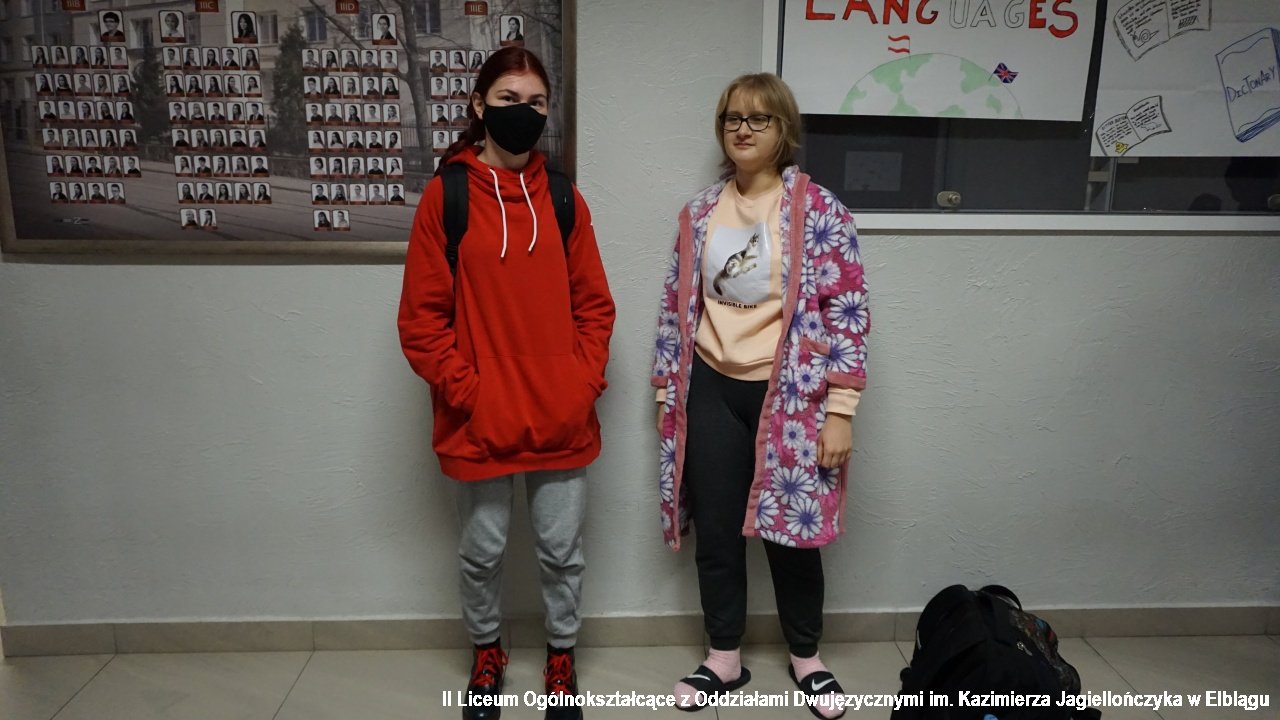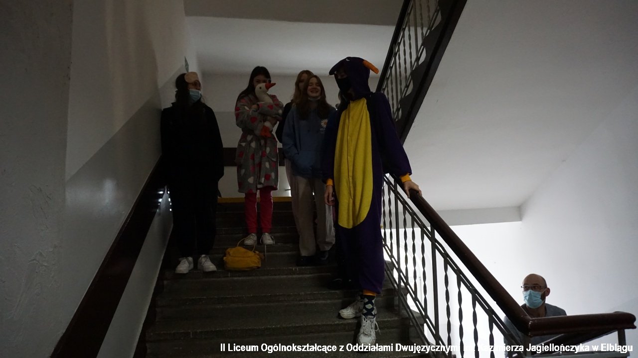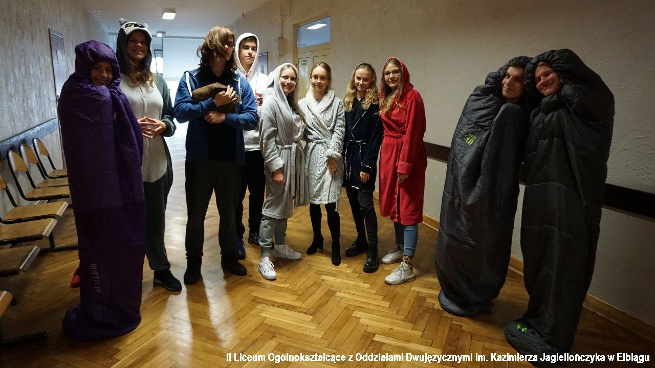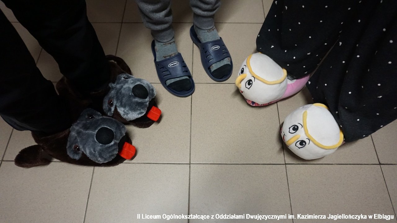 Przebrania były wyborne. Flanelowe piżamki, kolorowe szlafroczki, rozmaite dresiki, pajacyki lub inne odzienia nocno-łóżkowe. Najbardziej jednak spodobały się nam kapciuszki i „laczuszki” domowe. Wśród szkolnych śpiochów byli i tacy, co zabrali ze sobą całe łóżka. Ha, ha. Klasa IIIE przyniosła ze sobą nawet śpiwory. Gratulujemy pomysłu!