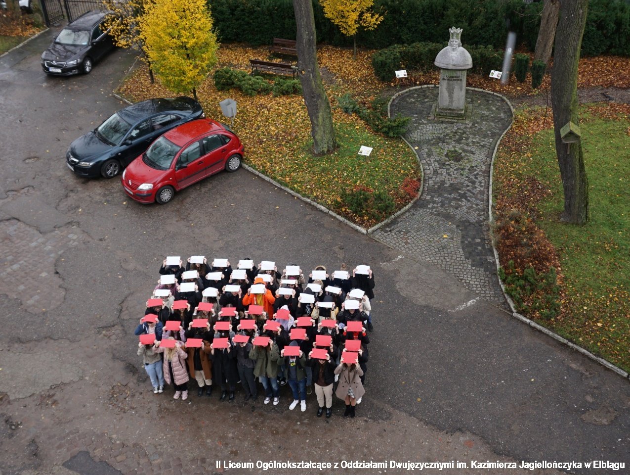 Nie ukrywamy, że pogoda nie rozpieszczała podczas realizacji happeningu. Deszczyk cały czas mżył, ale to nie przeszkodziło wykonać „żywą” biało-czerwoną flagę.