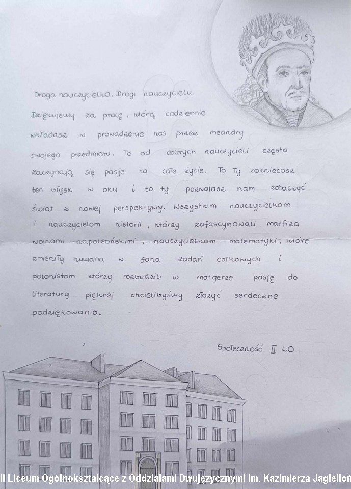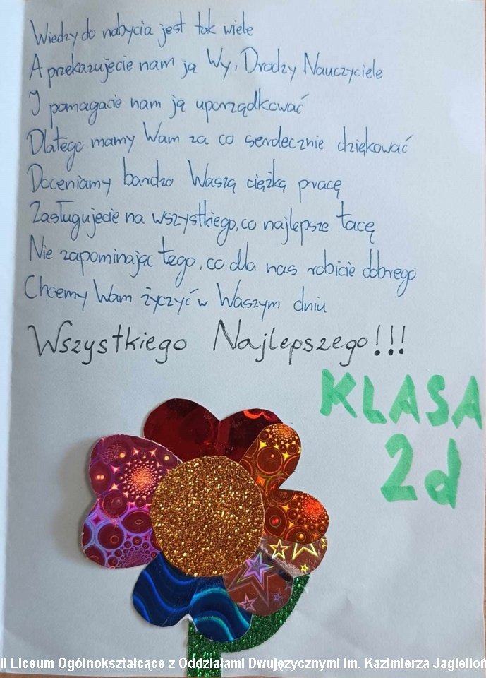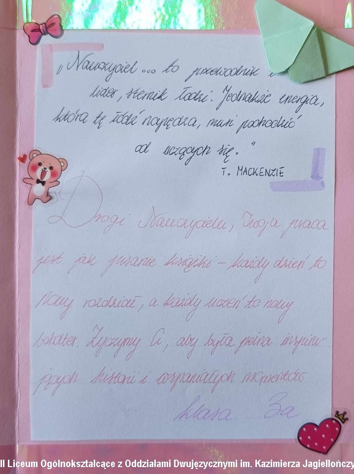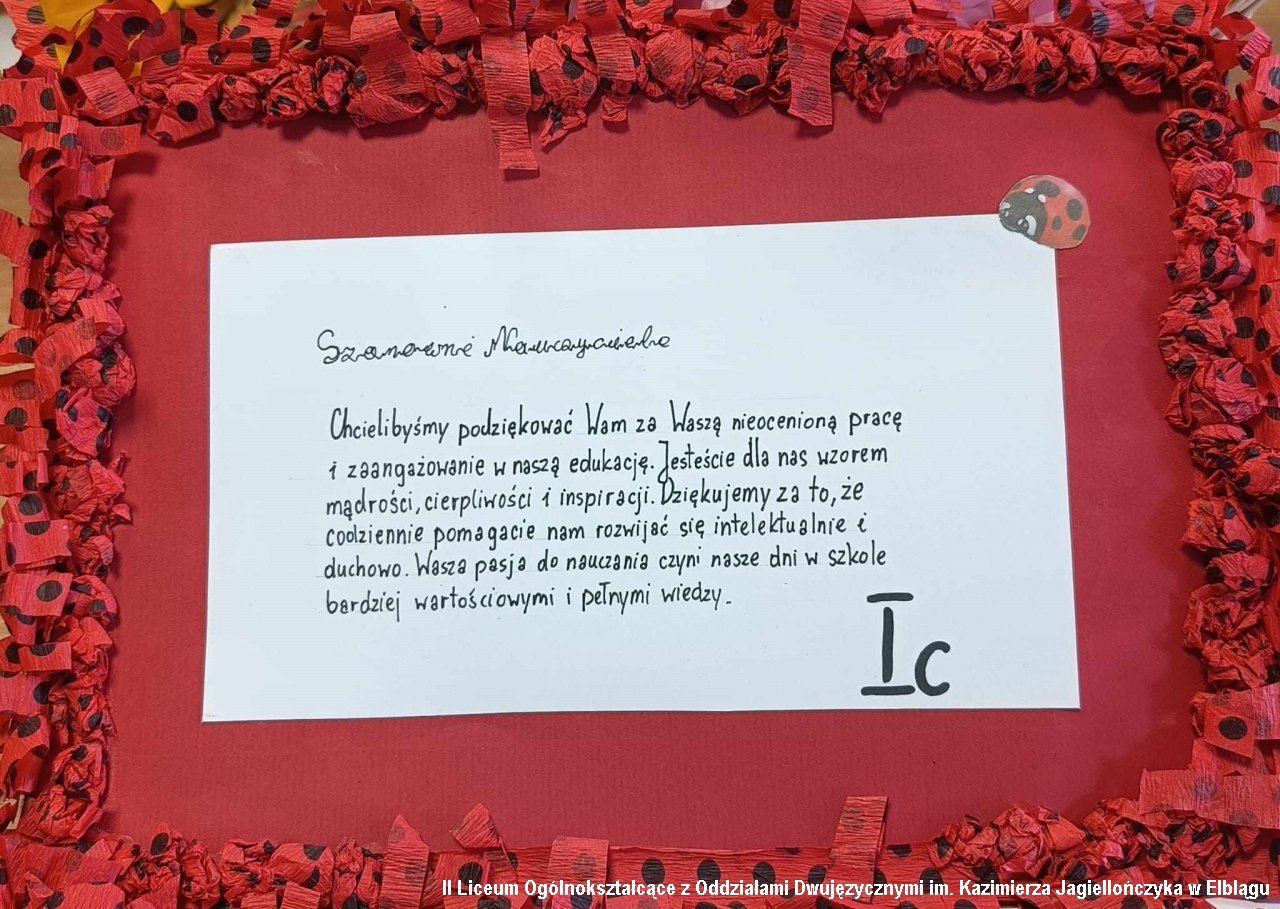 Dziękujemy Maksowi Zawadce 1F za obsługę informatyczną, czas poświęcony i dyspozycyjność, Oli Kania 1F i Agacie Wiśniewskiej 1C za oprawę graficzną plakat i dekoracje, klasie 1C, 1F i 2C za pomysły i pomoc w organizacji i dekoracjach, Marceli Bonk i Igorowi Gutkowskiemu 1C za świetne prowadzenie i wszystkim życzliwym tej imprezie miedzy innymi Pani Wiolecie Owsiana i Pani Edycie Andruszewskiej. Niech ta życzliwość i dobroć pozostanie w Naszych Sercach na co dzień. To jest święto miłości a ta niejedno ma imię i różne oblicza, więc zachęcamy wszystkich do jej okazywania.