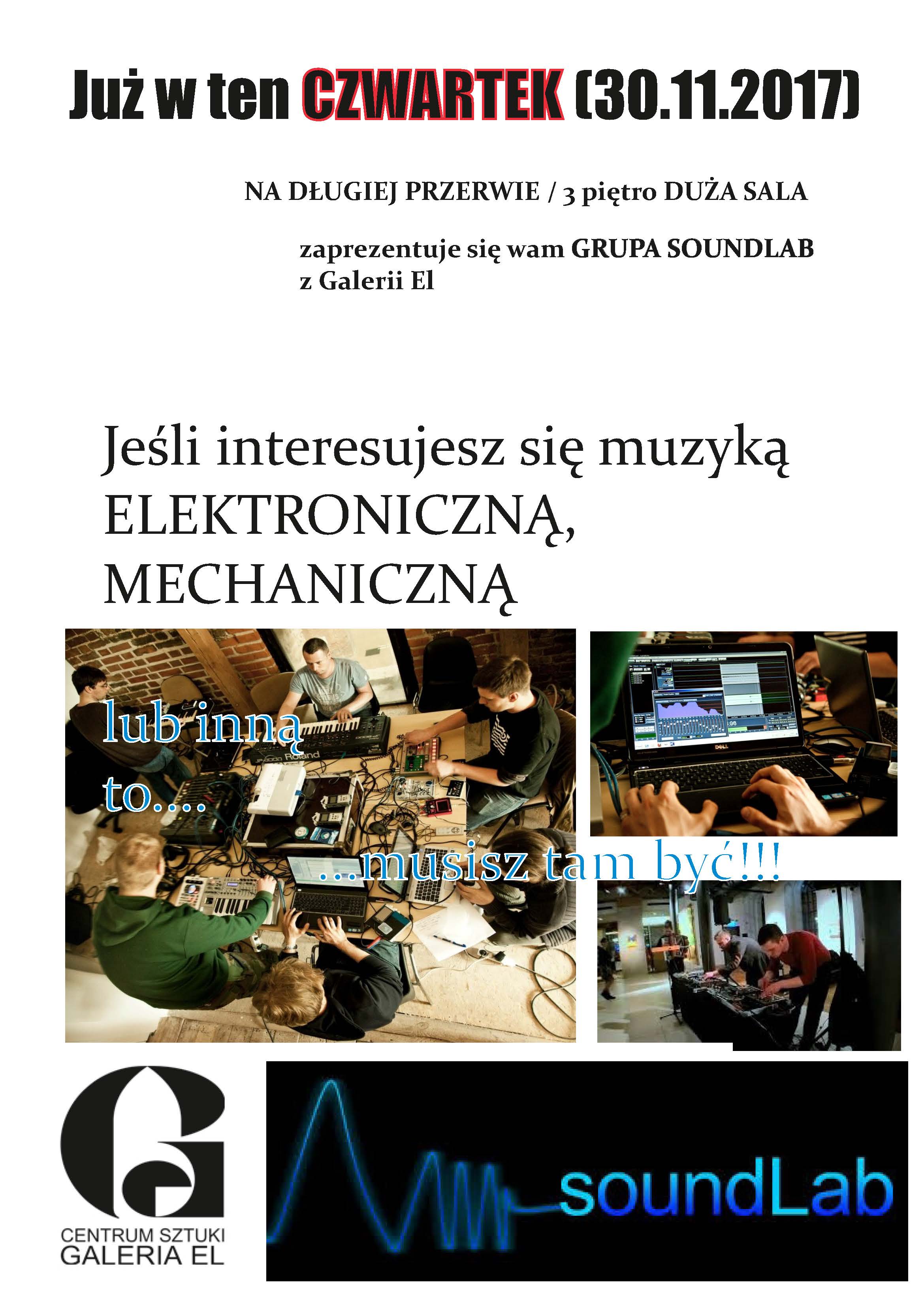 W czwartek (30.11.2017) na długiej przerwie w auli szkolnej zaprezentuje się przed nami GRUPA SOUNDLAB z Galerii El. Zapraszamy wszystkich zainterseowanych. Jeśli interesujesz się muzyką elektroniczną, mechaniczną koniecznie musisz tam być!
