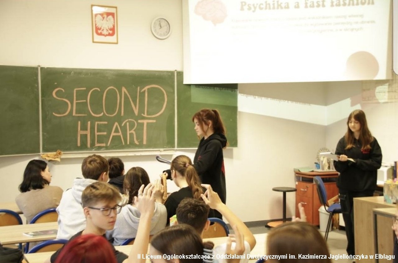 Projekt Second Heart ma ma na celu popularyzację edukacji na temat aspektów związanych z konsumpcjonizmem odzieżowym oraz szerzenie świadomości pro środowiskowej, szczególnie wśród młodzieży. Działamy w trzyosobowym zespole składającym się miedzy innymi z uczennic II Liceum Ogólnokształcącego ( Laura Van Ieperen, Ewelina Kłosińska, Maja Milewska) i poprzez edukację chcemy zademonstrować naszym beneficjentom, że małe zmiany mogą znacznie poprawić stan naszego środowiska.