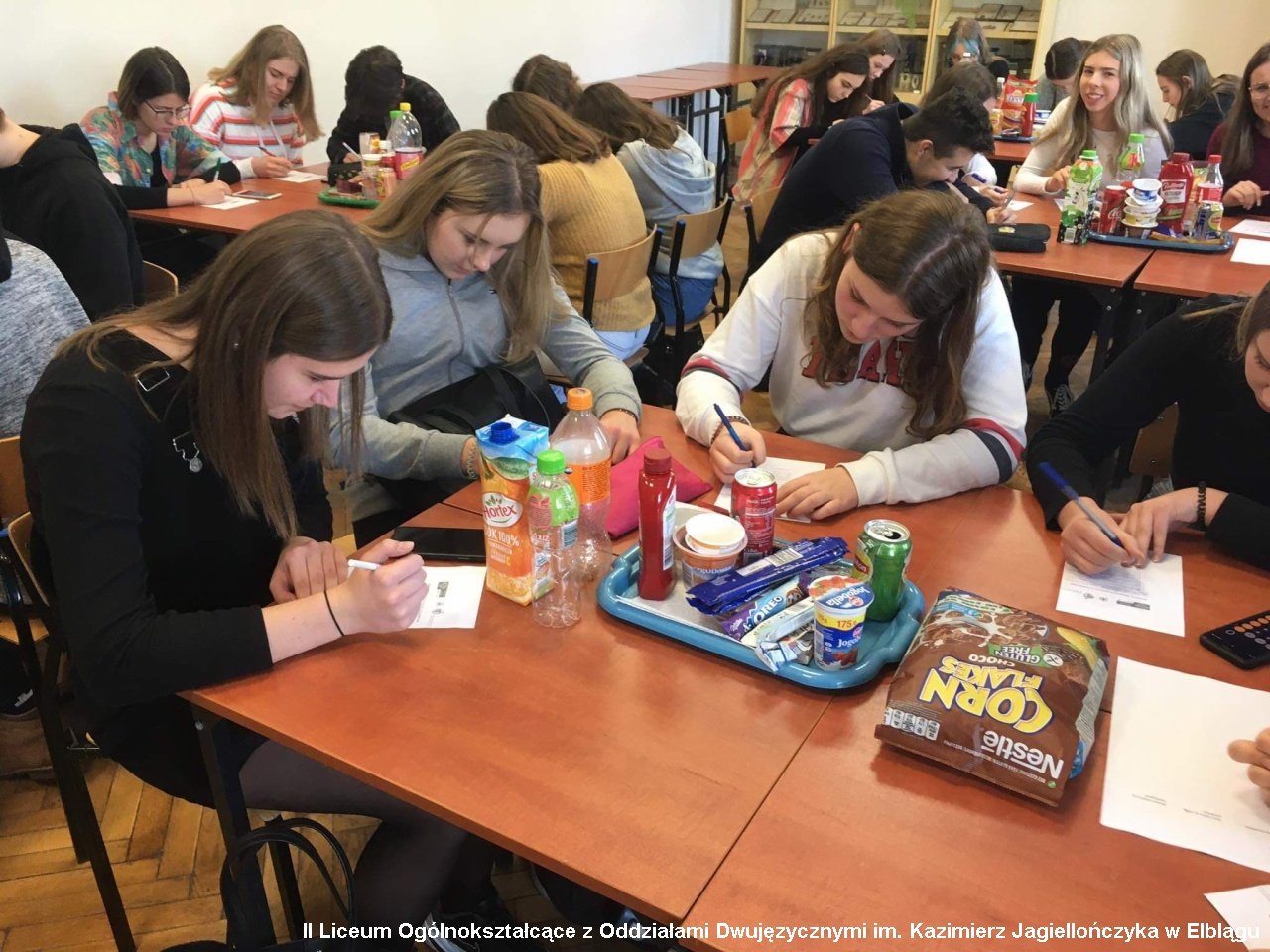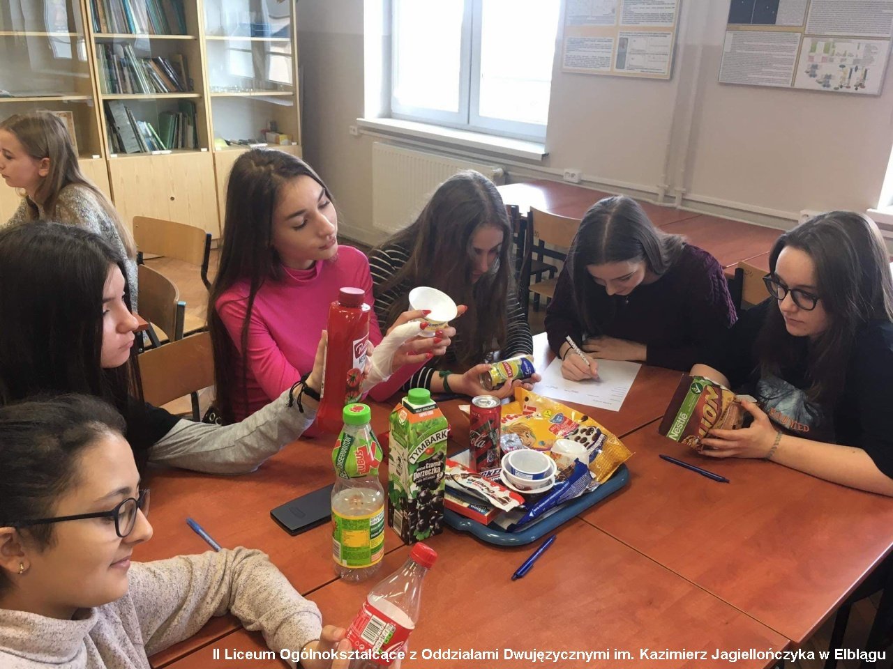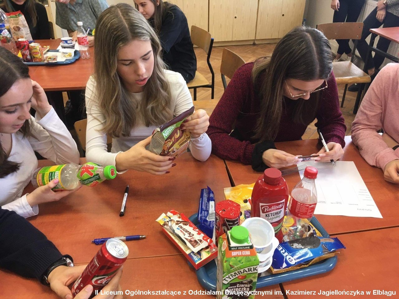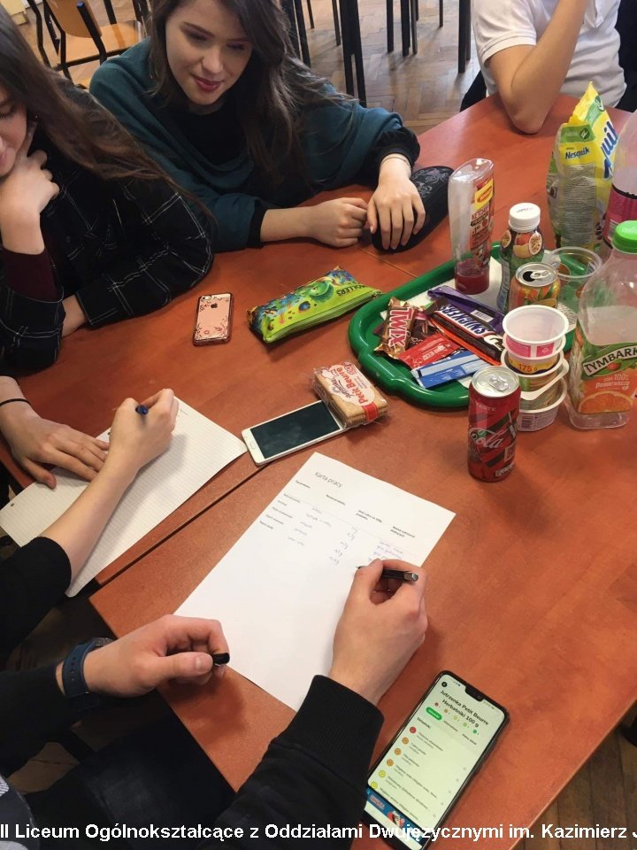 Na początku zajęć Uczniowie wypełnili ankiety dotyczące ich sposobu odżywiania, potem Ania przedstawiła przygotowaną przez siebie prezentację multimedialną na temat nadwagi, otyłości i cukru. Po tym wprowadzeniu odbyły się warsztaty, w trakcie których uczniowie pracując w grupach, rozszyfrowywali etykiety różnych produktów spożywczych, zwracając szczególną uwagę na ukryty w nich cukier. Wyniki swoich analiz zapisywali na kartach pracy, które posłużyły potem do burzliwych dyskusji na temat uczciwości producentów żywności. Pod koniec zajęć uczestnicy wzięli udział w internetowym quizie „Kahoot, dzięki któremu mogli zweryfikować swoją wiedzę, nabytą w trakcie warsztatów, a także dokonać ewaluacji tych zajęć, przed kolejną turą spotkań na temat cukru z klasami o profilu humanistycznym i matematycznym.