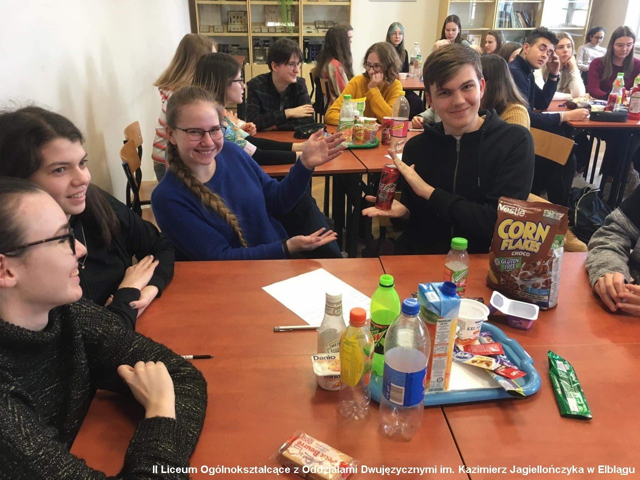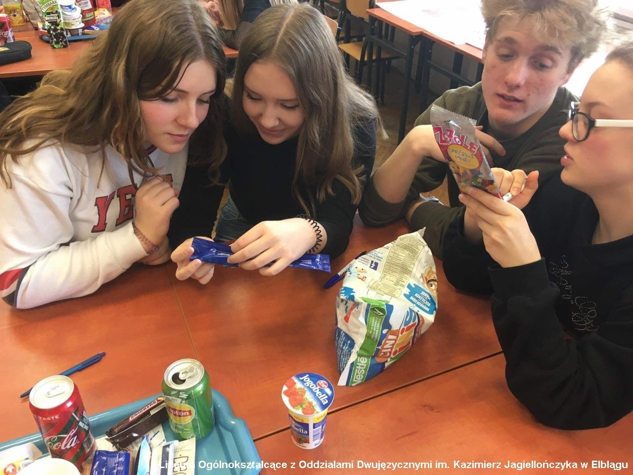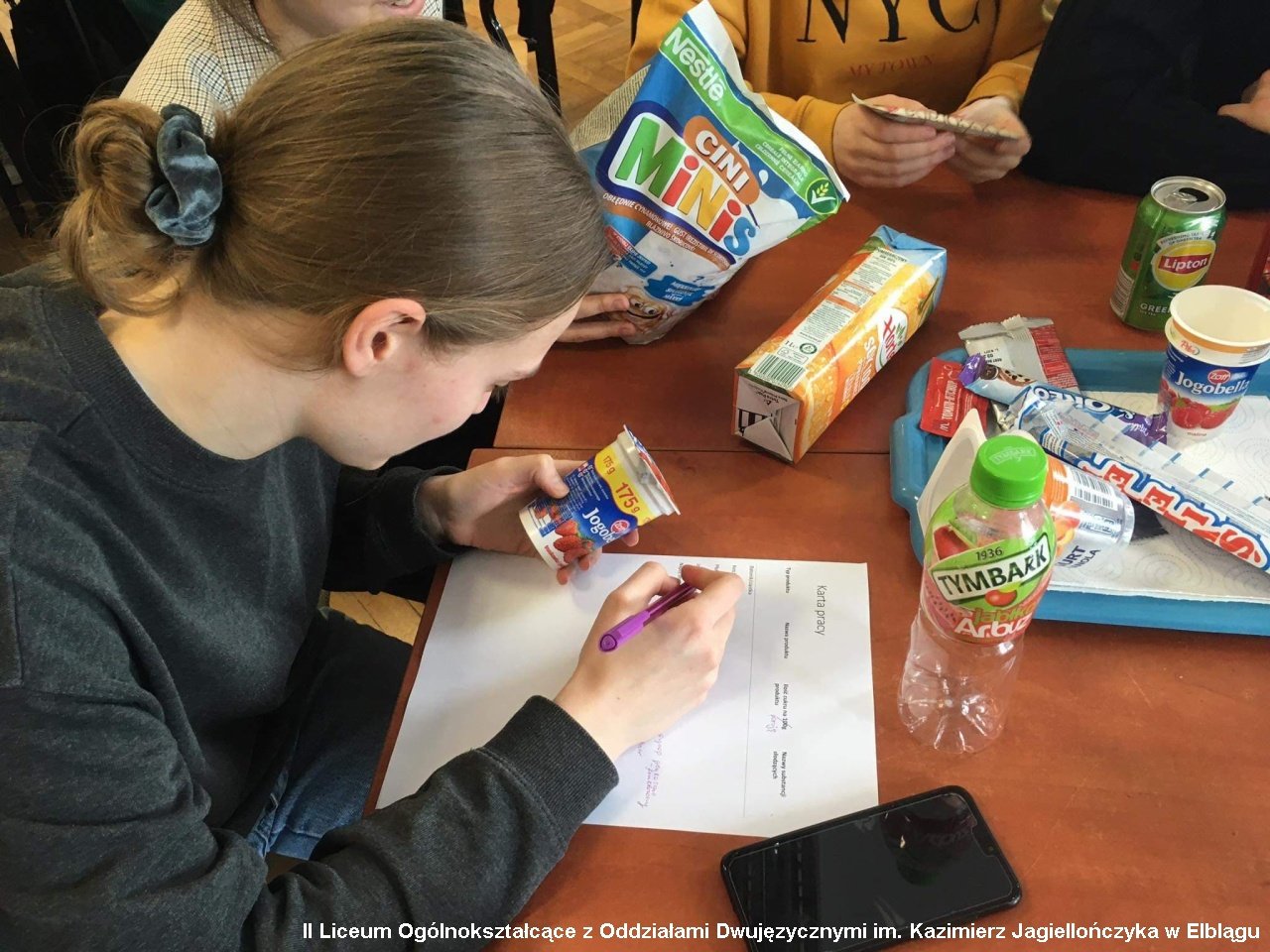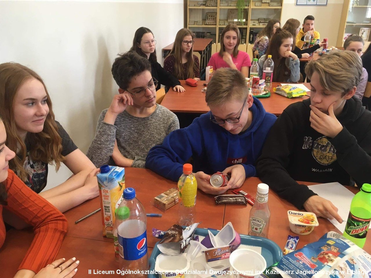 Na początku zajęć Uczniowie wypełnili ankiety dotyczące ich sposobu odżywiania, potem Ania przedstawiła przygotowaną przez siebie prezentację multimedialną na temat nadwagi, otyłości i cukru. Po tym wprowadzeniu odbyły się warsztaty, w trakcie których uczniowie pracując w grupach, rozszyfrowywali etykiety różnych produktów spożywczych, zwracając szczególną uwagę na ukryty w nich cukier. Wyniki swoich analiz zapisywali na kartach pracy, które posłużyły potem do burzliwych dyskusji na temat uczciwości producentów żywności. Pod koniec zajęć uczestnicy wzięli udział w internetowym quizie „Kahoot, dzięki któremu mogli zweryfikować swoją wiedzę, nabytą w trakcie warsztatów, a także dokonać ewaluacji tych zajęć, przed kolejną turą spotkań na temat cukru z klasami o profilu humanistycznym i matematycznym.