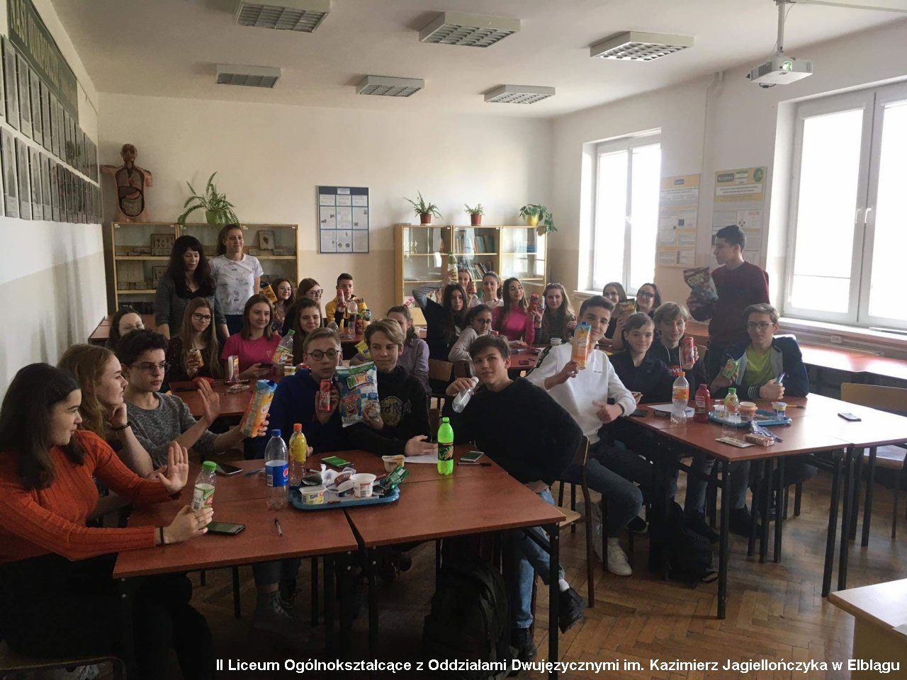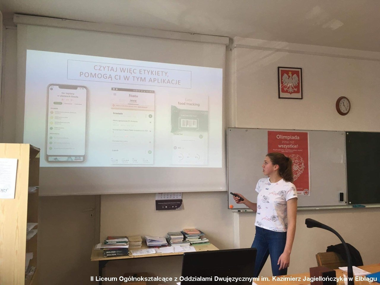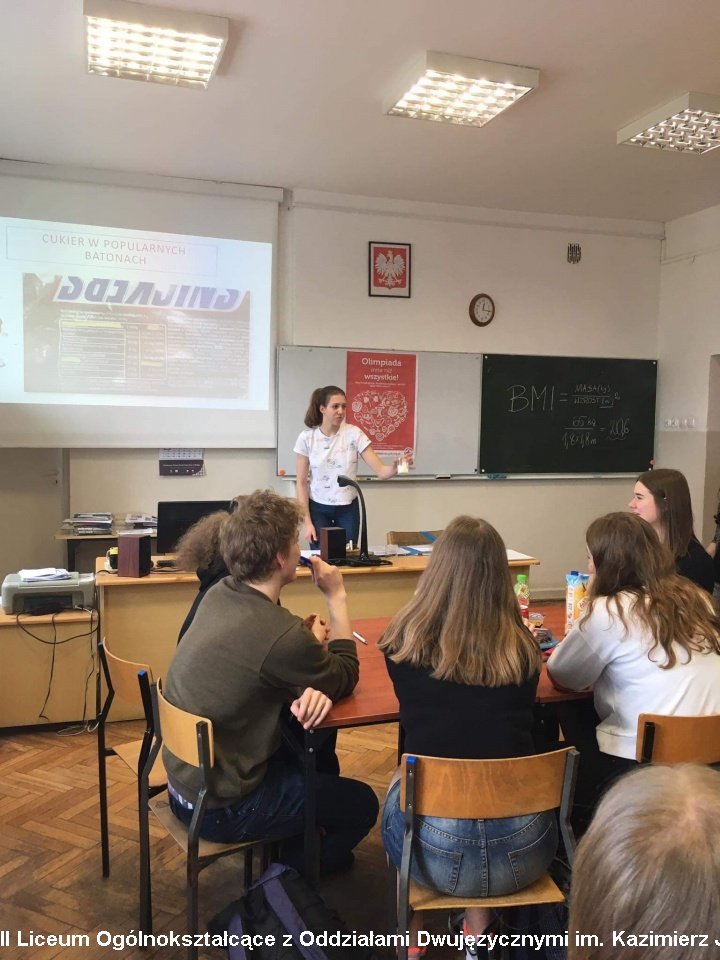 28 lutego 2020r. w ramach Akcji Prozdrowotnej Ogólnopolskiej Olimpiady Zdrowego Stylu Życia PCK, odbyły się zajęcia pt. „CUKIER-BIAŁA ŚMIERĆ”, przeprowadzone przez Annę Doroszkiewicz, uczennicę z klasy 1c. Uczestniczyły w nich klasy o profilu biologiczno-chemicznym (1c SP, 1C, 2C, 3C), łącznie około 150 uczniów. Głównym celem zajęć było uświadomienie młodzieży tego, jak dużo spożywają cukru oraz jaki ma to związek z występowanie nadwagi i otyłości. Założeniem kolejnym było pogłębienie wiedzy uczestników na temat prawidłowego odżywiania, nauka poprawnego czytania etykiet produktów spożywczych, odszukiwanie w składzie produktów cukru, który ukrywany jest przez producentów żywności pod 56 nazwami.