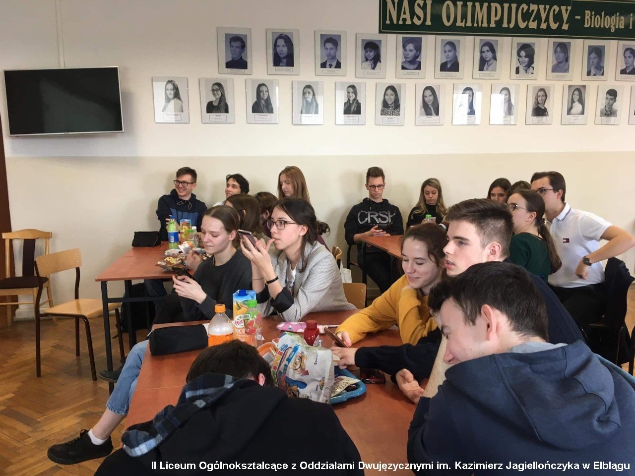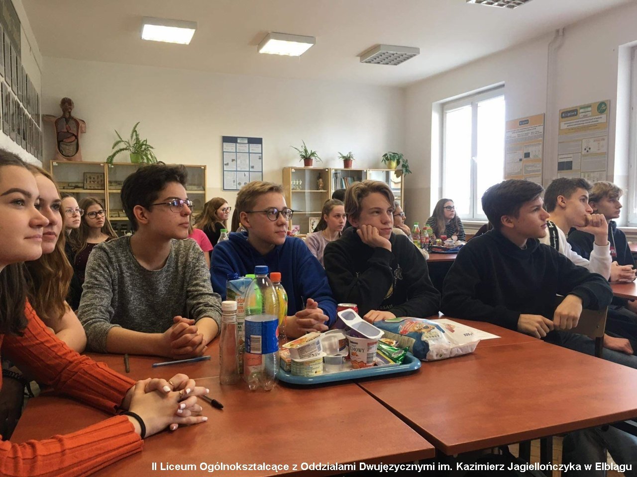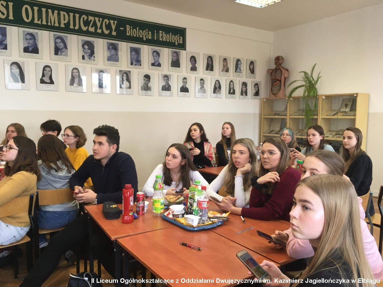 28 lutego 2020r. w ramach Akcji Prozdrowotnej Ogólnopolskiej Olimpiady Zdrowego Stylu Życia PCK, odbyły się zajęcia pt. „CUKIER-BIAŁA ŚMIERĆ”, przeprowadzone przez Annę Doroszkiewicz, uczennicę z klasy 1c. Uczestniczyły w nich klasy o profilu biologiczno-chemicznym (1c SP, 1C, 2C, 3C), łącznie około 150 uczniów. Głównym celem zajęć było uświadomienie młodzieży tego, jak dużo spożywają cukru oraz jaki ma to związek z występowanie nadwagi i otyłości. Założeniem kolejnym było pogłębienie wiedzy uczestników na temat prawidłowego odżywiania, nauka poprawnego czytania etykiet produktów spożywczych, odszukiwanie w składzie produktów cukru, który ukrywany jest przez producentów żywności pod 56 nazwami.