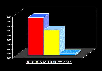 Dystrybucja towarów natomiast będzie jednym z obszarów, w których sklepy internetowe będę musiały poczynić spore zmiany. Obecnie (stan na sierpień 2000 rok) korzystają one z trzech kanałów kolportażu towarów: za pośrednictwem poczty, firm kurierskich oraz poprzez dostawców własnych, stan ten obrazuje wykres poniżej.
