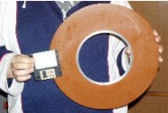 Na zdjęciu jeden z pięciu talerzy wymiennego pakietu dysków do 3340 - pojemność jednego talerza odpowiadała mniej więcej dyskietce 1.44 MB. Cały pakiet mógł być przenoszony w plastykowym kloszu z uchwytem i w razie potrzeby wstawiany do napędu.