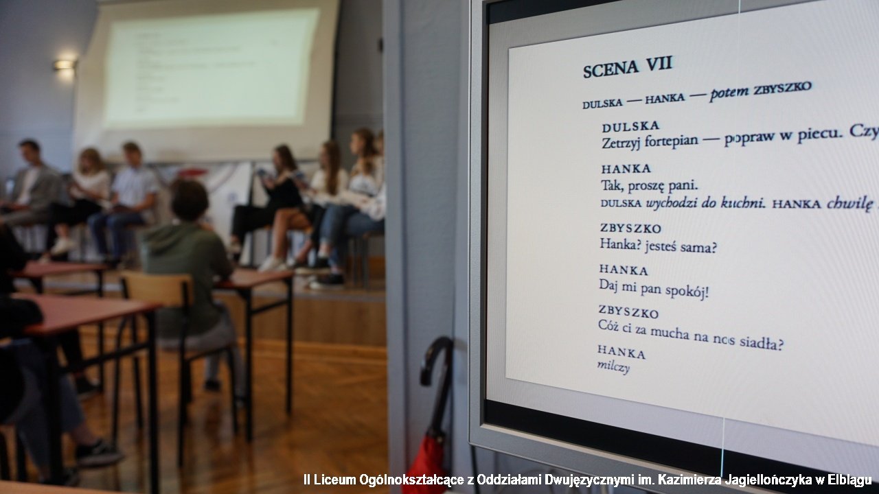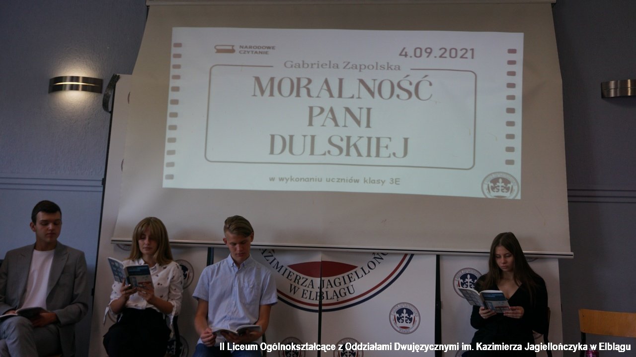 W rolę lektorów czytających „Moralność pani Dulskiej” Gabrieli Zapolskiej wcielili się uczniowie klasy IIIE i 3e : Maja Glegoła, Maja Październik, Klaudia Parczewska, Nikola Grzybowska, Natalia Binkowska, Weronika Zielińska, Patryk Szmit i Grzegorz Koronowski.