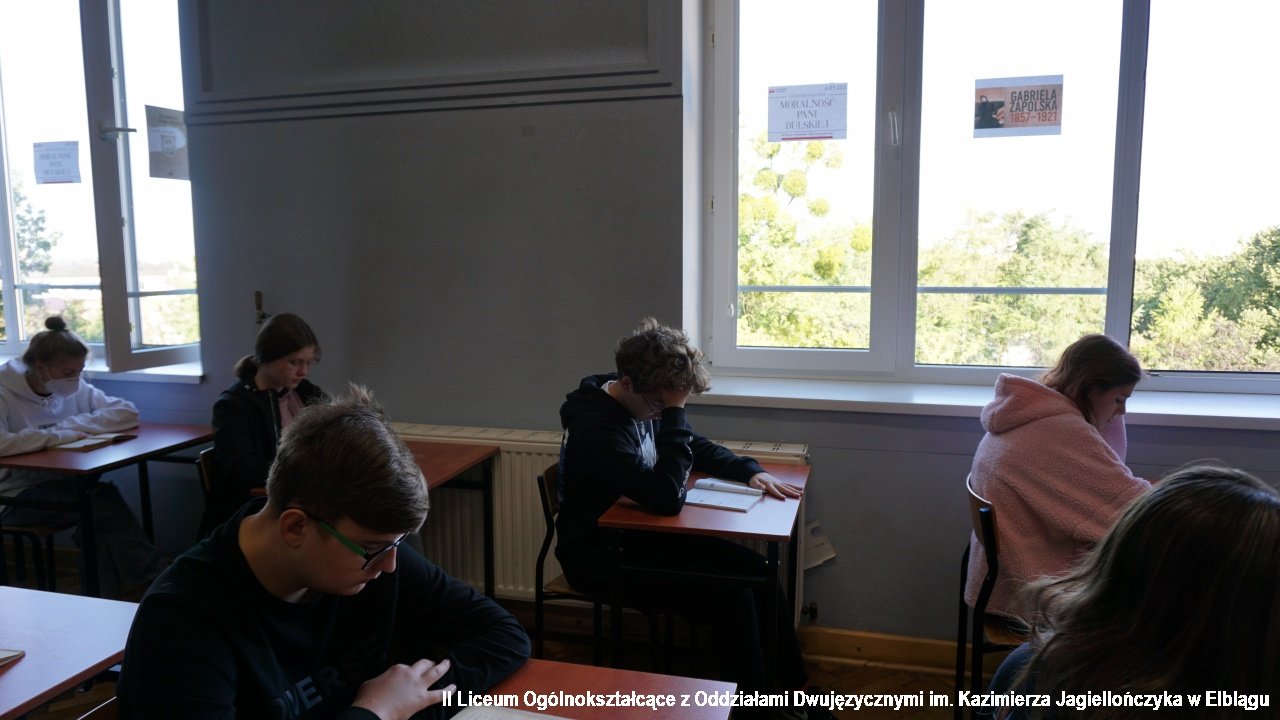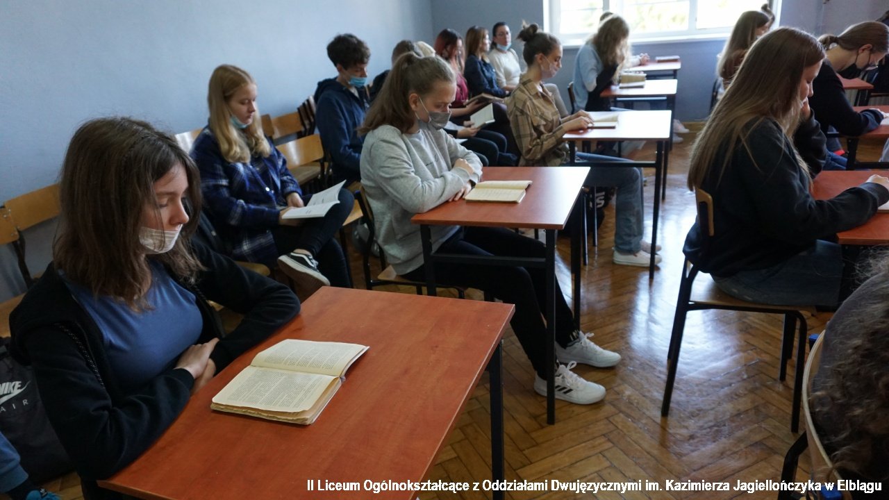 Co roku nasza szkoła bierze udział imprezie czytelniczej Narodowe Czytanie. W tym roku jest to 10. edycja tej narodowej imprezy. Przez tę dekadę czytaliśmy w różnych miejscach. Zaczynaliśmy w domu seniora w Tolkmicku, potem czytaliśmy w ogródkach kawiarni na starym mieście dla przechodniów. W tym roku czytaliśmy w szkole. Słuchaczami były dwie klasy pierwsze 1b i 1a.