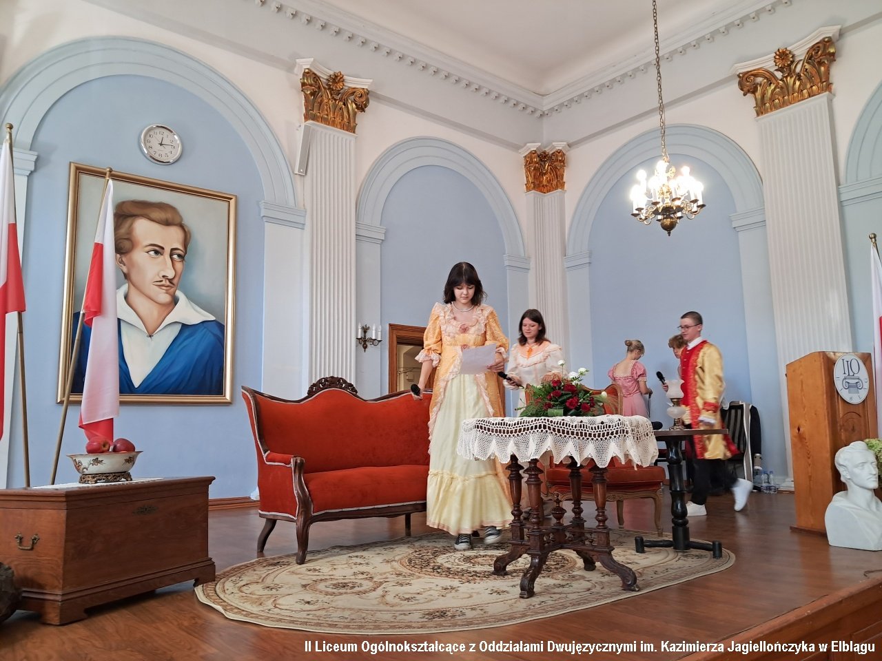 Nasi przedstawiciele wystąpili jako 27. delegacja. Natalia Pietruszyńska, Nikola Stolpa I Szymon Kottlenga reprezentowali naszą szkołę podczas miejskich obchodów Narodowego Czytania. Ubrani w stroje z epoki użyczone przez Teatr Sewruka w Elblągu zaprezentowali ostatnią scenę dramatu, egzekucję Kordiana.