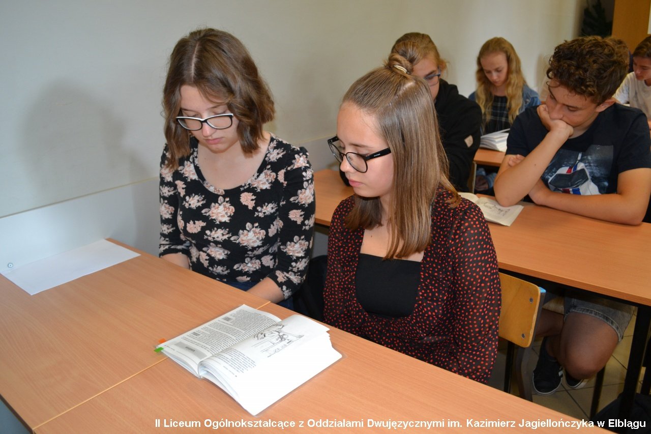 Wszyscy słuchacze w skupieniu śledzili teksty lektury, których dostarczeniem zajęła się biblioteka szkolna.