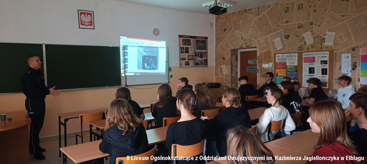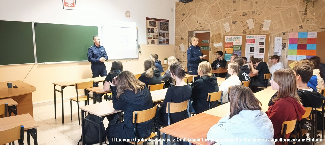 19 oraz 26 października 2023r. w klasach pierwszych i drugich odbyły się zajęcia "Odpowiedzialność prawna nastolatków" prowadzone przez funkcjonariuszy Komendy Miejskiej Policji w Elblągu. Młodzież rozmawiała z policjantami na temat różnych zachowań ryzykownych, np. hejtu, cyberprzemocy, przejawów demoralizacji oraz ich prawnych konsekwencji. Informacje przekazane były w interesujący sposób. Zajęcia urozmaiciły filmy wyjaśniające czym jest hejt, jak powstaje i jaki jest jego wpływ na życie młodego człowieka.
