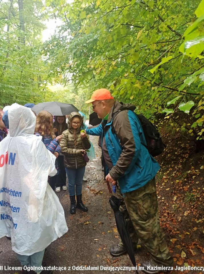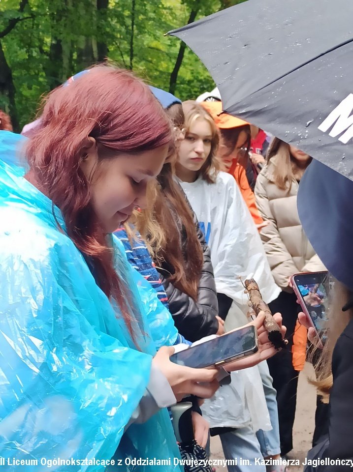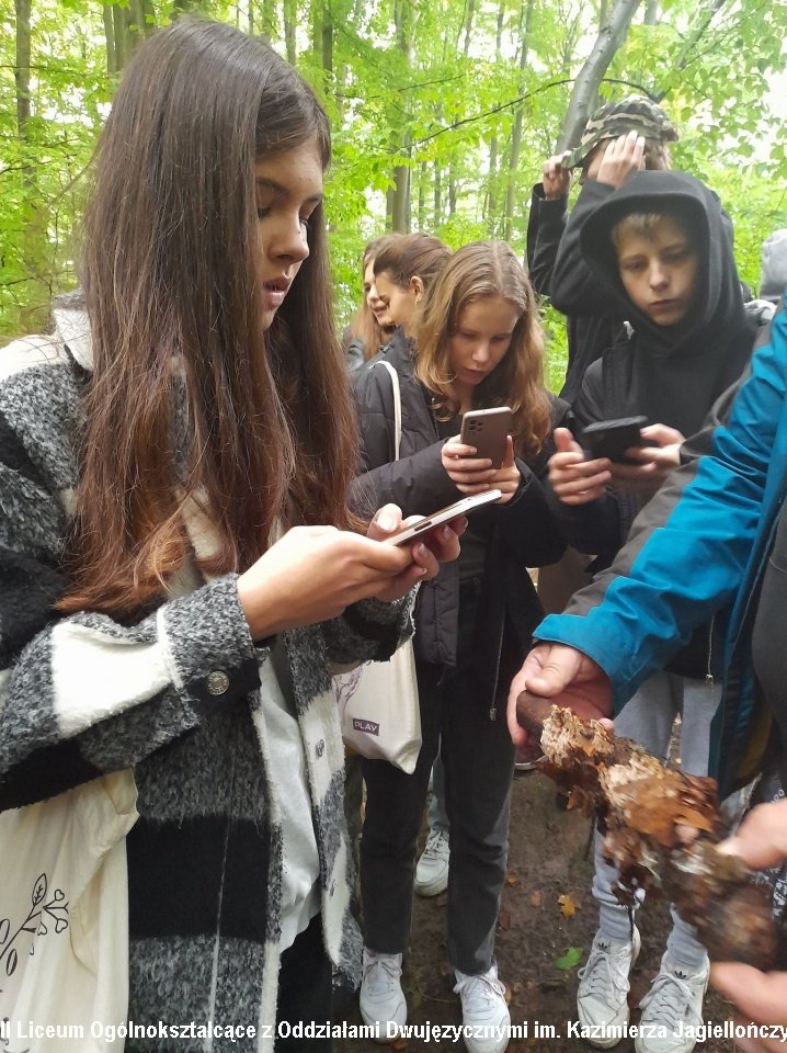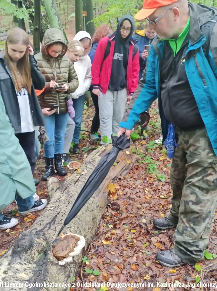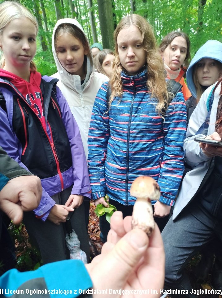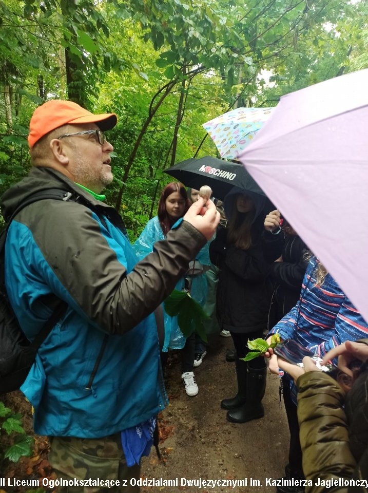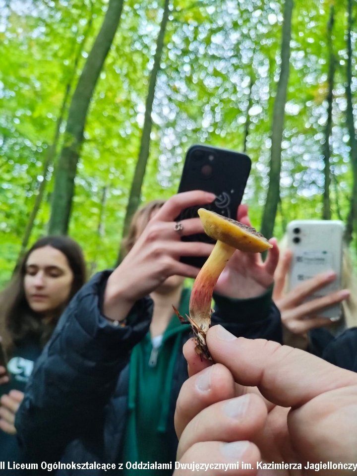 O grzybach, choć mamy z nimi do czynienia na co dzień, zazwyczaj bardzo mało wiemy. Myślimy „grzyby” i . . . widzimy w wyobraźni pieczarki, muchomory, prawdziwki. Tymczasem grzyby stanowią ogromną grupę bardzo zróżnicowanych organizmów. Szczególnie fascynujący jest świat grzybów w rozmiarze „S”. Aby je dostrzec, trzeba długo wpatrywać się w jedno miejsce: we fragment kory, w przekrój pniaka, w suche gałęzie, czy w zniekształcony listek upstrzony plamami. Taki właśnie fragment przyrody poznali nasi uczniowie, biorący udział w terenowych warsztatach mykologicznych. Prowadzący – dr Grzegorz Fiedorowicz (UWM) – przedstawił świat grzybów, jakiego dotąd nie znaliśmy. To one tworzą sieć łączącą ze sobą rośliny i zamykają koło obiegu materii. Jadalne, niejadalne i ich trujące sobowtóry; pasożytnicze i saprotroficzne; workowce i podstawczaki; mikrogrzyby i makrogrzyby; lecznicze i smaczne – oto cała gama różnorodności grzybów w Lesie Bażantarnia, którą mogliśmy zobaczyć, dotknąć, a nawet posmakować.