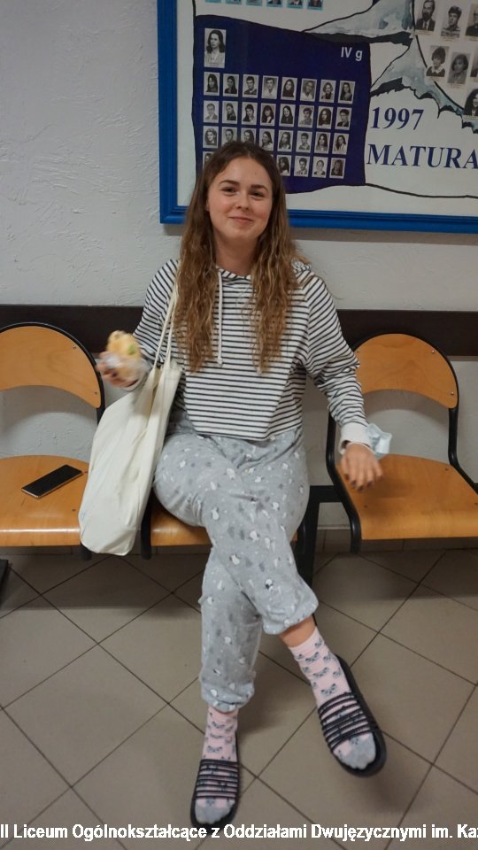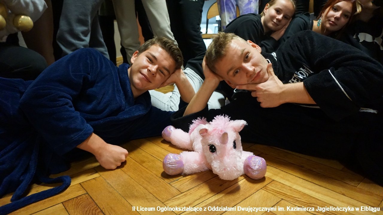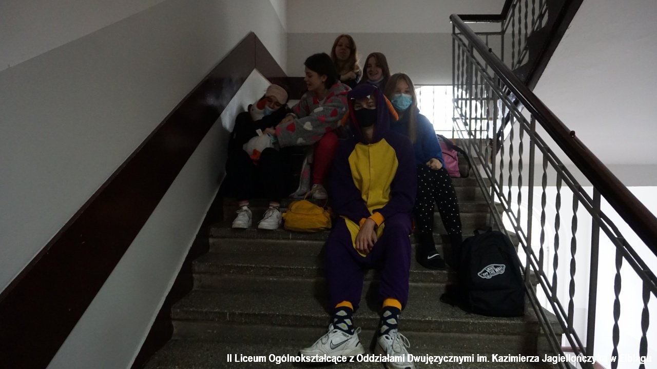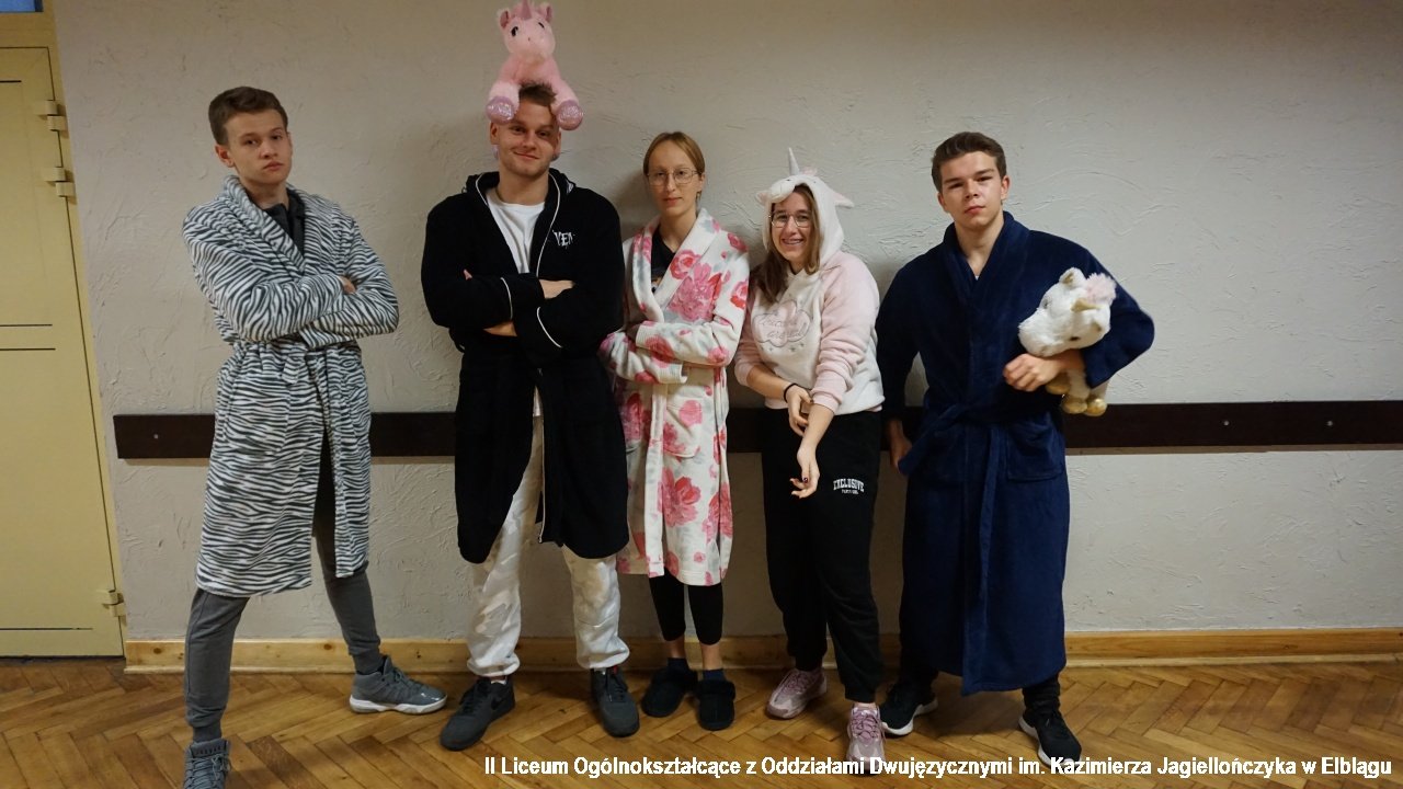 Przebrania były wyborne. Flanelowe piżamki, kolorowe szlafroczki, rozmaite dresiki, pajacyki lub inne odzienia nocno-łóżkowe. Najbardziej jednak spodobały się nam kapciuszki i „laczuszki” domowe. Wśród szkolnych śpiochów byli i tacy, co zabrali ze sobą całe łóżka. Ha, ha. Klasa IIIE przyniosła ze sobą nawet śpiwory. Gratulujemy pomysłu!