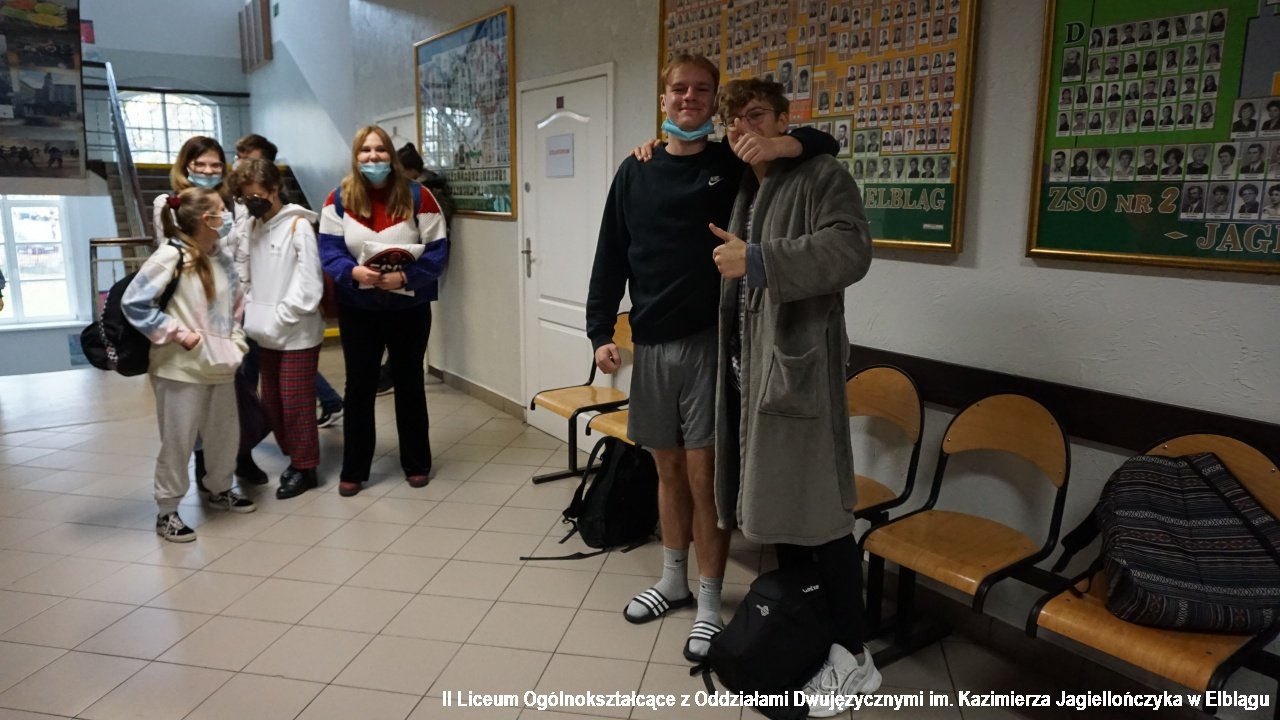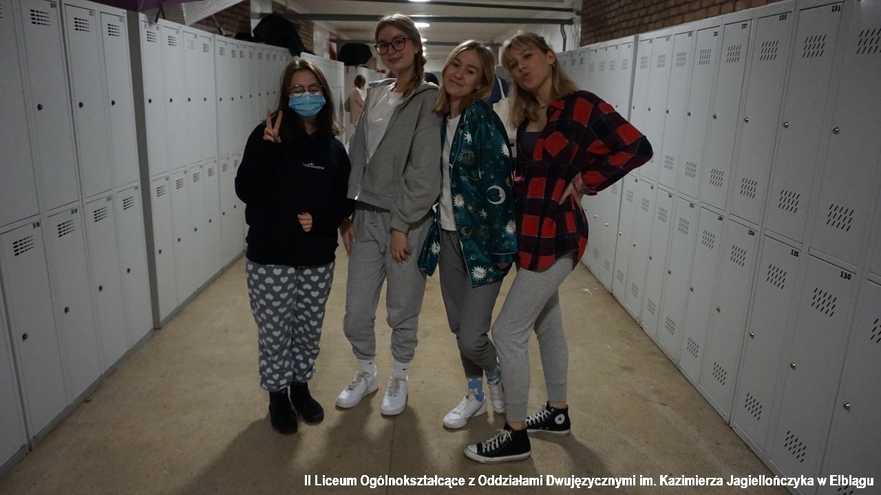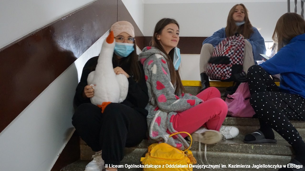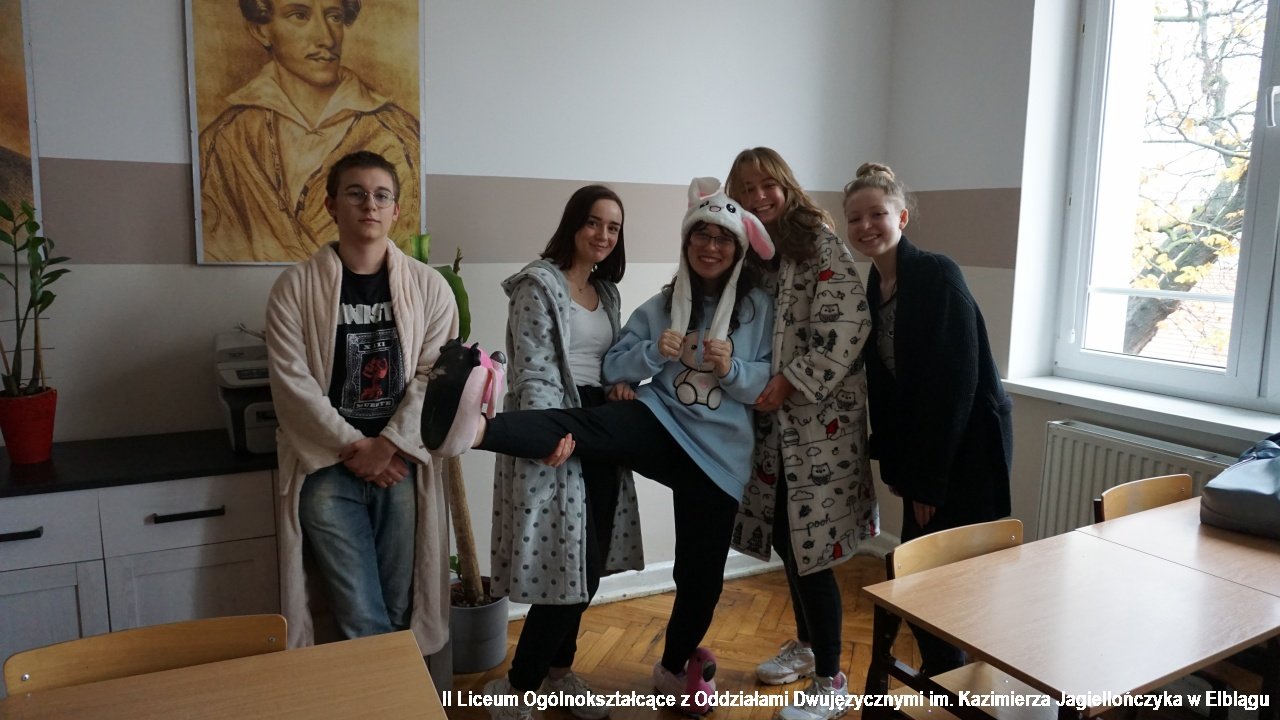 Przebrania były wyborne. Flanelowe piżamki, kolorowe szlafroczki, rozmaite dresiki, pajacyki lub inne odzienia nocno-łóżkowe. Najbardziej jednak spodobały się nam kapciuszki i „laczuszki” domowe. Wśród szkolnych śpiochów byli i tacy, co zabrali ze sobą całe łóżka. Ha, ha. Klasa IIIE przyniosła ze sobą nawet śpiwory. Gratulujemy pomysłu!