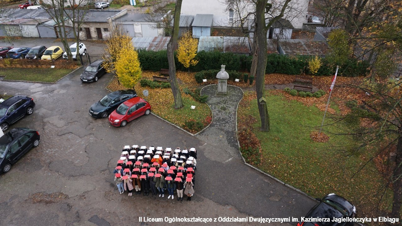 Nie ukrywamy, że pogoda nie rozpieszczała podczas realizacji happeningu. Deszczyk cały czas mżył, ale to nie przeszkodziło wykonać „żywą” biało-czerwoną flagę.