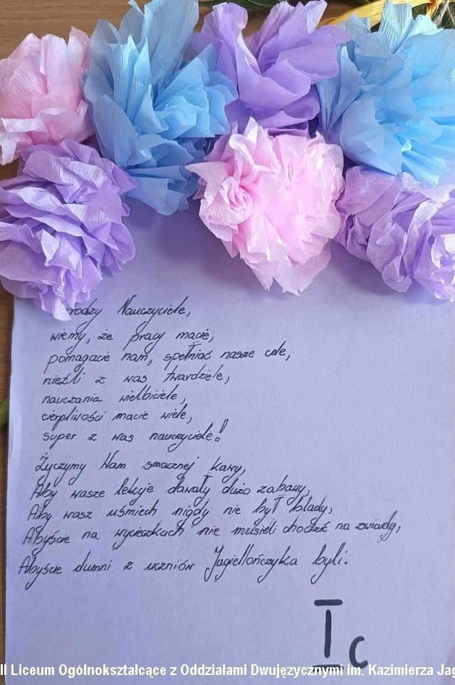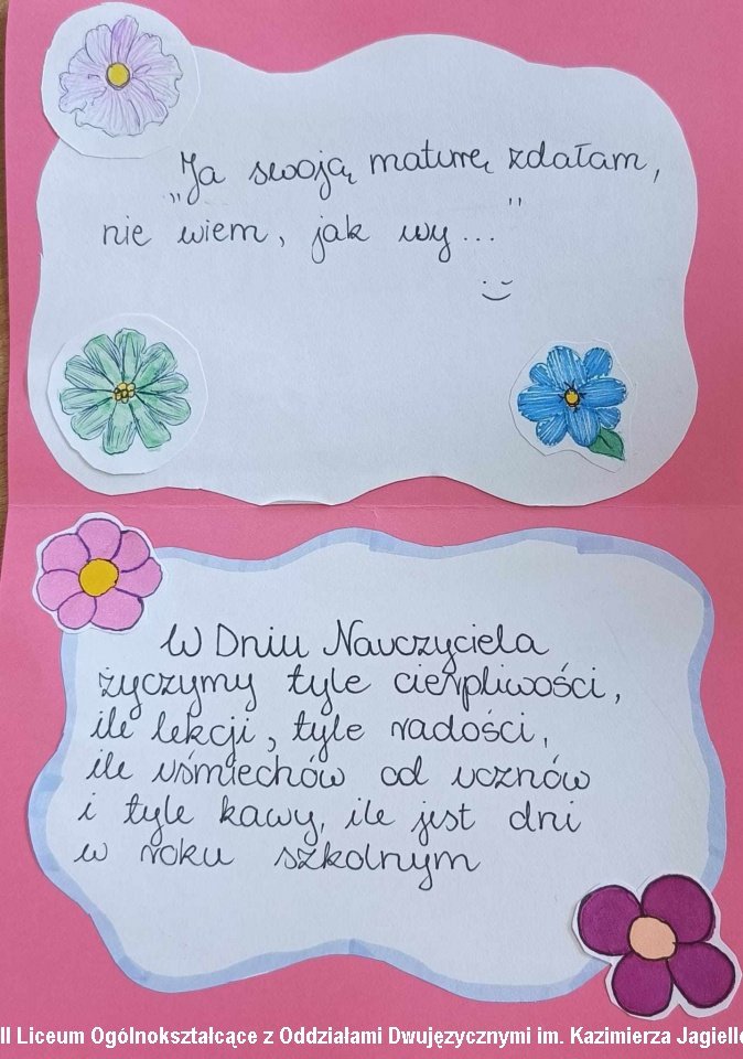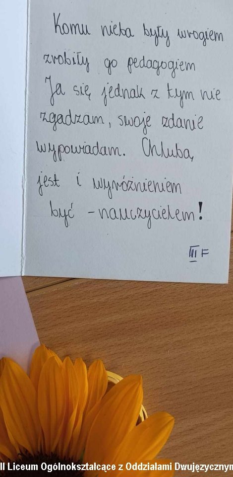 W piątek 13 października 2023r. w szkole odbyły się wydarzenia w różny sposób świętujące to piękne święto szkoły i edukacji. Rozstrzygnięty został międzyklasowy konkurs na plakat z okazji obchodów rocznicowych powstania Komisji Edukacji Narodowej. Nauczyciele „językowcy” przygotowali dla klas pierwszych i drugich z tej okazji tzw. Dzień języków Obcych. Na długiej przerwie w pokoju nauczycielskim spotkali się nauczyciele, pracownicy administracji i obsługi szkoły. Pani Dyrektor przekazała otrzymane na jej ręce życzenia dla szkoły i pracowaników. Przedstawiciele samorządu uczniowskiego również złożyli życzenia. Następnie rozdane zostały karty z życzeniami wykonane własnoręcznie przez uczniów. Zrobiło się bardzo miło i uczuciowo. Nauczyciele w skupieniu odczytywali krótkie teksty. Teksty wzruszające ale też humorystyczne i puentujące pracę belfra. Karty były różnorodne, kolorowe, zdobione. Miły upominek!