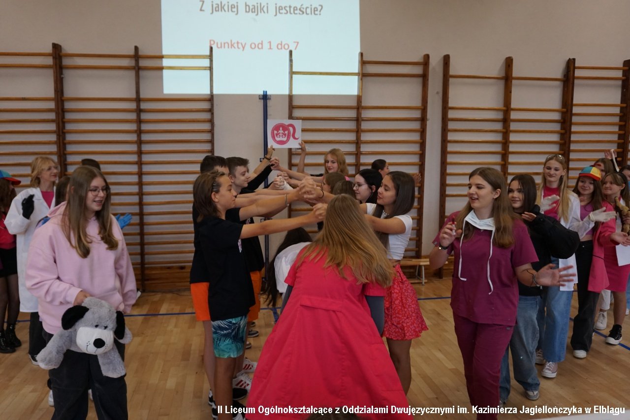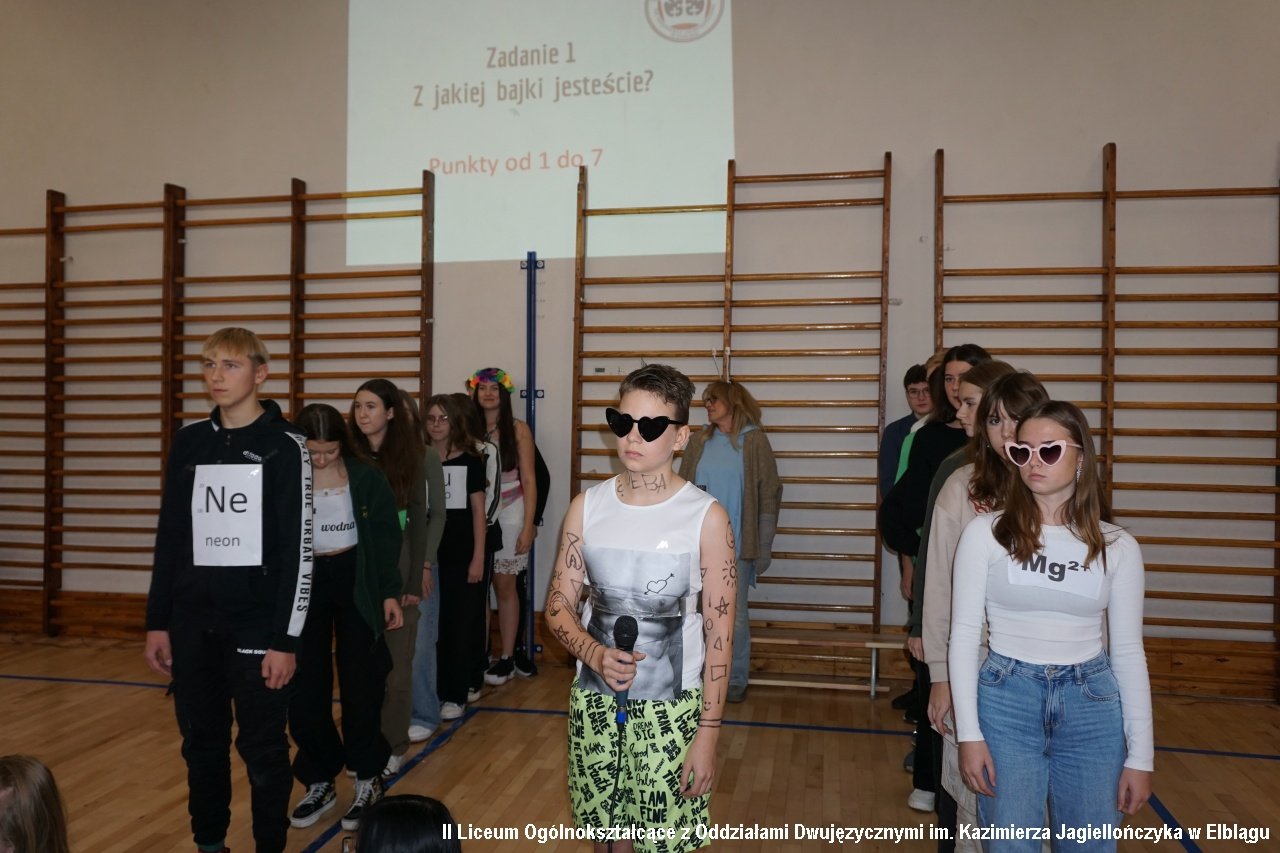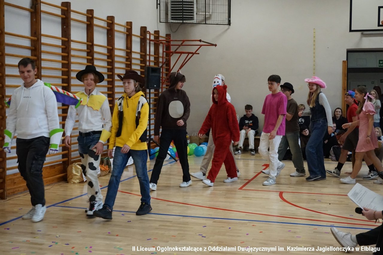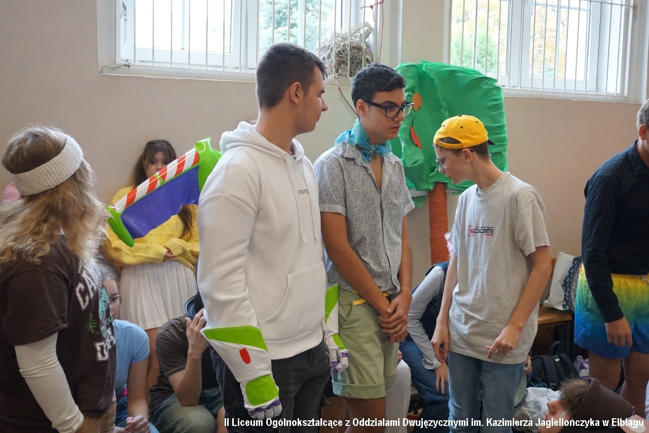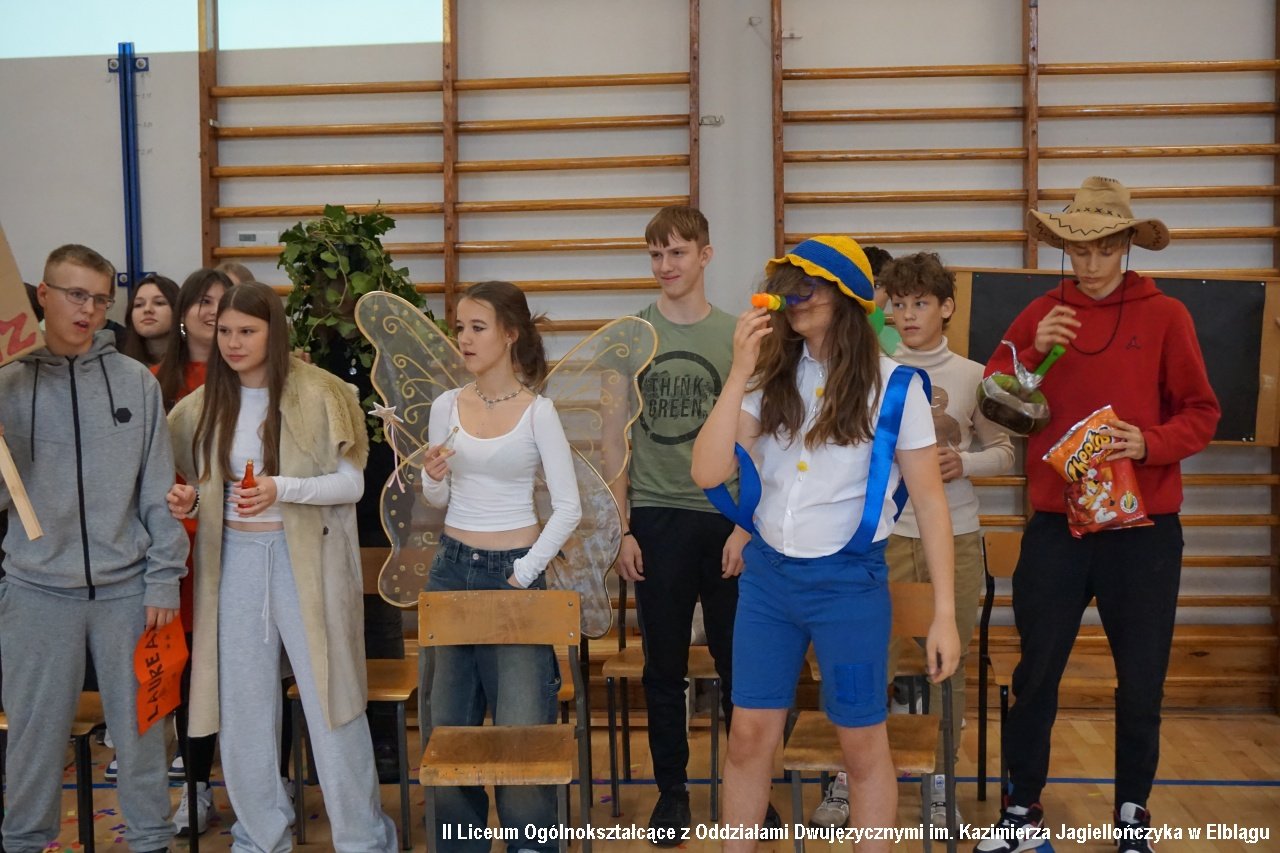 Klasy musiały przygotować się wcześniej do konkurencji pt. Z jakiej bajki jesteście? I tak oto na naszej otrzęsinowej scenie znalazły się postaci z bajki Trolle (1a), Vaiana (1b), Barbie (1c), Minionków (1d), Shreka (1e), Toy Story (1f) oraz Z Królewny Śnieżki (1g). Mini-scenki były zabawne, z pomysłem i z przygotowaną bogatą scenografią oraz kostiumami scenicznymi.