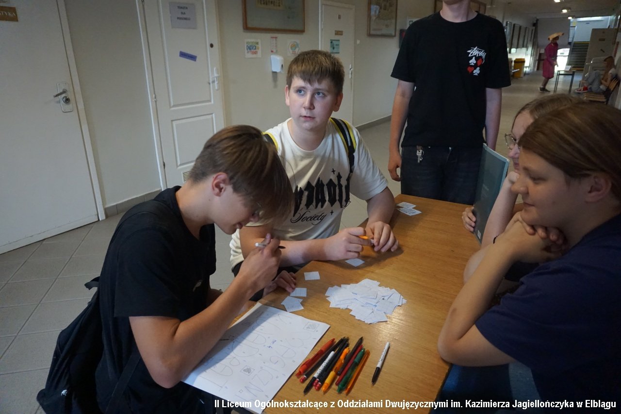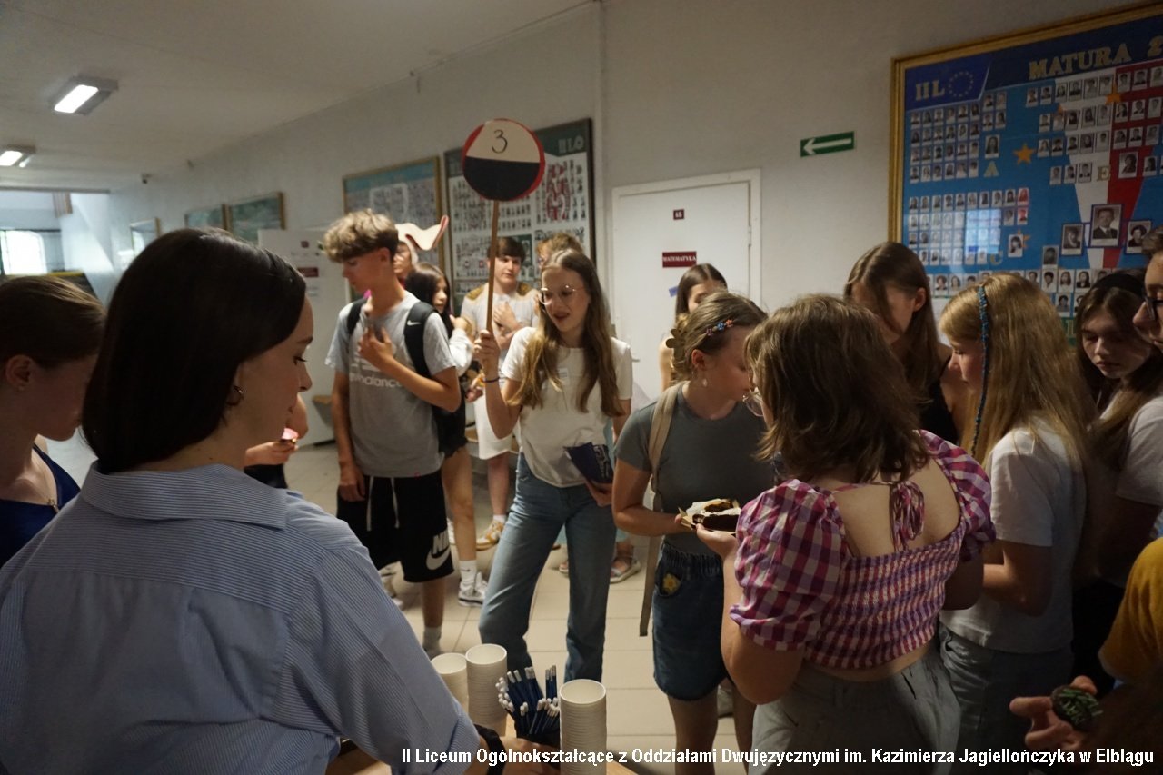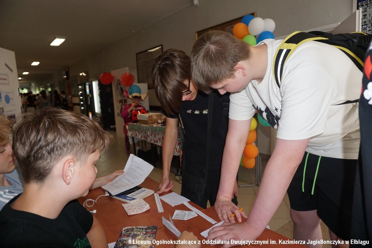 W matematycznej Kawiarni PIkawa odbywały się klasyczne łamigłówki z wieżą Hanoi, odkrywanie tajników powstawania brył obrotowych, budowania przestrzennych konstrukcji oraz podchody matematyczne w gmachu szkolnym i plenerze Przygotowaliśmy wiele różnych zabaw językowych np. „El mundo español” konkurs języka hiszpańskiego sprawdzający wiedzę dotyczącą geografii, historii i kultury Hiszpanii oraz „ Il mondo italiano” czyli konkurs języka włoskiego a oprócz tego „Dulces y dolci” – stoisko ze słodkościami z Hiszpanii i Włoch i przepisami jak je sporządzić Na zielonym dziedzińcu szkoły zorganizowane zostało biegane dyktando po angielsku, czyli RUNNING DICTATION. Oprócz znajomości pisowni angielskiej sprawdzić można było swoje umiejętności w zabawie Rack your brain over idioms, Escape-Room – try to Get out of the classroom czy wziąć udział w pokazie Poznać kraje niemieckojęzyczne.