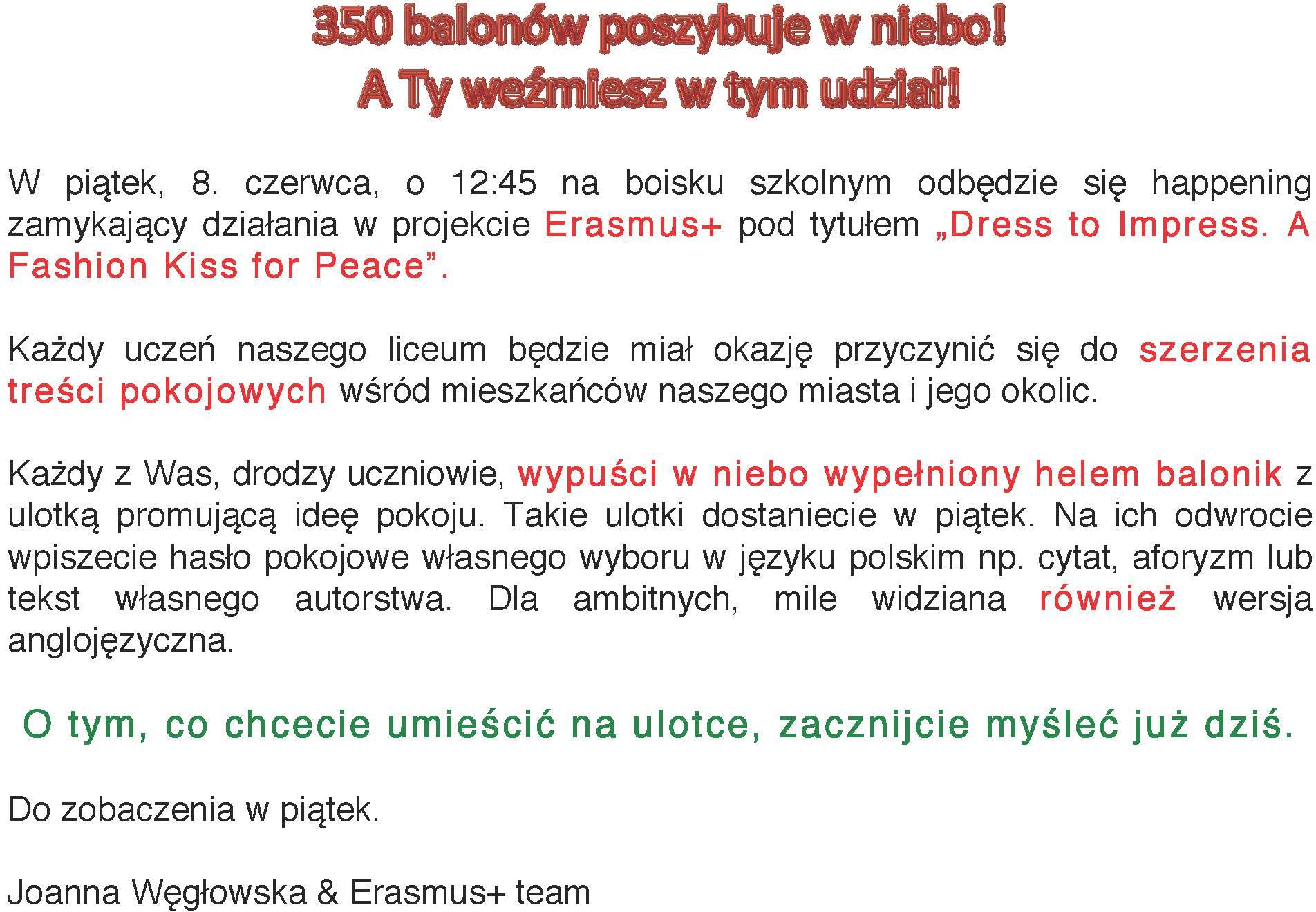 PEACE BEGINS WITH A SMILE, czyli pokój zaczyna się od uśmiechu. Pod takim hasłem w II LO zakończył się trzyletni projekt Erasmus+ pod tytułem „Dress to Impress. A Fashion Kiss for Peace,” co w wolnym tłumaczeniu oznacza „Świat mody na rzecz pokoju – wyraź to strojem.” Działania w projekcie służyły wyposażeniu ucznia w szereg narzędzi do pokojowego porozumiewania się z otoczeniem, również strojem, który może stanowić swoistą deklarację przekonań człowieka i jego światopoglądu.