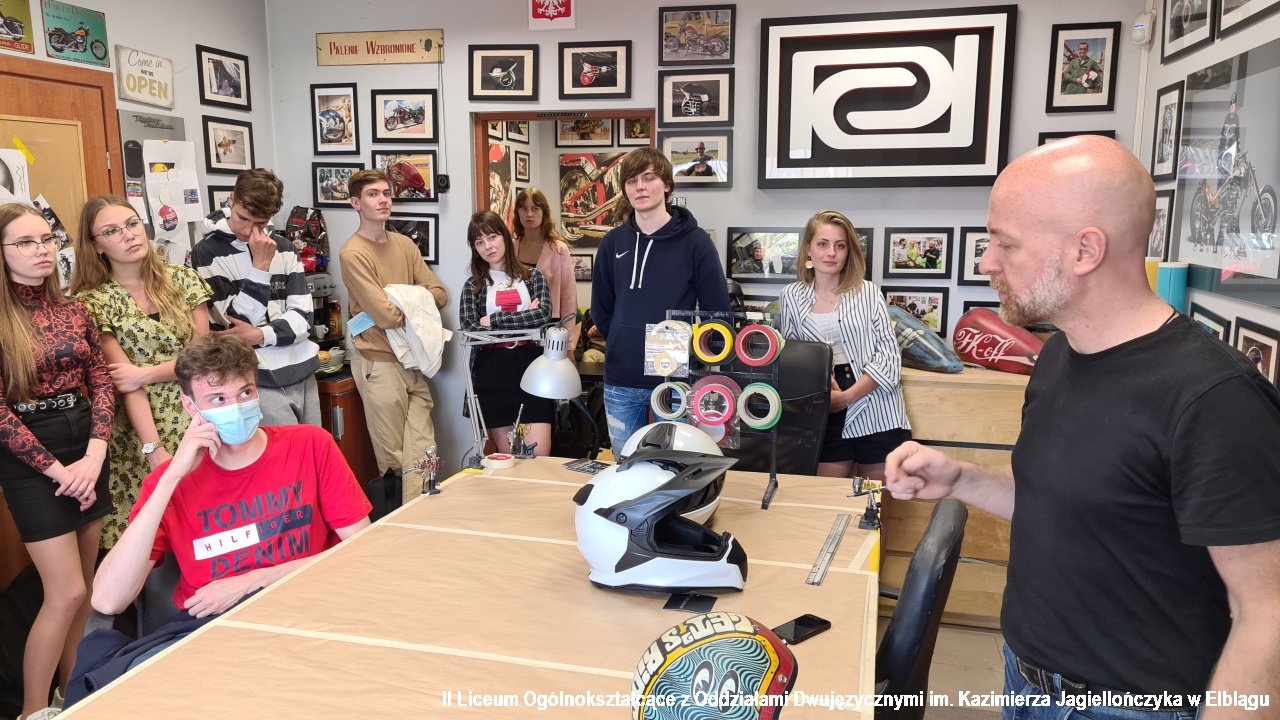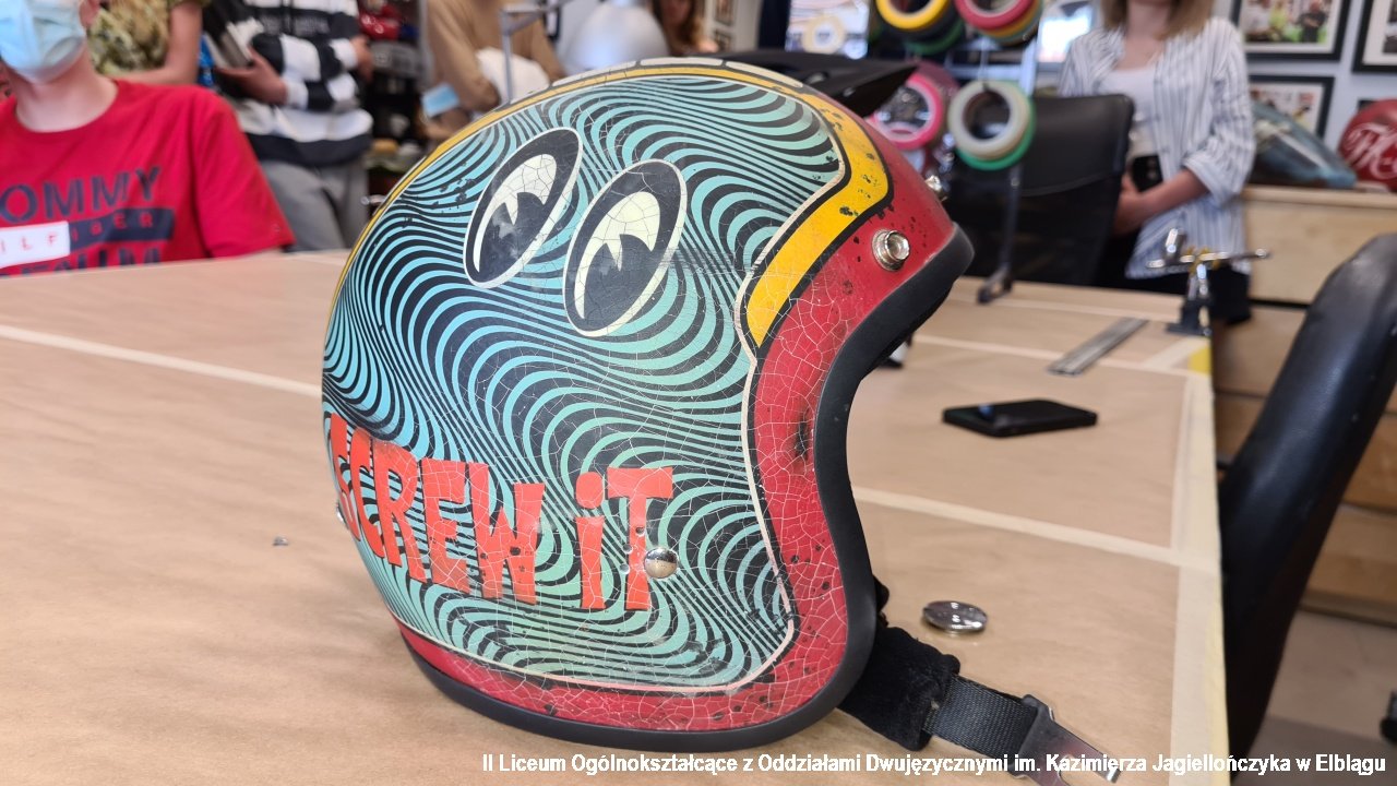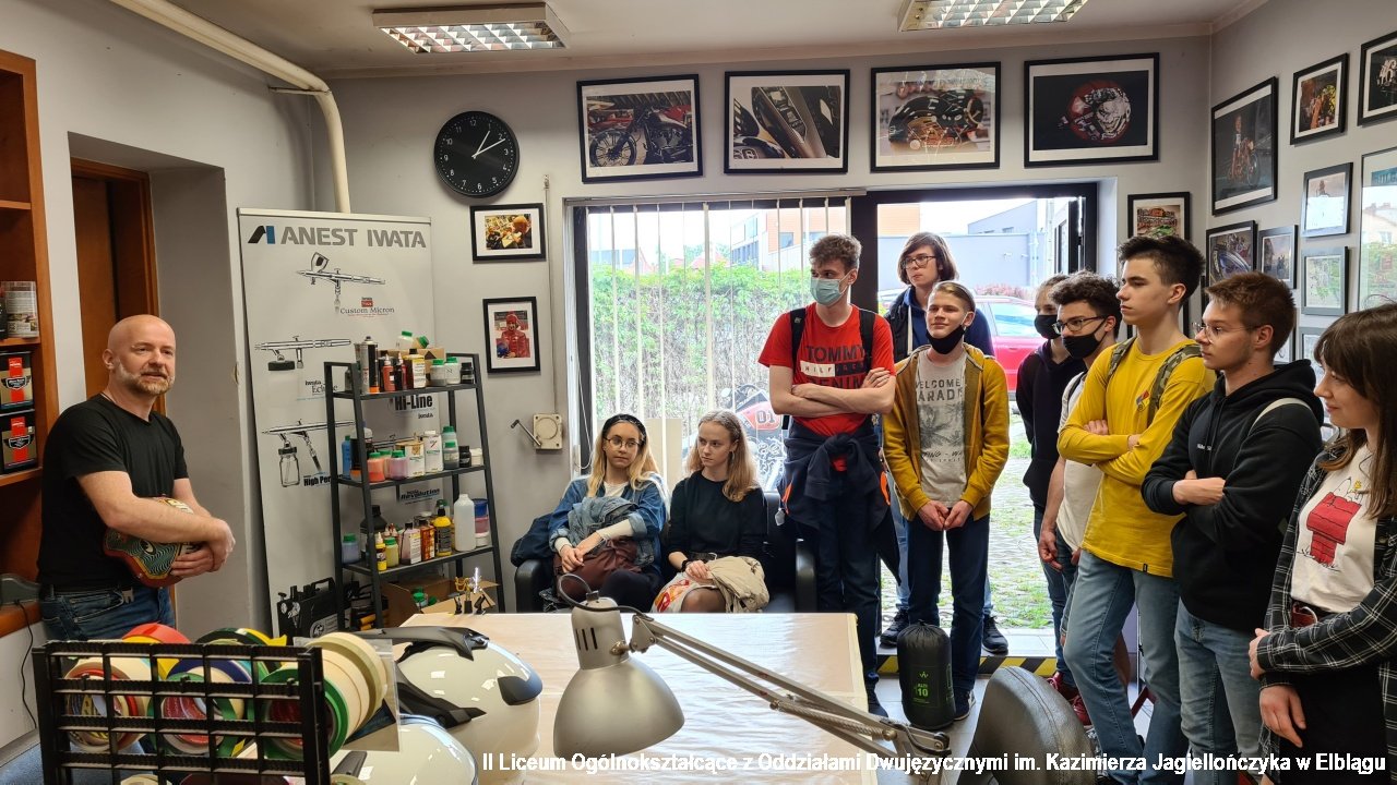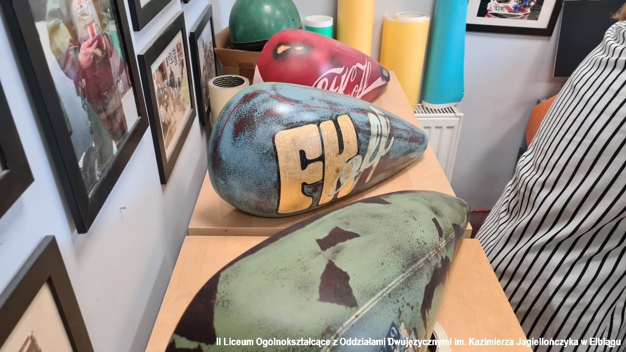 Klasa politechniczna IIE miała okazję odwiedzić go w pracowni i posłuchać jak z pasją i zaangażowaniem opowiada o tym, co robi. Pan Piotr jest zdecydowanie pasjonatem. Jak sam mówi, uprawia rzemiosło artystyczne, wykonując na zamówienie projekty graficzne, zdobiące głównie kaski, hełmy, elementy motocykli. Realizując zamówienia, łączy umiejętności i wiedzę z wielu dziedzin: matematyki, informatyki, projektowania, rysunku. I choć z wykształcenia jest prawnikiem, nie wyobraża sobie innej pracy jak tworzenie rysunków i grafik malowanych dla klientów.