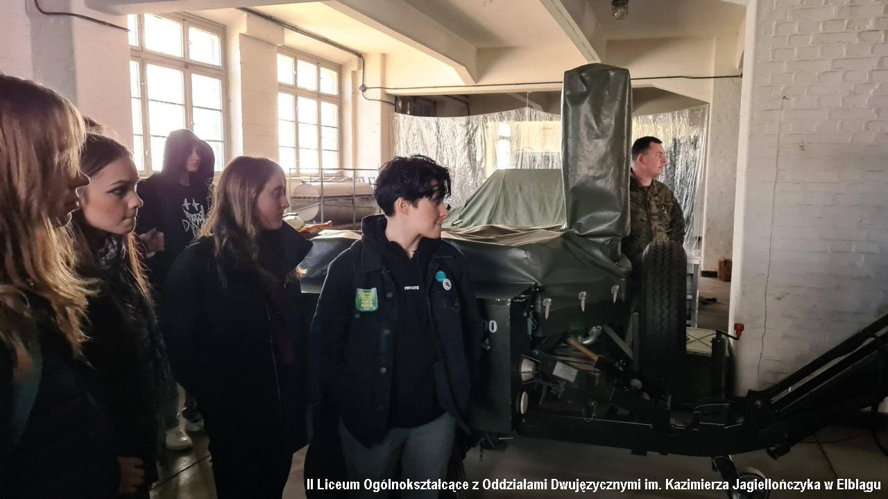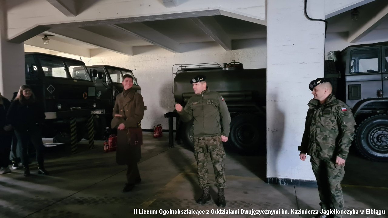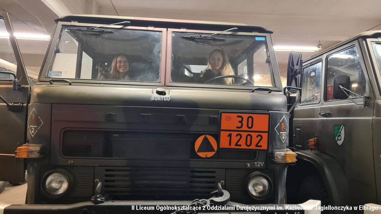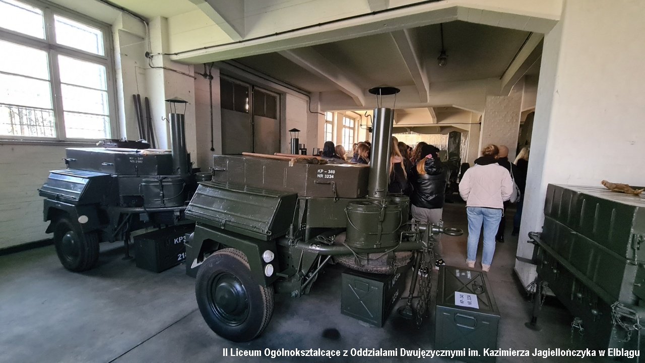 Pokonując całkiem sporą odelgłość, dotarliśmy do ogromnych garaży, gdzie zobaczyliśmy czołgi i to całkiem z bliska. Można było wejść do ich środka a nawet (niektórzy) odbyć krótką „przejażdżkę” . Przeżycie niecodzienne. Potem oprowadzono nas po magazynach , w których w stanie gotowości stoją różnego rodzaju pojazdy wojskowe i sprzęt typu kuchnie polowe lub do uzdatniania wody. Tam również można było zajrzeć w różne zakątki wejść do środka wojskowych pojazdów. A to całkiem duży wyczyn, gdyż sprawne wejście do takich wysokich aut nie jest łatwą sprawą. Zademonstrowana została procedura wchodzenia dużej grupy żołnierzy do samochodów transportowych. Potem młodzież miała okazję przejść taki test sprawnościowy i wchodziła kolejno do naczepy wojskowego auta. A na koniec przejażdżka!