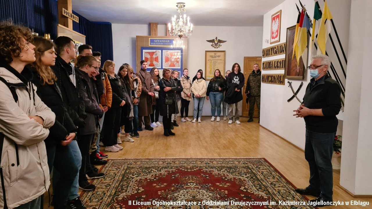Ostatnim miejscem, które odwiedziliśmy była Izba Pamięci poświęcona 9 Braniewskiej Brygadzie Kawalerii Pancernej, po której oprowadził nas kustosz wystawy. Na pamiątkę otrzymaliśmy publikacje o brygadzie braniewskie z dedykacją dla II LO od pana pułkownika Piotra Szelezina oraz upominki dla każdego uczestniczka wycieczki.