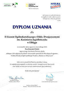 Miło nam pionformować, że zeszłoroczny maturzysta Konrad Żyhałko uzyskał tytuł finalisty XI edycji Ogólnopolskiego Projektu "Matura na 100 procent".