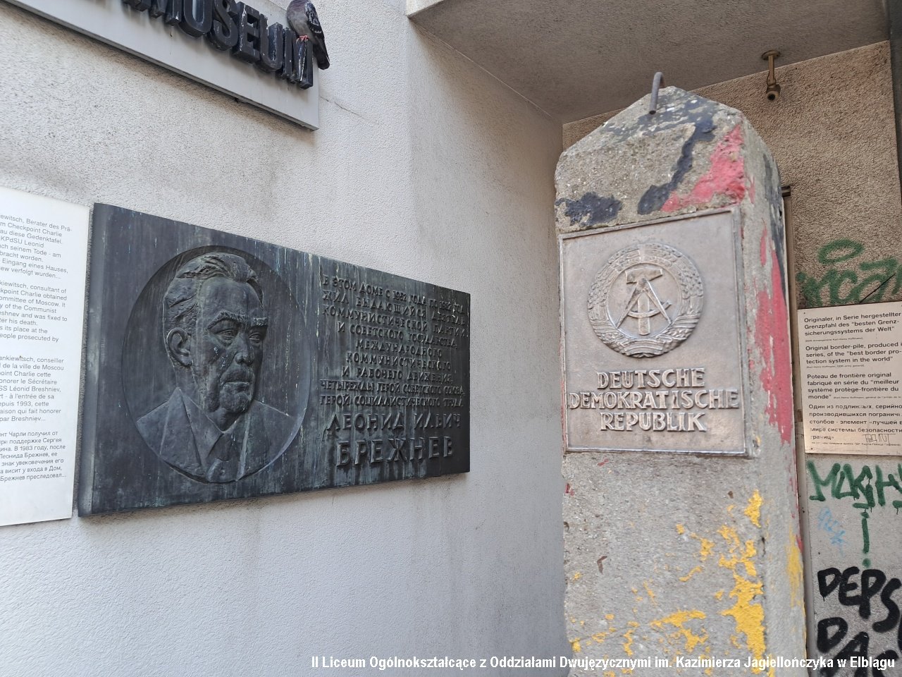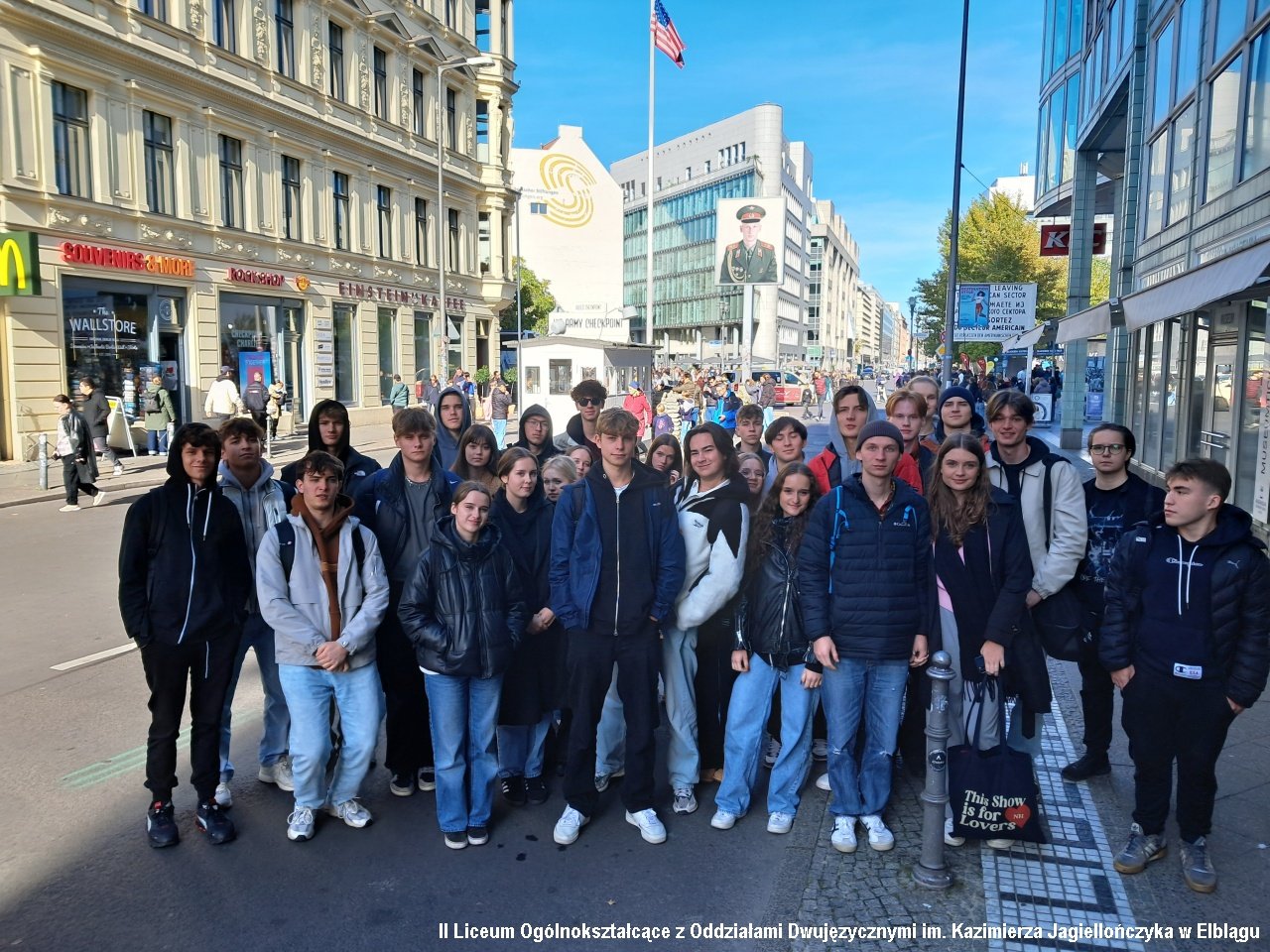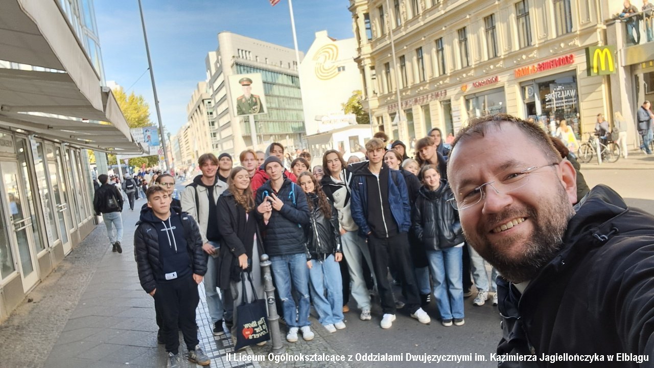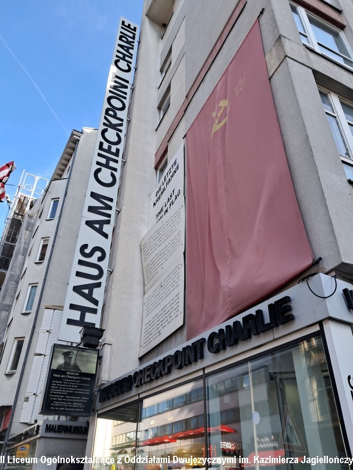 Drugiego dnia pojechaliśmy do Berlina. Pobyt w stolicy Niemiec rozpoczęliśmy od zwiedzania Muzeum Muru Berlińskiego. Poznaliśmy historię podziału miasta na strefy okupacyjne i działań zmierzających do jego obalenia. W muzeum widzieliśmy również ekspozycje poświęcone innym krajom zniewolonym komunizmem: Polsce, Węgrom czy Korei Północnej. Szczególnie ważna okazała się sala ukraińska, a w niej historia toczącej się na Ukrainie wojny. Po muzeum odwiedziliśmy słynny check point Charlie będący punktem kontrolnym pomiędzy radziecką a amerykańską strefą okupacyjną. Przeszliśmy Friedrichstrasse do Bramy Brandenburskiej, Tier Garten i pomnika ofiar holokaustu. Udaliśmy się także do Reichstagu i weszliśmy na kopułę budynku. Przez szklane ściany widzieliśmy obradujących parlamentarzystów, a w ich gronie kanclerza Niemiec Olafa Scholza.