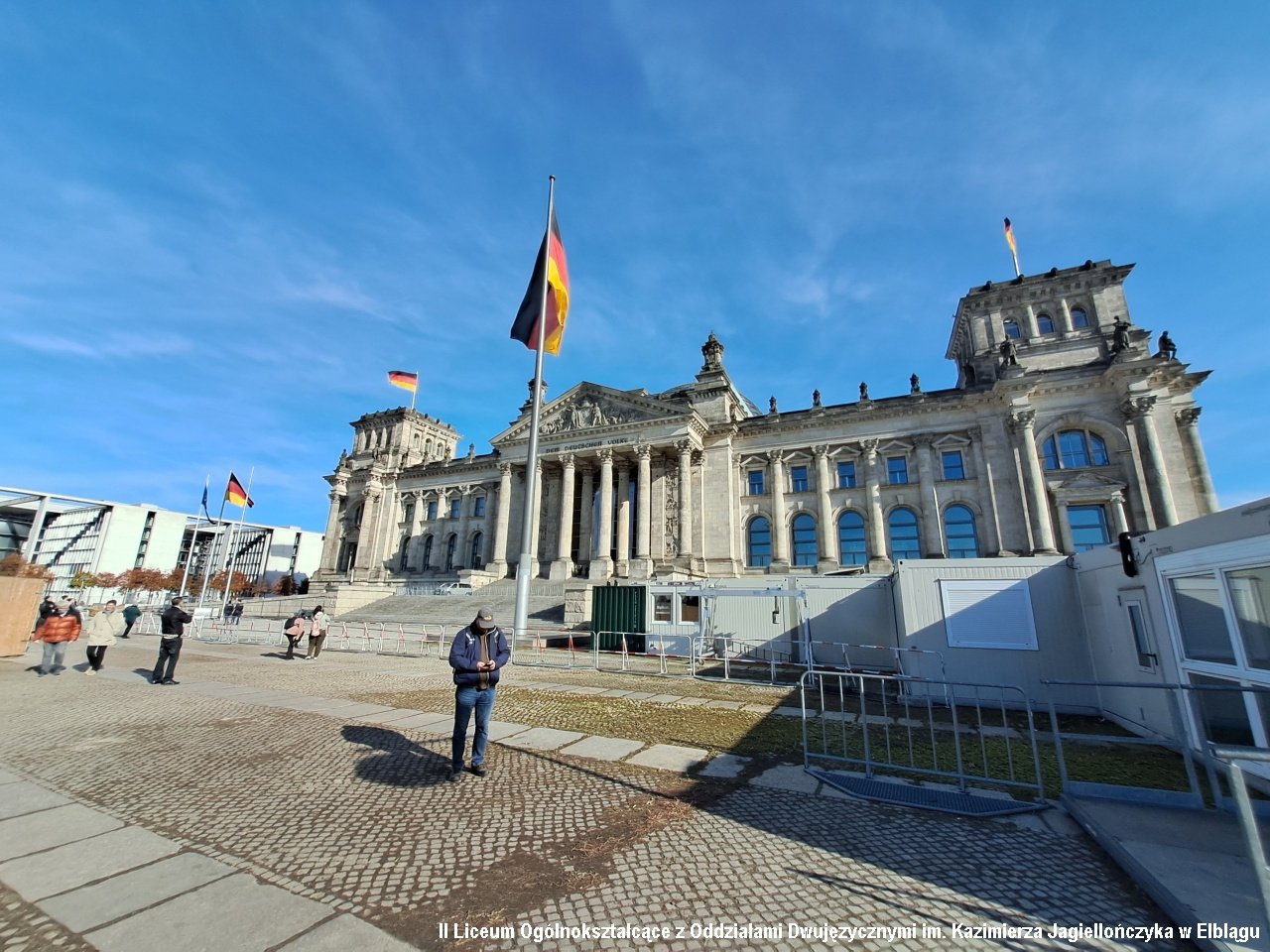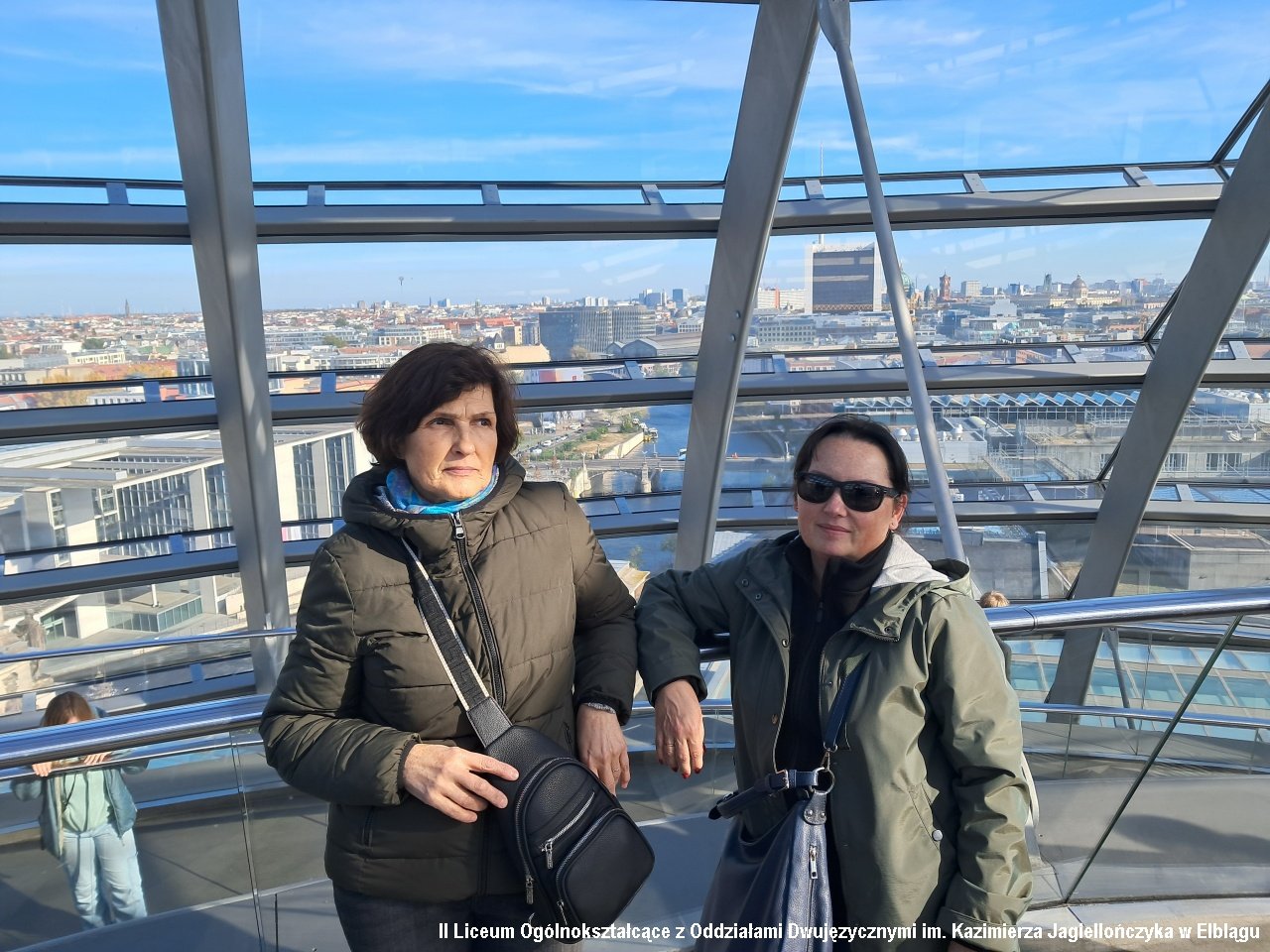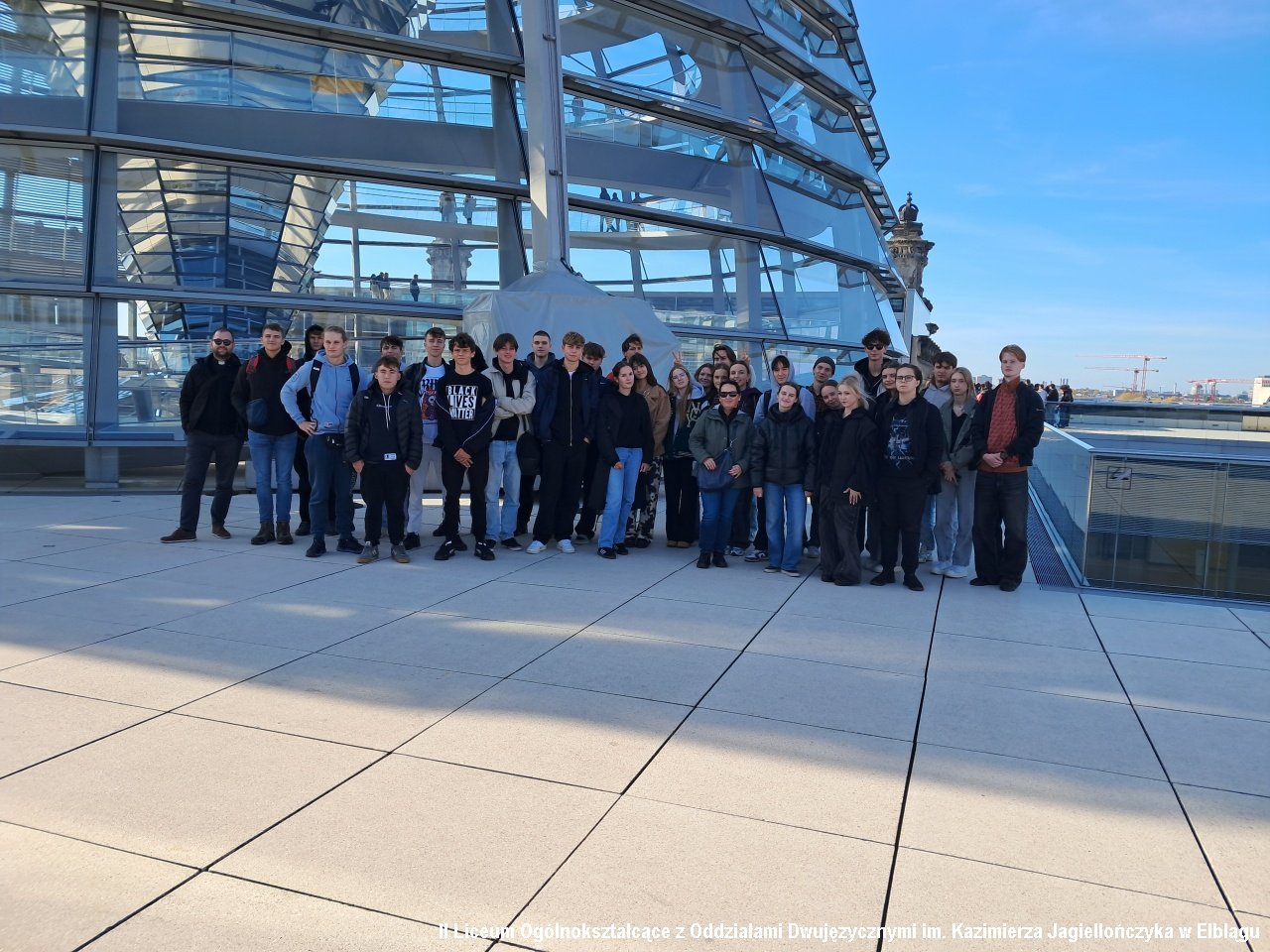 Drugiego dnia pojechaliśmy do Berlina. Pobyt w stolicy Niemiec rozpoczęliśmy od zwiedzania Muzeum Muru Berlińskiego. Poznaliśmy historię podziału miasta na strefy okupacyjne i działań zmierzających do jego obalenia. W muzeum widzieliśmy również ekspozycje poświęcone innym krajom zniewolonym komunizmem: Polsce, Węgrom czy Korei Północnej. Szczególnie ważna okazała się sala ukraińska, a w niej historia toczącej się na Ukrainie wojny. Po muzeum odwiedziliśmy słynny check point Charlie będący punktem kontrolnym pomiędzy radziecką a amerykańską strefą okupacyjną. Przeszliśmy Friedrichstrasse do Bramy Brandenburskiej, Tier Garten i pomnika ofiar holokaustu. Udaliśmy się także do Reichstagu i weszliśmy na kopułę budynku. Przez szklane ściany widzieliśmy obradujących parlamentarzystów, a w ich gronie kanclerza Niemiec Olafa Scholza.