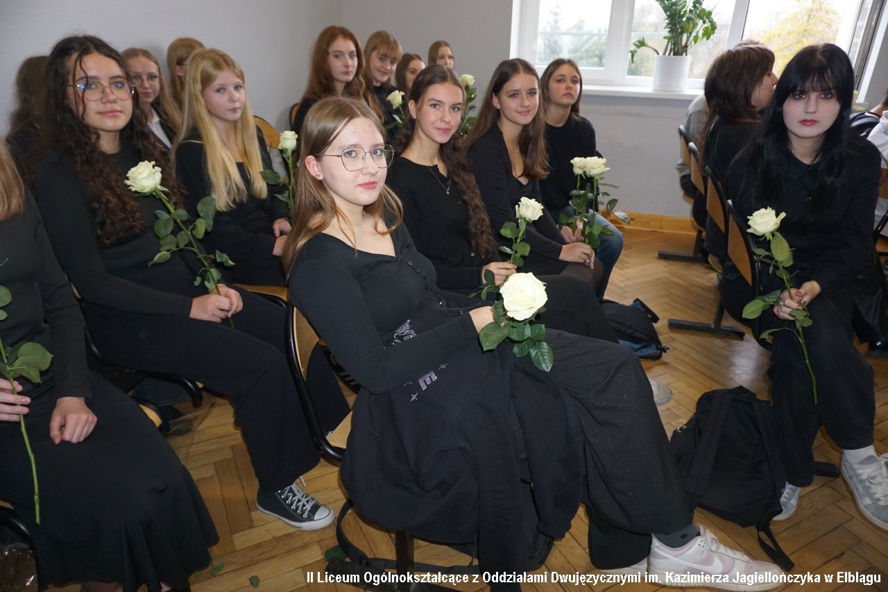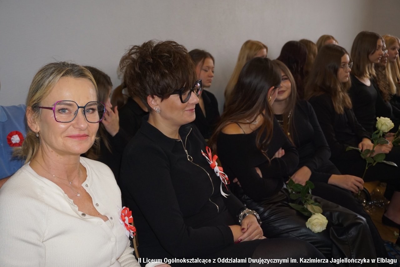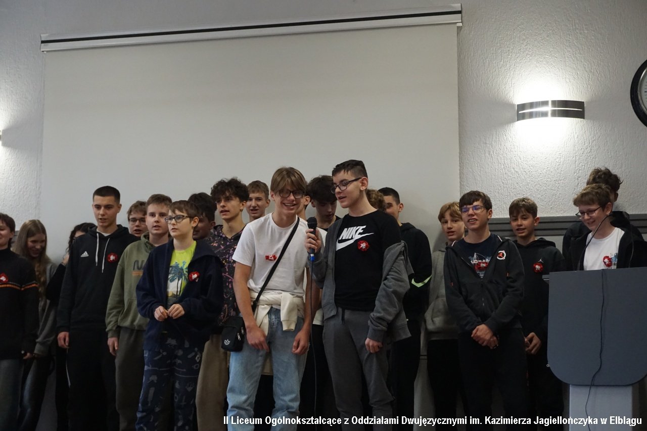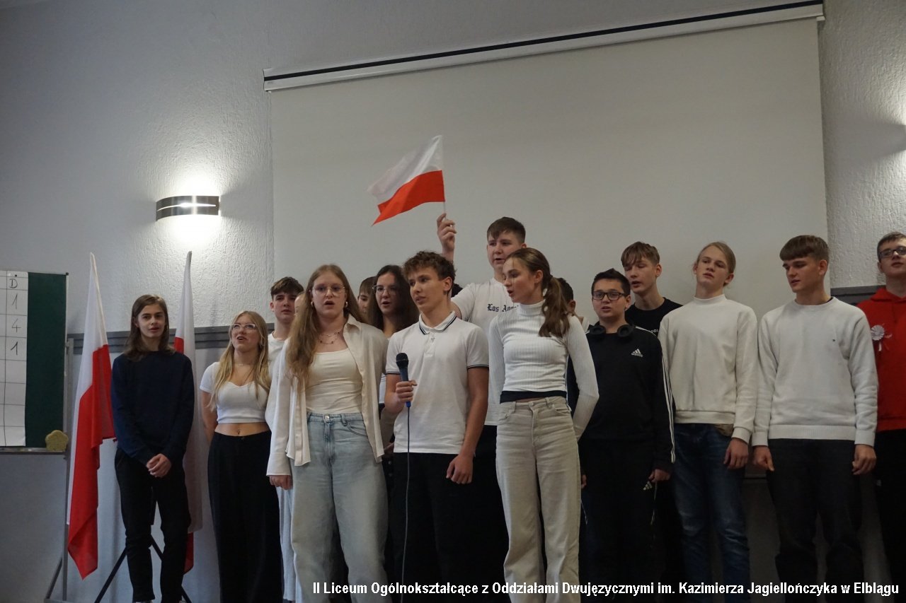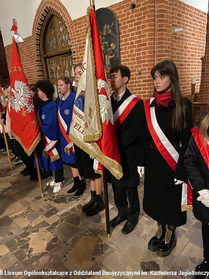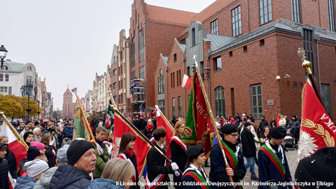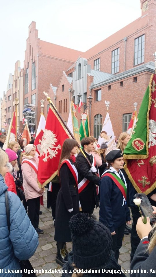 Jak co roku włączyliśmy się też w miejskie obchody święta. Poczet sztandarowy reprezentował II LO w uroczystej mszy św. w Katedrze św. Mikołaja, po której poczty przeszły przez starówkę pod Pomnik Twórców Niepodległości, gdzie odegrano hymn narodowy Mazurek Dąbrowskiego.