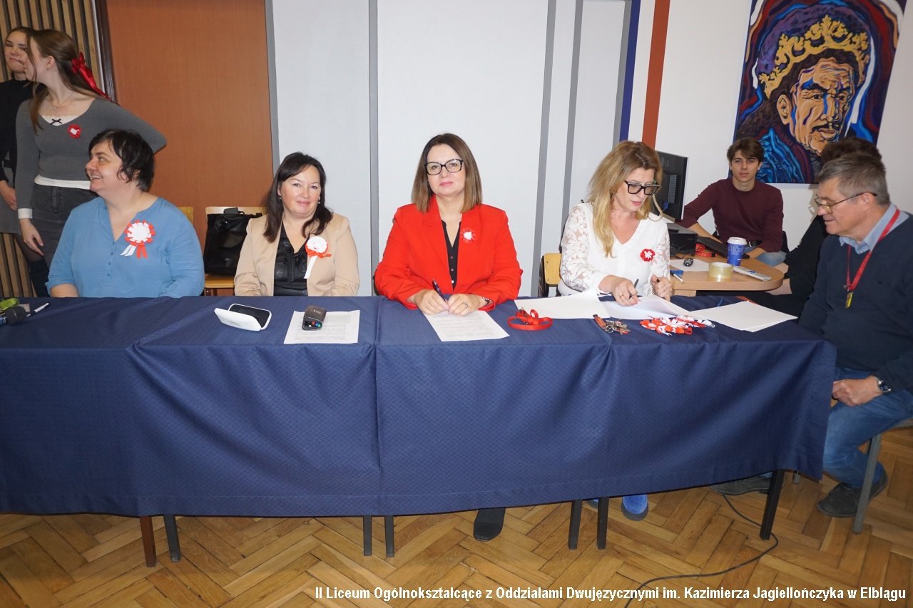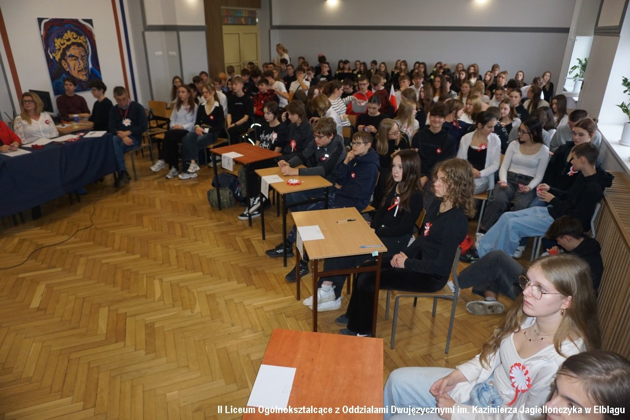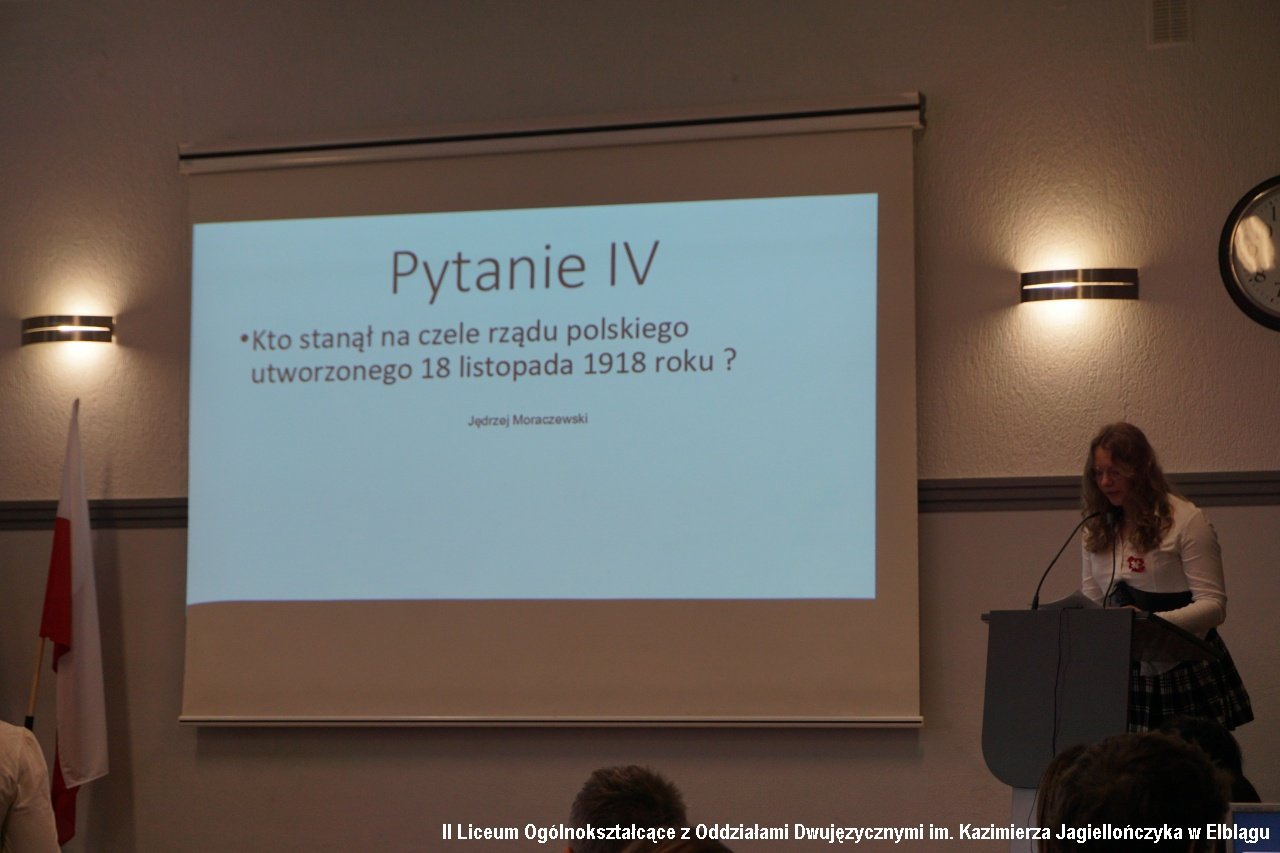 W piątek 8 listopada w zmaganiach historyczno-artystycznych udział wzięli uczniowie klas pierwszych naszej szkoły. Ich zmagania uczniów oceniało jury, w którego skład wchodzili: Pani Dyrektor Agnieszka Jurewicz, Pani Wicedyrektor Lidia Nawrocka, Pani Ewa Adamowicz, Pani Elżbieta Paprocka i Pan Zdzisław Wielgolaski. Przed przystąpieniem do turnieju zebrani w auli szkolnej nauczyciele i uczniowie mogli obejrzeć prezentację dotyczącą obchodów rocznic odzyskania niepodległości w przeszłości i aktualnie. Następnie dwuosobowe grupy z każdej klasy odpowiadały na pytania z zakresu historii, wybrani uczniowie recytowali wiersze o tematyce patriotycznej, a całe klasy wykonywały piosenki związane z tematyką narodowowyzwoleńczą.