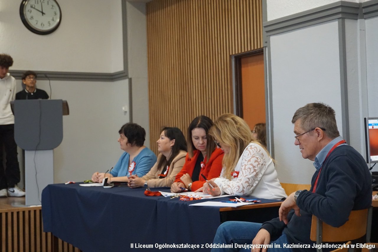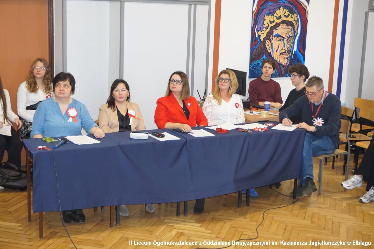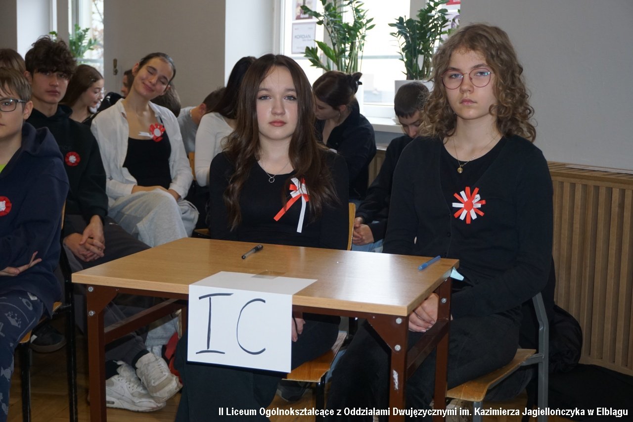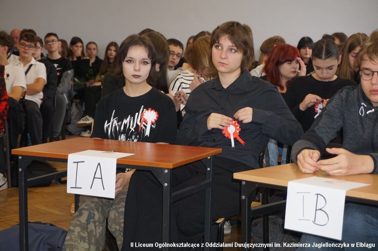 W piątek 8 listopada w zmaganiach historyczno-artystycznych udział wzięli uczniowie klas pierwszych naszej szkoły. Ich zmagania uczniów oceniało jury, w którego skład wchodzili: Pani Dyrektor Agnieszka Jurewicz, Pani Wicedyrektor Lidia Nawrocka, Pani Ewa Adamowicz, Pani Elżbieta Paprocka i Pan Zdzisław Wielgolaski. Przed przystąpieniem do turnieju zebrani w auli szkolnej nauczyciele i uczniowie mogli obejrzeć prezentację dotyczącą obchodów rocznic odzyskania niepodległości w przeszłości i aktualnie. Następnie dwuosobowe grupy z każdej klasy odpowiadały na pytania z zakresu historii, wybrani uczniowie recytowali wiersze o tematyce patriotycznej, a całe klasy wykonywały piosenki związane z tematyką narodowowyzwoleńczą.