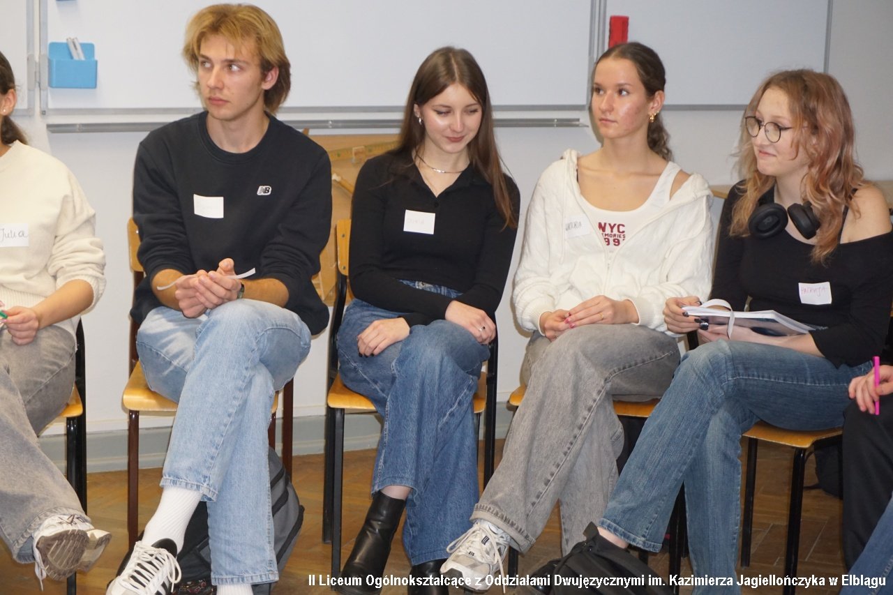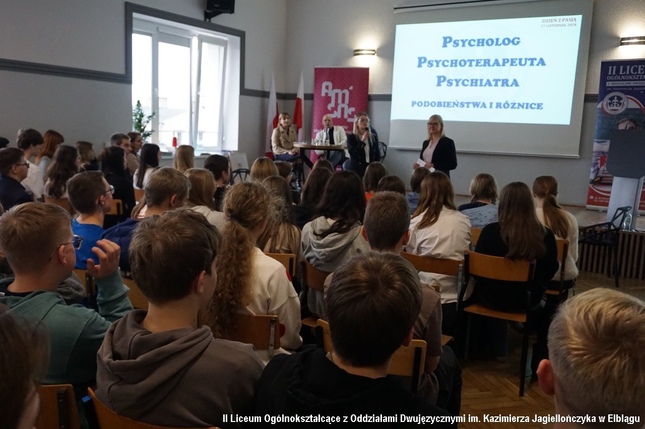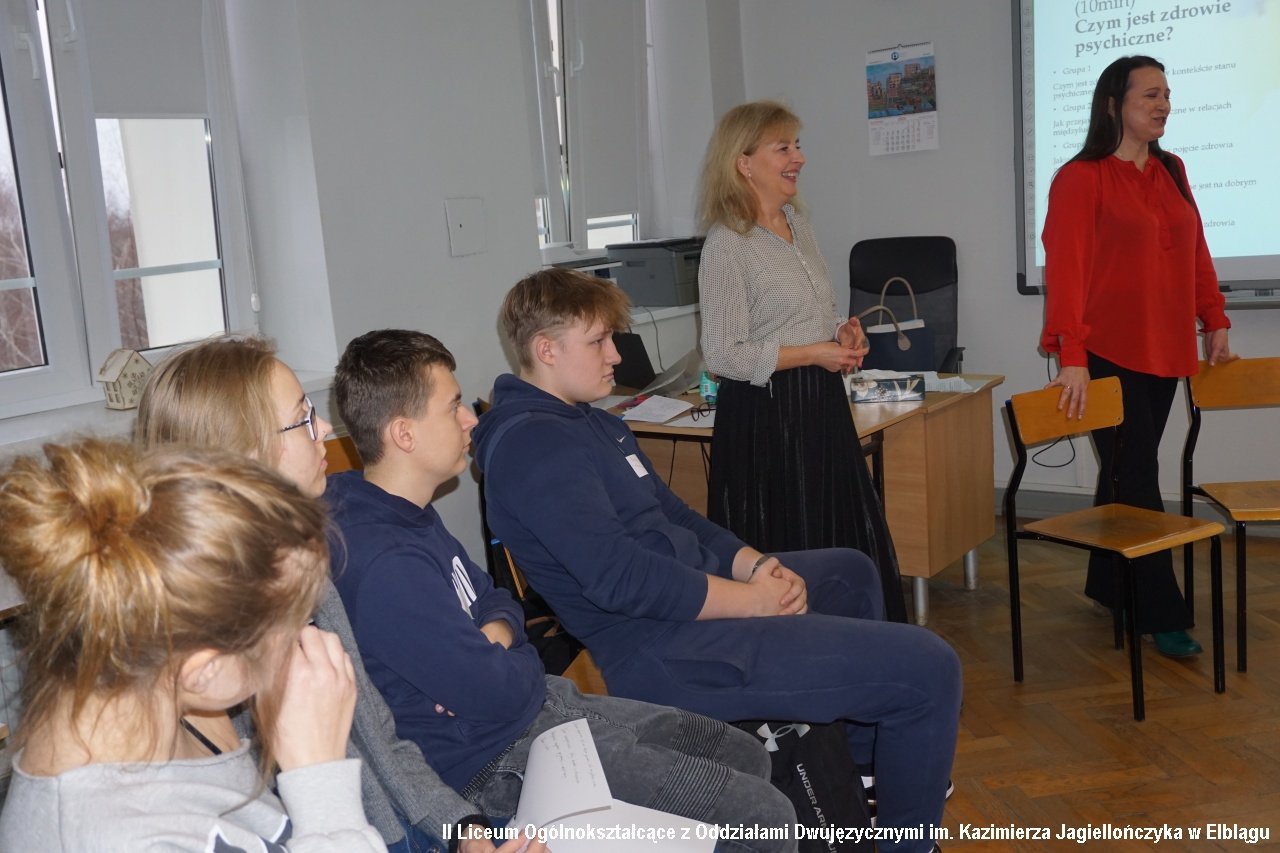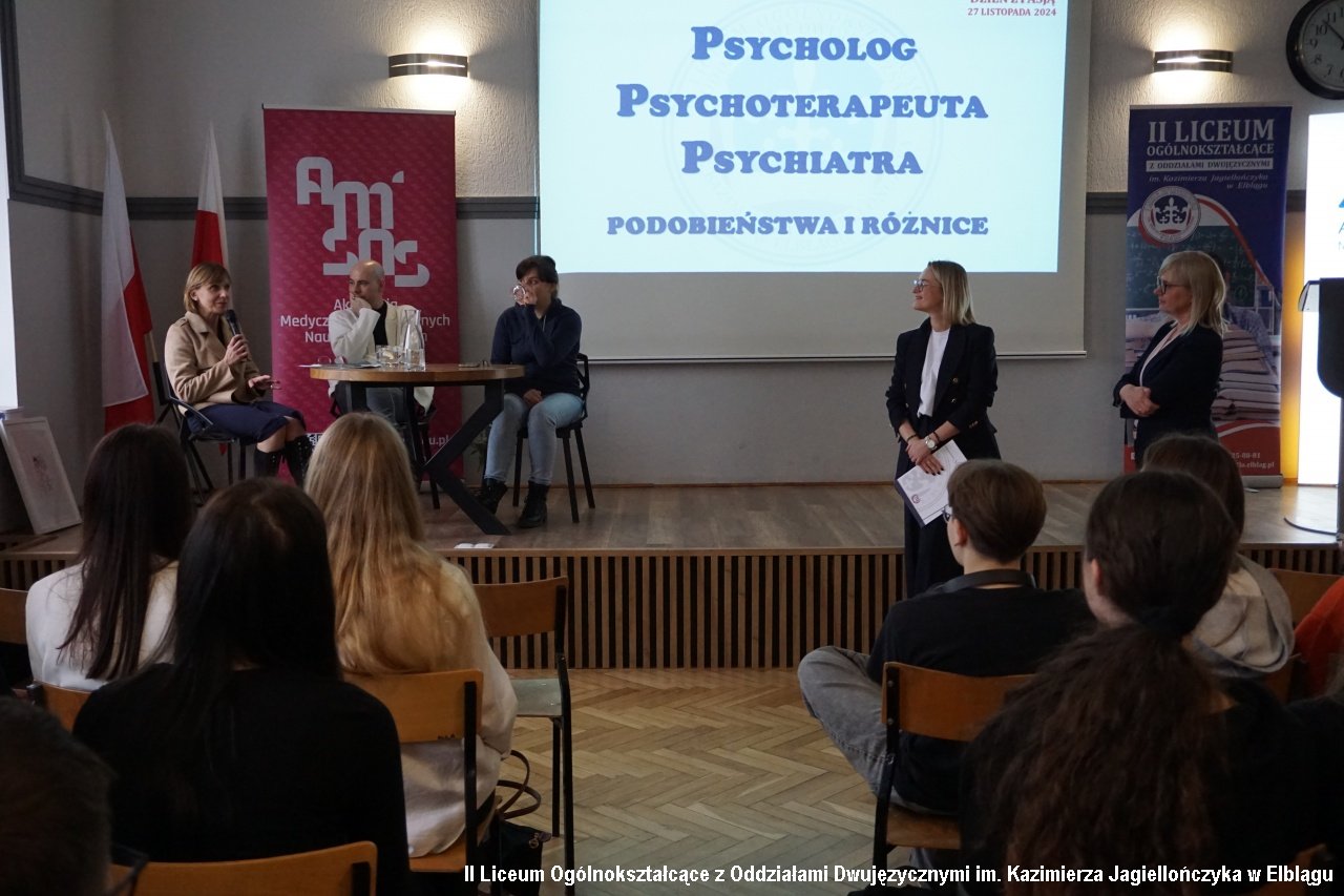 Klasy 1a, 2b, 2c oraz 3b wzięły udział w dyskusji panelowej przygotowanej i poprowadzonej przez zespół pedagogów i psychologów na temat "Psycholog-psychiatra-psychoterapeuta – różnice i podobieństwa". Uczniowie zadawali pytania, poruszali delikatne kwestie, na które otrzymywali szczegółowe odpowiedzi i wyjaśnienia. Dyskusję prowadziły Alicja Dobrzycka - pedagog IILO i Dorota Browarczyk - psycholog IILO. Odpowiedzi udzielali : psycholog dr Magdalena Gliniecka-Rękawik, lek. Agnieszka Paprocka oraz Michał Wojtala - psychoterapeuta i psychotraumatolog, specjalizujący się w problematyce zdrowia psychicznego, psychopatologii oraz diagnozie i terapii zaburzeń psychicznych. Dyskusję urozmaiciła prezentacja testów psychologicznych oraz prac plastycznych osób w terapii.