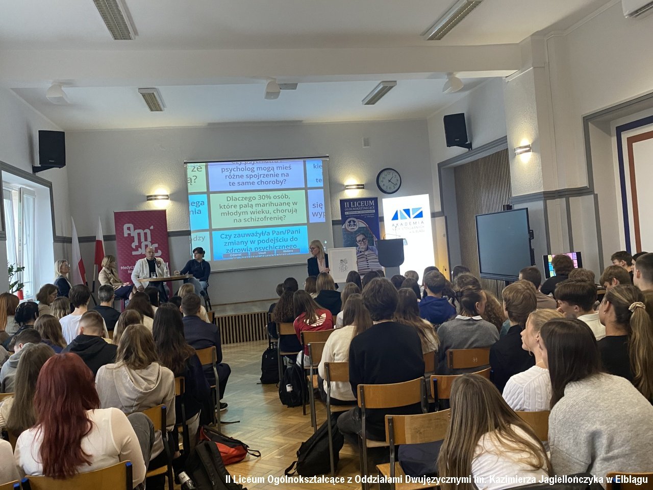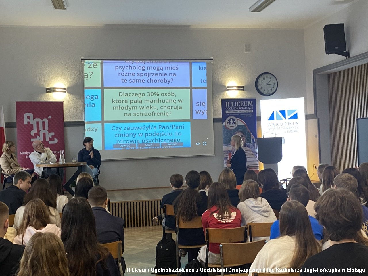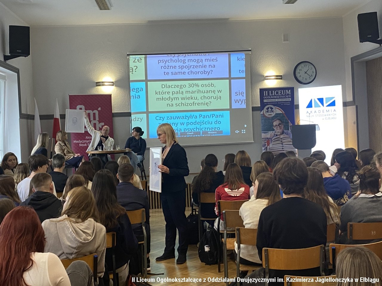 Klasy 1a, 2b, 2c oraz 3b wzięły udział w dyskusji panelowej przygotowanej i poprowadzonej przez zespół pedagogów i psychologów na temat "Psycholog-psychiatra-psychoterapeuta – różnice i podobieństwa". Uczniowie zadawali pytania, poruszali delikatne kwestie, na które otrzymywali szczegółowe odpowiedzi i wyjaśnienia. Dyskusję prowadziły Alicja Dobrzycka - pedagog IILO i Dorota Browarczyk - psycholog IILO. Odpowiedzi udzielali : psycholog dr Magdalena Gliniecka-Rękawik, lek. Agnieszka Paprocka oraz Michał Wojtala - psychoterapeuta i psychotraumatolog, specjalizujący się w problematyce zdrowia psychicznego, psychopatologii oraz diagnozie i terapii zaburzeń psychicznych. Dyskusję urozmaiciła prezentacja testów psychologicznych oraz prac plastycznych osób w terapii.