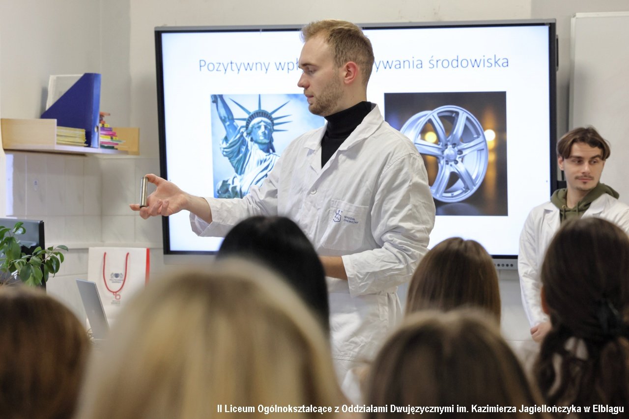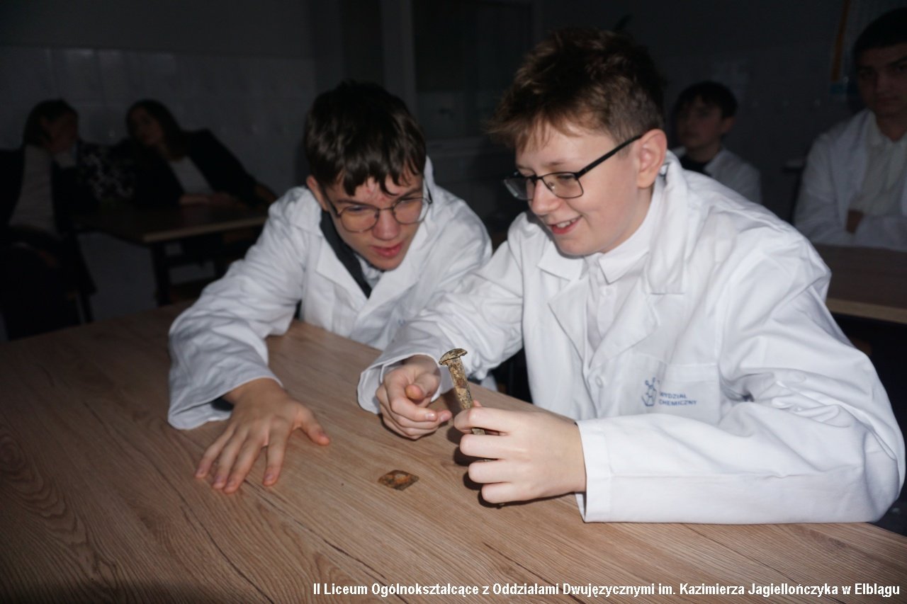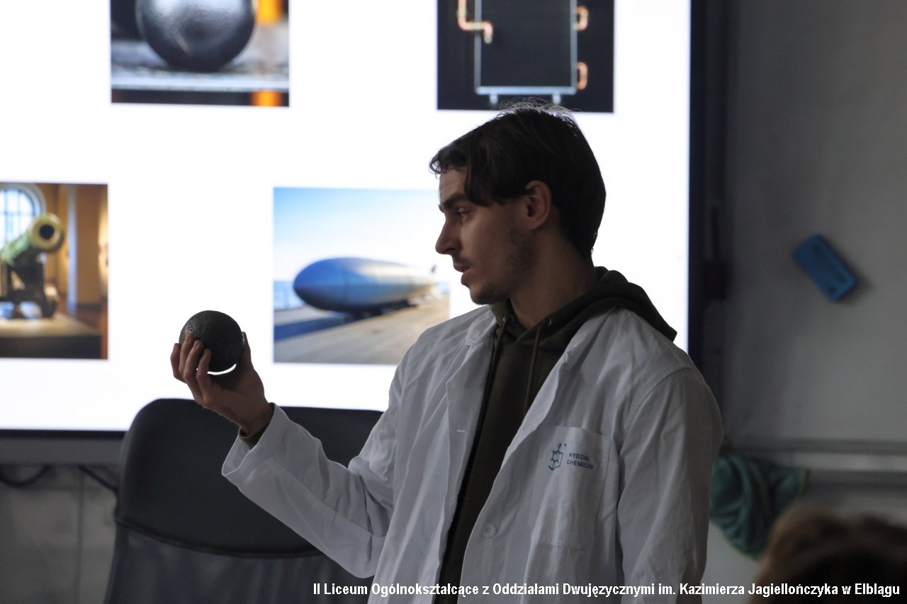 Zadbaliśmy również o cykl zajęć z obszarów przyrodniczych, zapraszając na spotkanie z klasami biologiczno-chemicznymi (1b i 1c) studentów Wydziału Chemicznego Politechniki Gdańskiej wraz z opiekunem Katarzyną Ogonowską z Katedry Korozji i Elektrochemii. Uczniowie mieli możliwość zobaczyć i doświadczyć jakie jest „Oddziaływanie środowiska na materiały konstrukcyjne”. Prowadzący przywieźli ze sobą rekwizyty – stare pociski, kule i elementy zbrojne odnalezione m.in. na dnie Bałtyku.