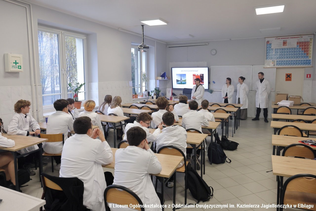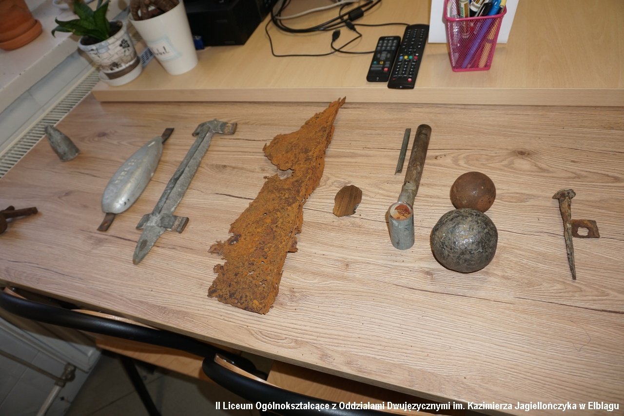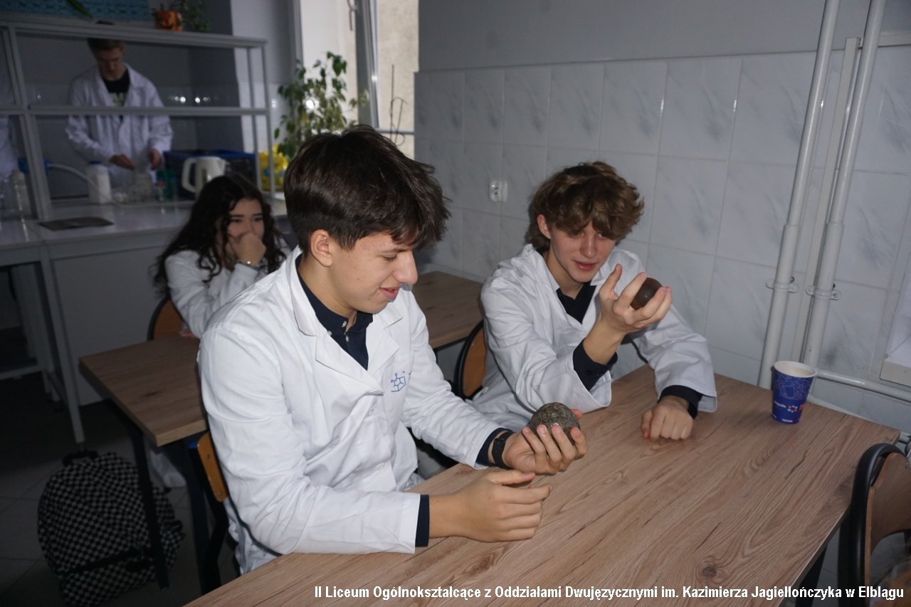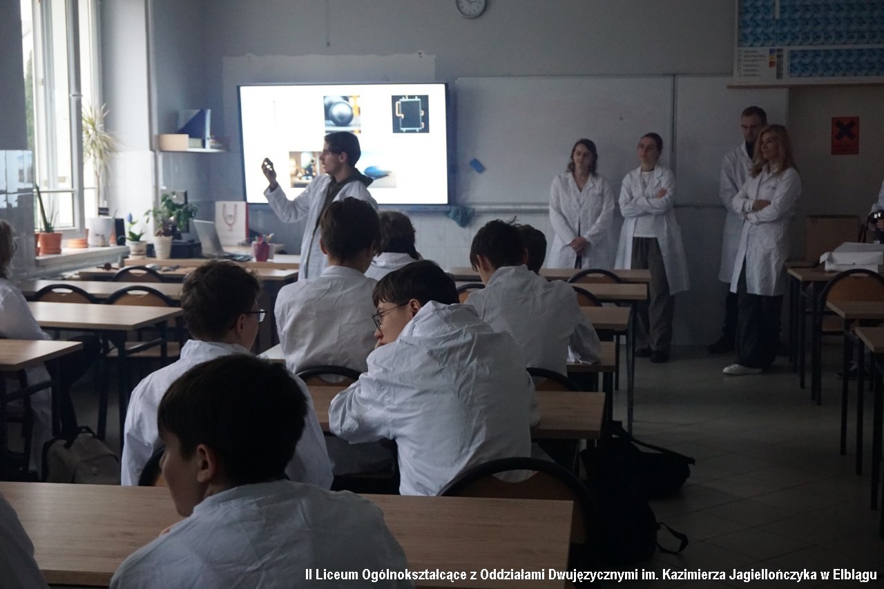 Zadbaliśmy również o cykl zajęć z obszarów przyrodniczych, zapraszając na spotkanie z klasami biologiczno-chemicznymi (1b i 1c) studentów Wydziału Chemicznego Politechniki Gdańskiej wraz z opiekunem Katarzyną Ogonowską z Katedry Korozji i Elektrochemii. Uczniowie mieli możliwość zobaczyć i doświadczyć jakie jest „Oddziaływanie środowiska na materiały konstrukcyjne”. Prowadzący przywieźli ze sobą rekwizyty – stare pociski, kule i elementy zbrojne odnalezione m.in. na dnie Bałtyku.