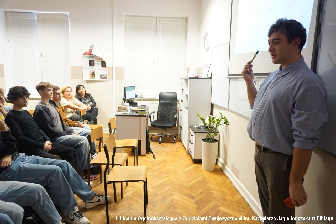 Pan Paweł Gliniewicz spotkał się z klasami biznesowymi 1d i 3d i omawiał kwestię "3xW, czyli wellbeing, wellness oraz work-life balance w biznesie".