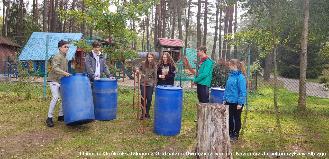 BUDOWA TRATWY Z BECZEK- zadanie konstrukcyjne. Zostaliśmy podzieleni na zespoły. Zadaniem każdego z zespołów było zbudowanie tratwy i przeprawa na drugą stronę kąpieliska. Tratwę budować można było tylko z przekazanych drużynom materiałów: beczek, linek, żerdzi.