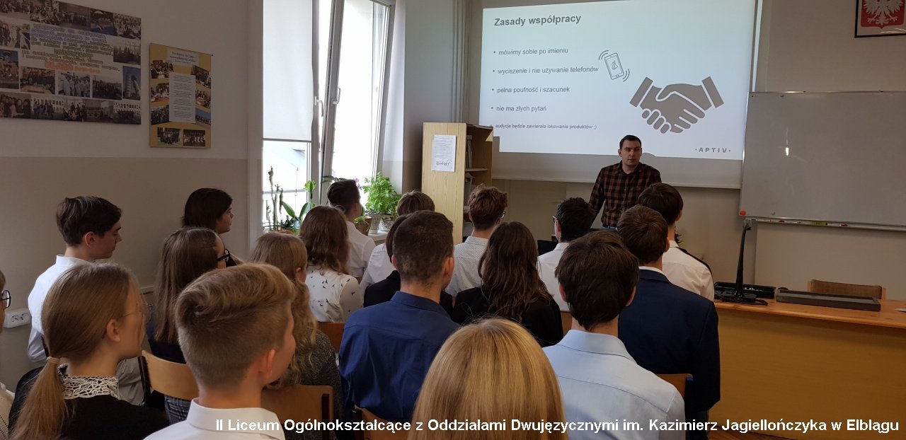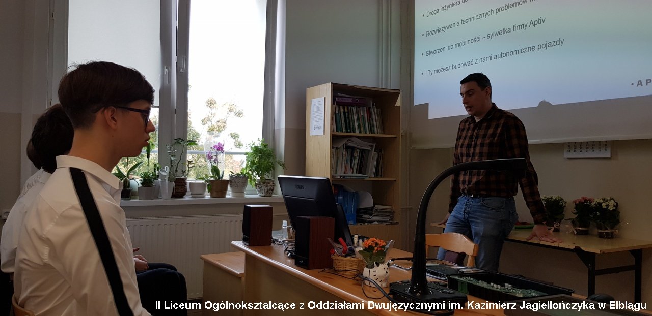Klasy politechniczne rozpoczęły „Dzień z Pasją” spotkaniem pt.„Droga do autonomiczności” z panem Grzegorzem Wydmańskim – szefem działu inżynieryjnego firmy Aptiv w Gdańsku. Samochody bez kierowcy? Tak, już za kilka lat. Ale co jeszcze jest do zrobienia w tej kwestii, z czym inżynierowie muszą się zmierzyć, jaka jest skala określania samojezdności auta, czym zajmuje się firma Aptiv? Na te i inne pytania młodzież otrzymywała skrupulatne odpowiedzi. Jedno jest pewne – świat zmienia się na naszych oczach, a technika postępuje bardzo szybko.Julia Włodarczak wraz z uczniami klasy IE tak skomentowała zajęcia: „Dowiedzieliśmy się na czym polega praca inżyniera w firmie. Mogliśmy przyjrzeć się elementom pojazdu autonomicznego. To całkiem nowe informacje.”
