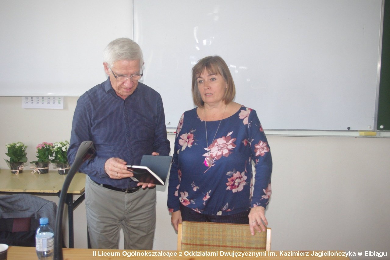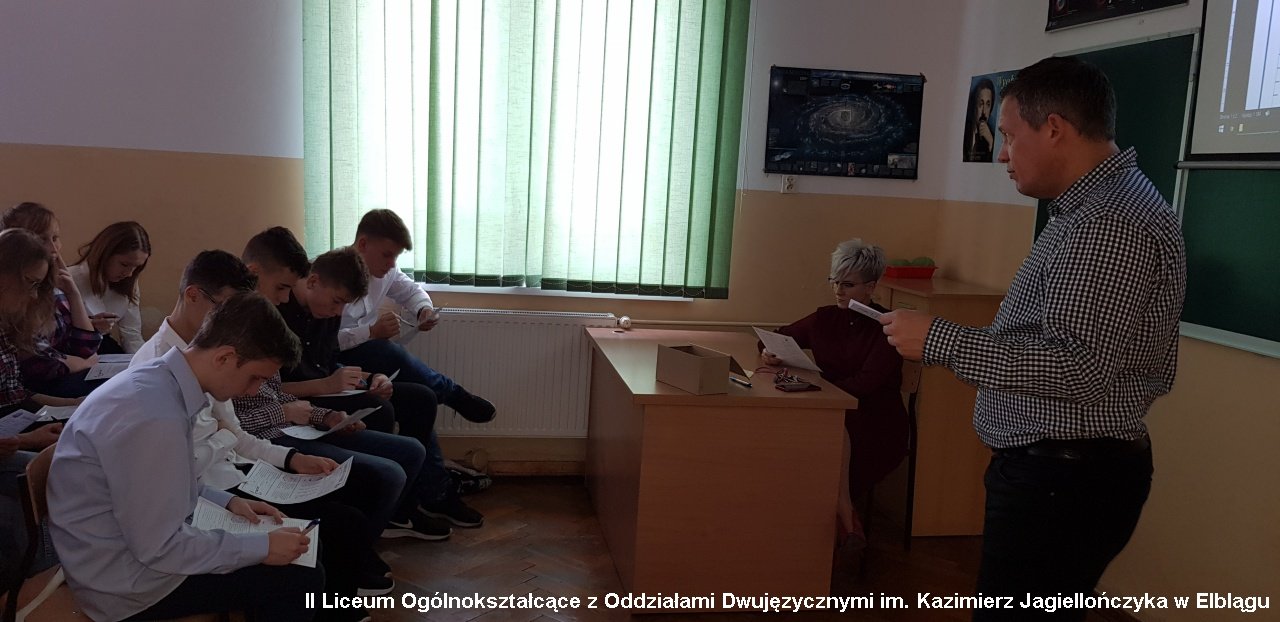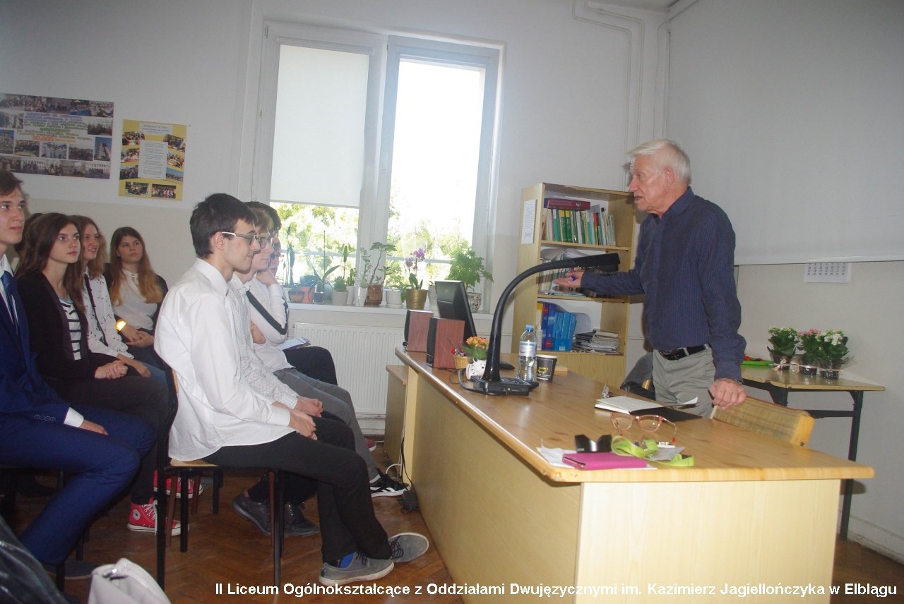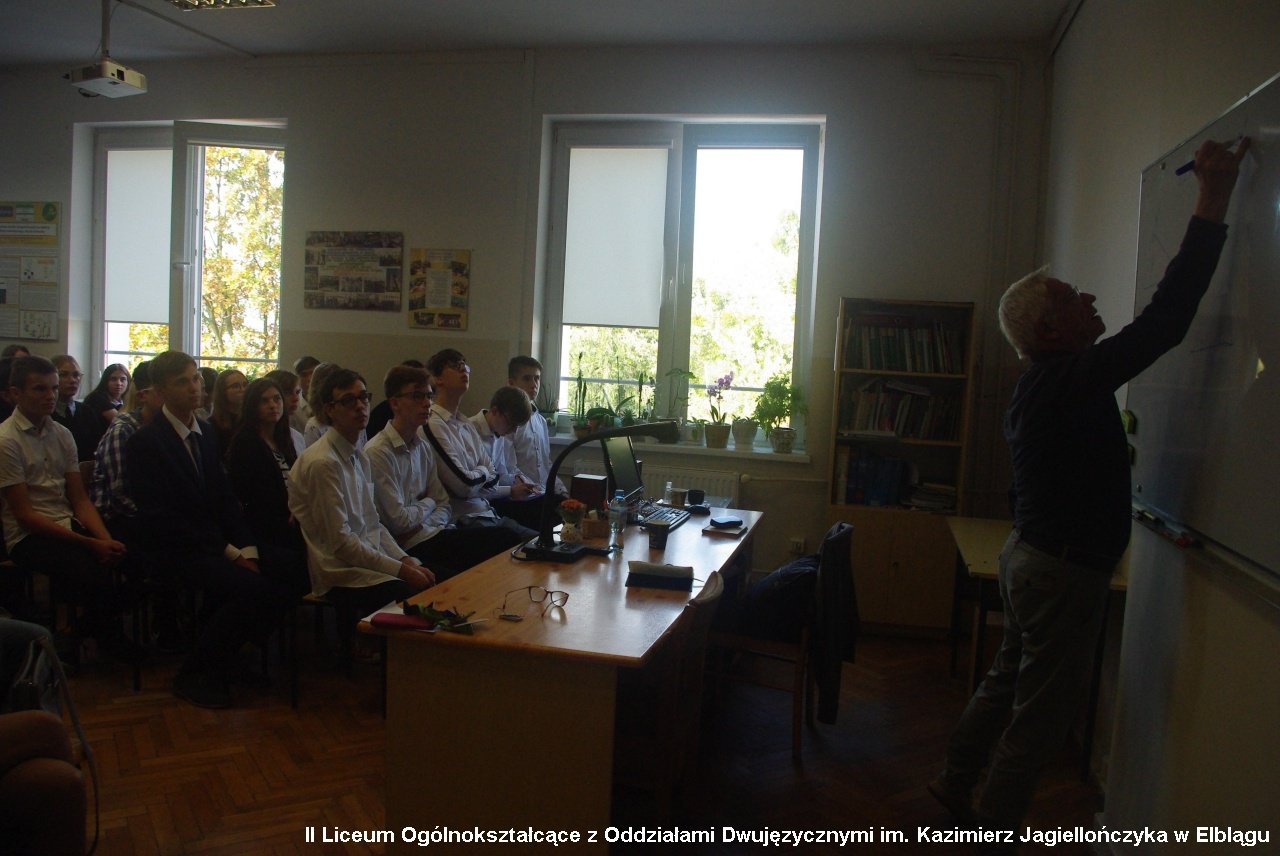 Na zakończenie wartki wykład „Wstęp do matematyki” prof. dr hab. Michaiła Borsuka z Wydziału Matematyki i Statystyki UWM. Spotkanie rozpoczęło się matematycznym fortelem. Słuchacze mieli obliczyć w pamięci pole trójkąta o pewnych wymiarach. Obliczeń dokonano sprawnie i szybko. Okazało się jednak, że taki trójkąt nie istnieje, więc zadanie nie ma rozwiązania. Profesor z charyzmą matematyczną pisał po tablicy i zapoznawał uczniów z dwoma metodami dowodzenia: metodą ” nie wprost” oraz indukcji matematycznej. Zwrócił uwagę na istotę rozwiązywalności zadania i na ilość jego rozwiązań. „Wykład pana Borsuka zaciekawił wszystkich. Był to temat dla nas zupełnie nowy, słuchaliśmy go w skupieniu, notując cały czas. Tablicę zalewały „fale cyfr i liter”, które wcześniej niezrozumiałe z każdą minutą nabierały większego sensu.”-Klaudia z kl.Ie
