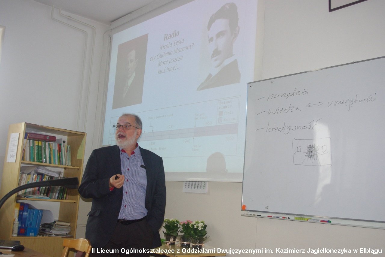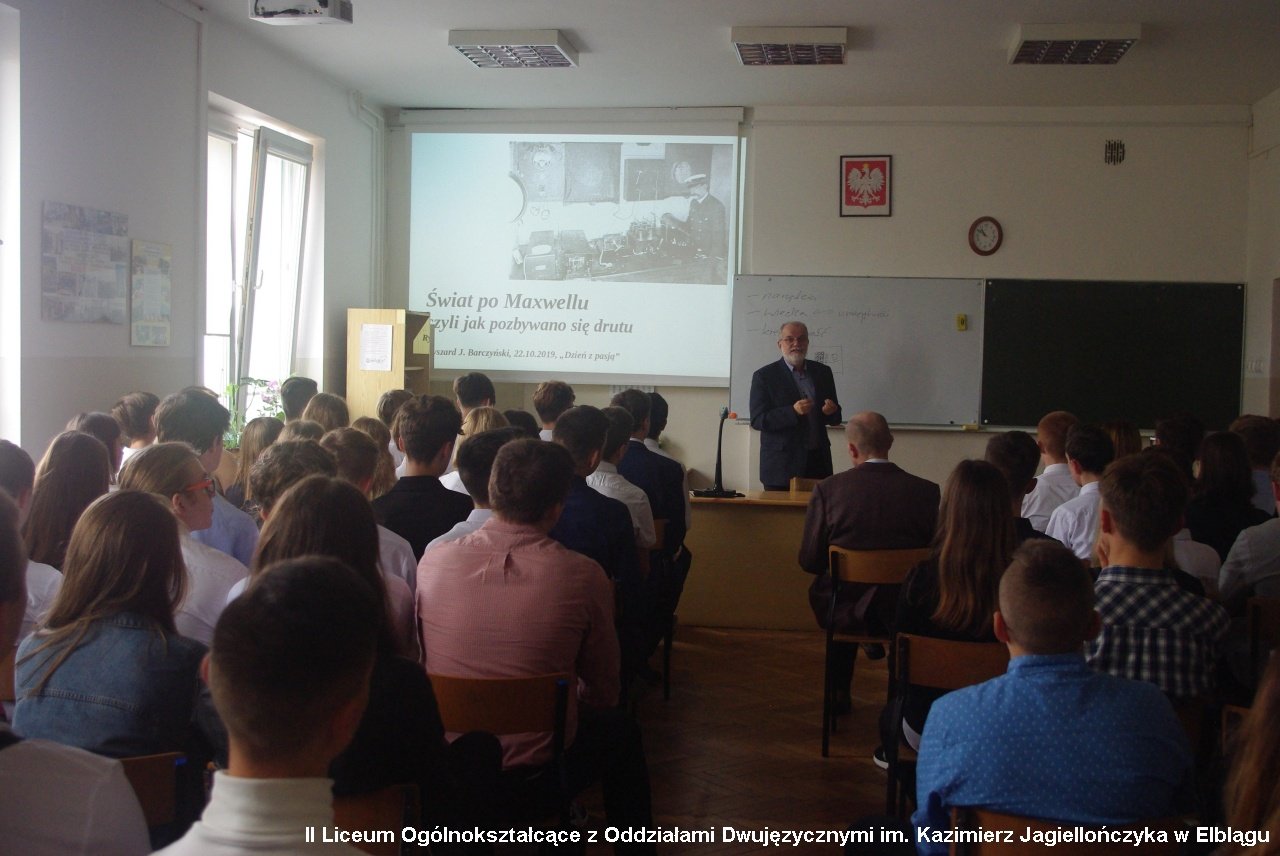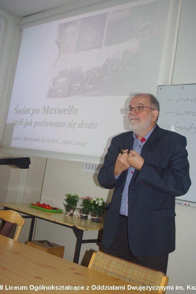 Potem zajęcia „Świat po równaniach Maxwella, czyli jak pozbywano się drutu”. Poprowadził je pasjonat fizyki dr hab. inż. Ryszard Jan Barczyński z Wydziału Fizyki Technicznej i Matematyki Stosowanej Politechniki Gdańskiej. Prelegent przedstawił historię narodzin radiokomunikacji na przełomie wieku XIX i XX. Pokazane zostały zawiłe drogi prowadzące do dzisiejszych zdobyczy techniki. Wykład obejmował zagadnienia teoretyczne będące podstawą emisji fal radiowych i problemy techniczne towarzyszące praktycznym realizacjom. Nie brakowało informacji o skomplikowanych ludzkich losach ojców radiofonii. Mieliśmy możliwość posłuchania o aspektach ekonomicznych tych przełomowych wynalazków. Wiktor, uczeń klasy IE tak skomentował zajęcia ”To był pokaz historii przekazywania informacji radiem z zupełnie innej strony, niż mogliśmy się tego spodziewać. Udowodnił również, że nic nie jest czarno-białe, że należy unikać dychotomicznego myślenia”