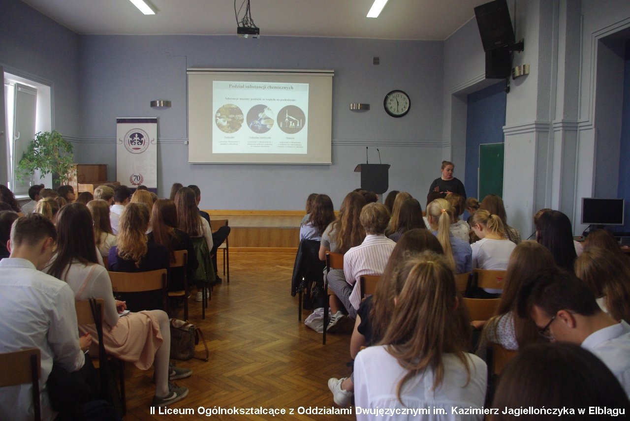 Klasy medyczne otrzymały solidną dawkę zajęć z pasją… Wykład z chemii pt.”Chemia natury czyli o zastosowaniu związków naturalnych” poprowadziła (tradycyjnie już) nasza absolwentka dr Marta Orlikowska, pracownik naukowy Wydziału Chemicznego na Uniwersytecie Gdańskim. Dr Orlikowska przedstawiła związki organiczne, z którymi mamy do czynienia w naszym życiu codziennym: w lekach, żywności i kosmetykach. Uczniowie klas pierwszych mogli się zobaczyć, jak bardzo świat nauki przenika w codzienne życie. Co z czym łączyć w naszej diecie, czego unikać, dlaczego ten sam związek ma różne zapachy, dlaczego niektóre leki mogą stać się szkodliwe- to tylko niewielki fragment prezentacji. Takie pytania można mnożyć i być może już teraz uważni słuchacze przekonali się do samodzielnych poszukiwań. W końcu o to chodzi: żeby zainspirować!