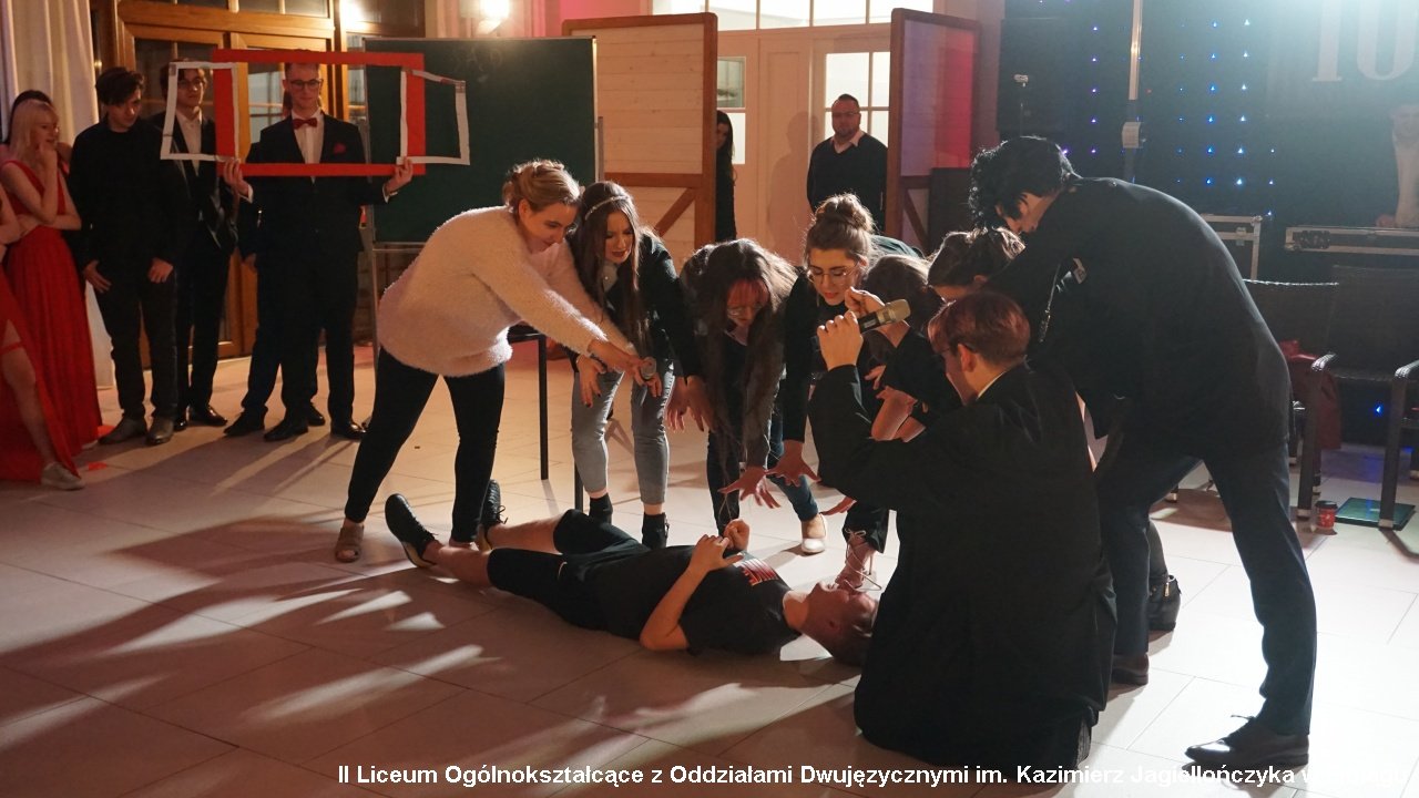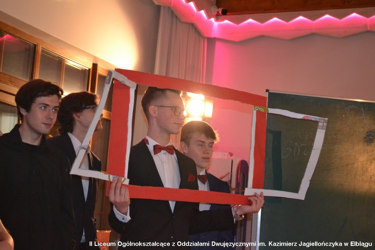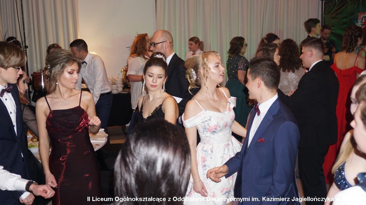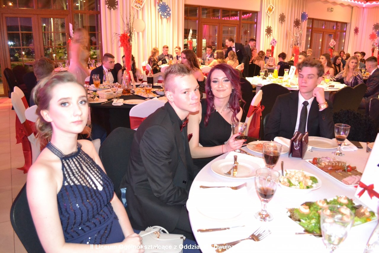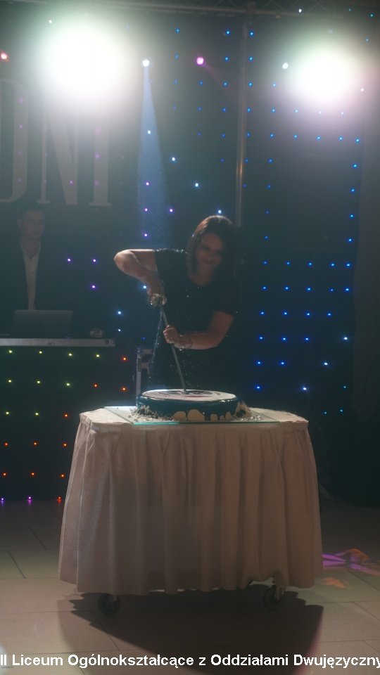 Wspólny taniec przerywały tylko momenty na wspólne fotografie , zabawa przed fotobudką. Porcję dobrego humoru dostarczył kabaret studniówkowy przygotowany pod kierunkiem pana Bogusława Walewskiego. Tradycyjnie, dokładnie o północy, na sali pojawił się wyśmienity tort, którego uroczyście i z rozmachem pokroiła pani dyrektor !